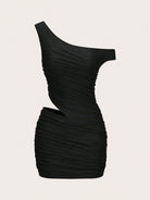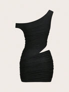 ICON Y2k Women Pleated Fitted Asymmetrical Collar Cut-Out Waist Black Sexy Party Dress Graduation