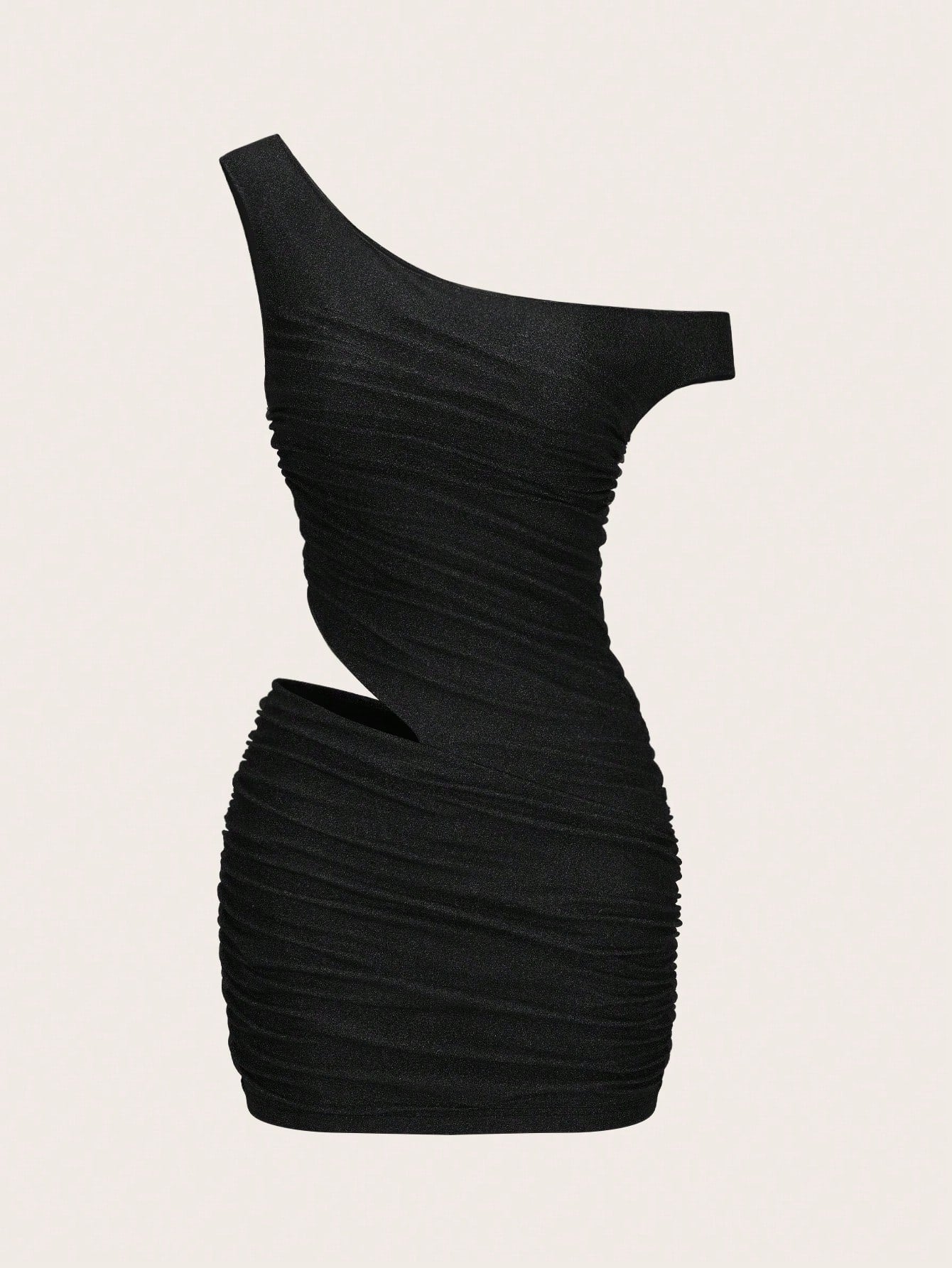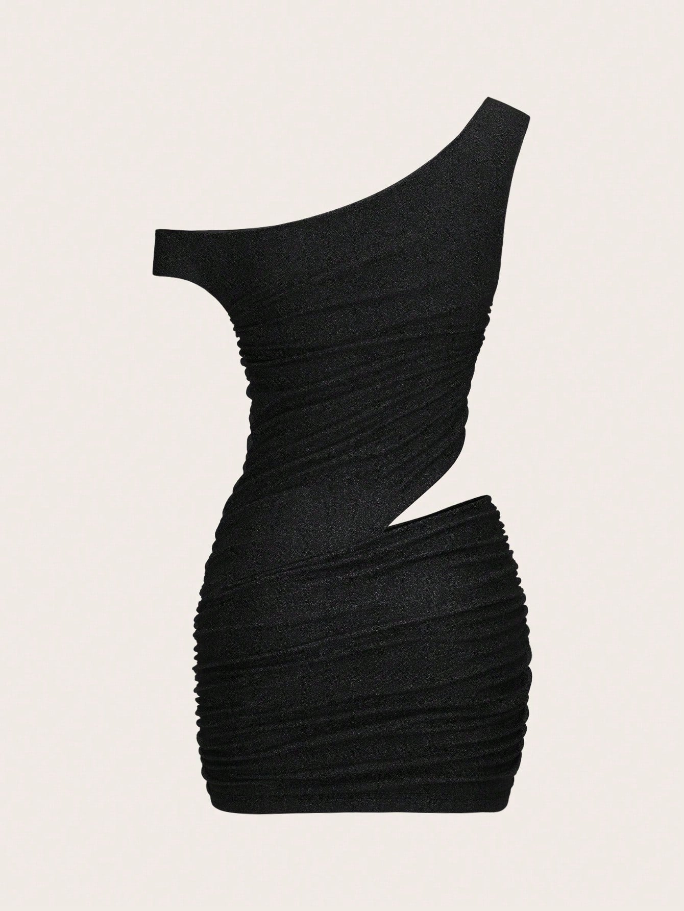 فستان حفلات التخرج النسائي من ICON Y2k ذو طيات وياقة غير متماثلة وخصر مفتوح باللون الأسود مثير