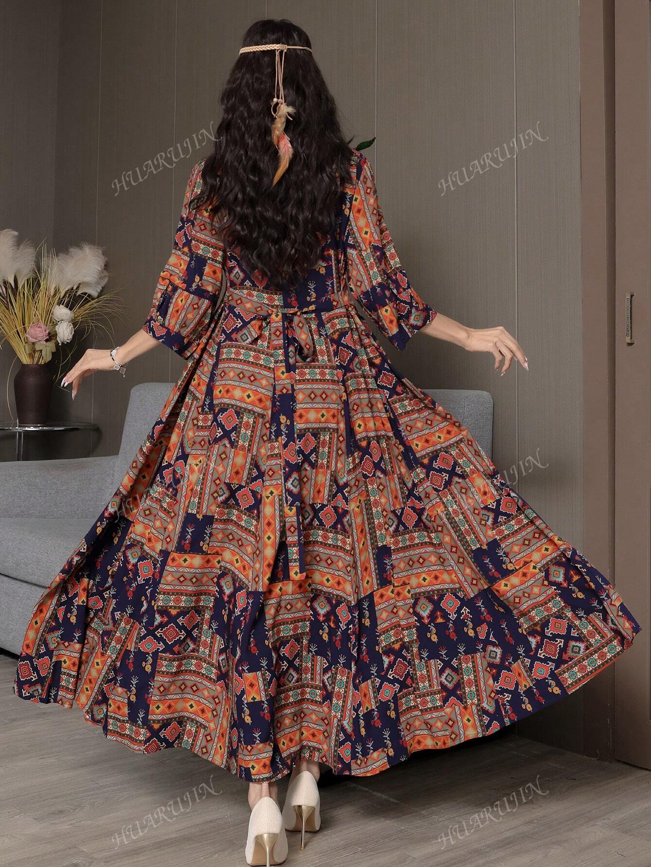 فستان ماكسي للعطلات، عربي، ترفيهي، بوهيمي، تطريز، أدبي، كلاسيكي، مناسب للعطلات، محتشم