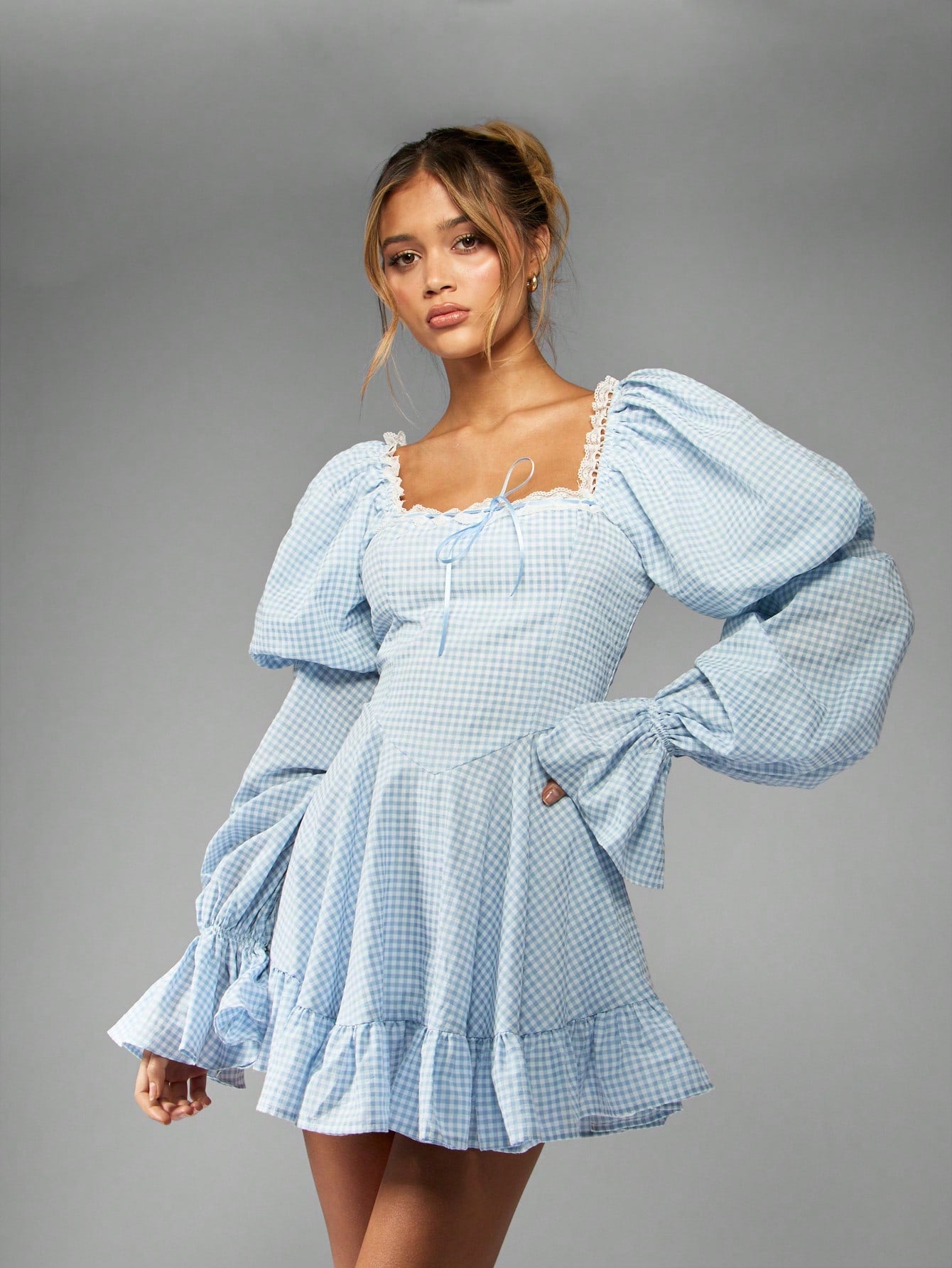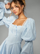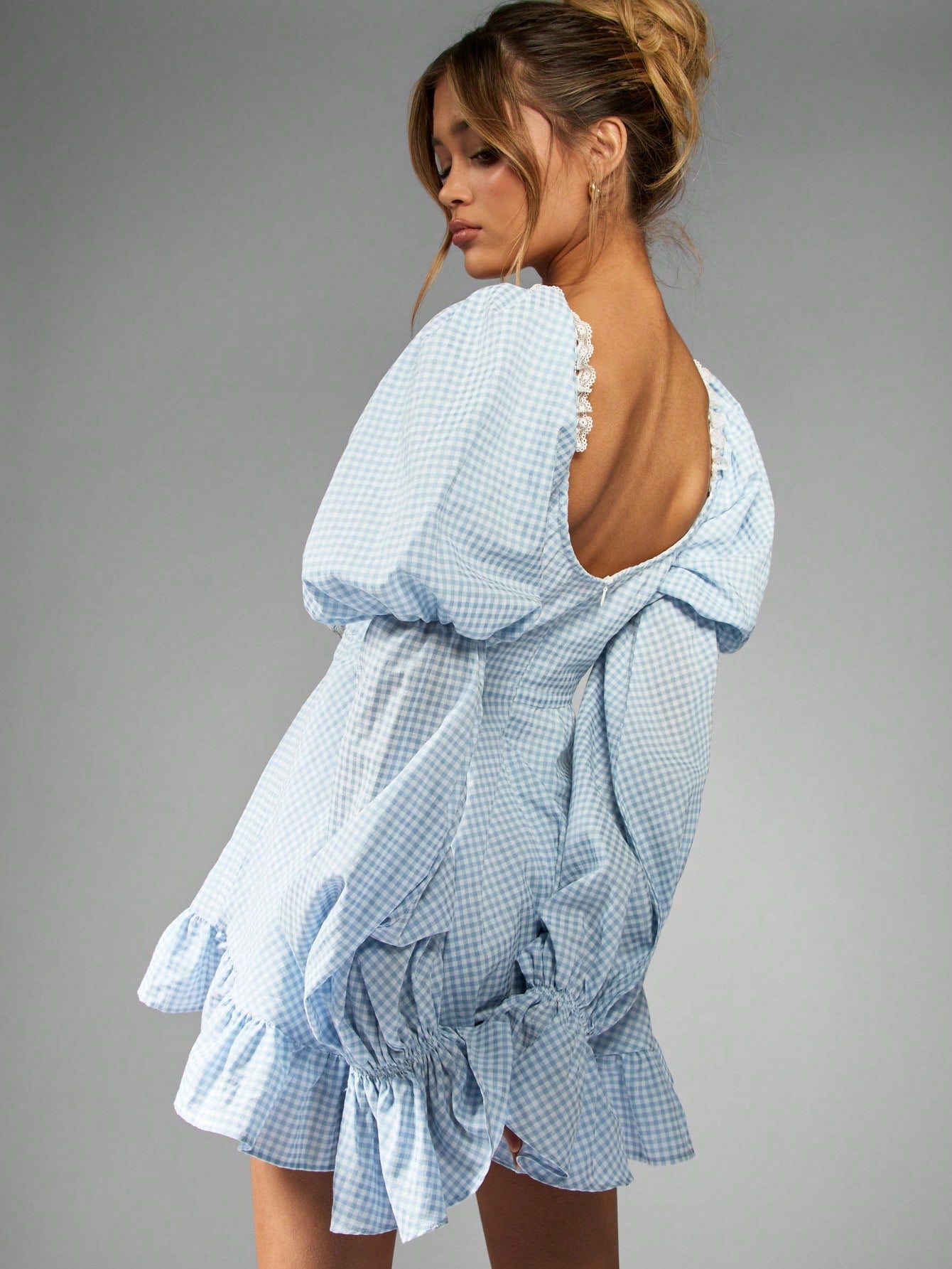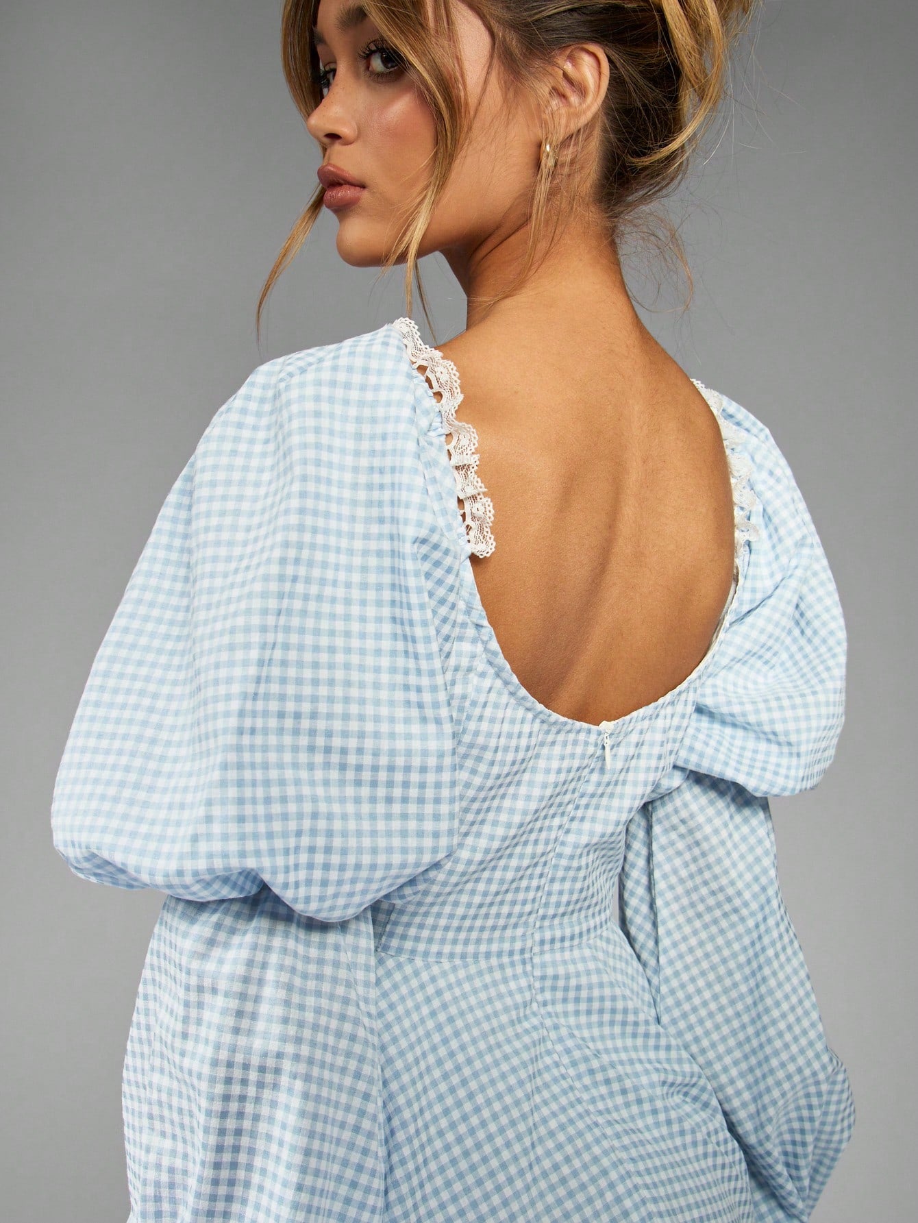 MISSGUIDED Milkmaid Puff Sleeve Mini Dress With Lace Trim Square Neck Ruffle Hem Gingham Skater Spring
