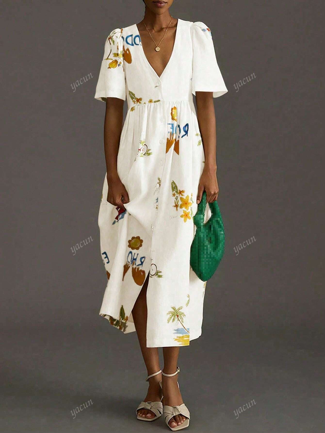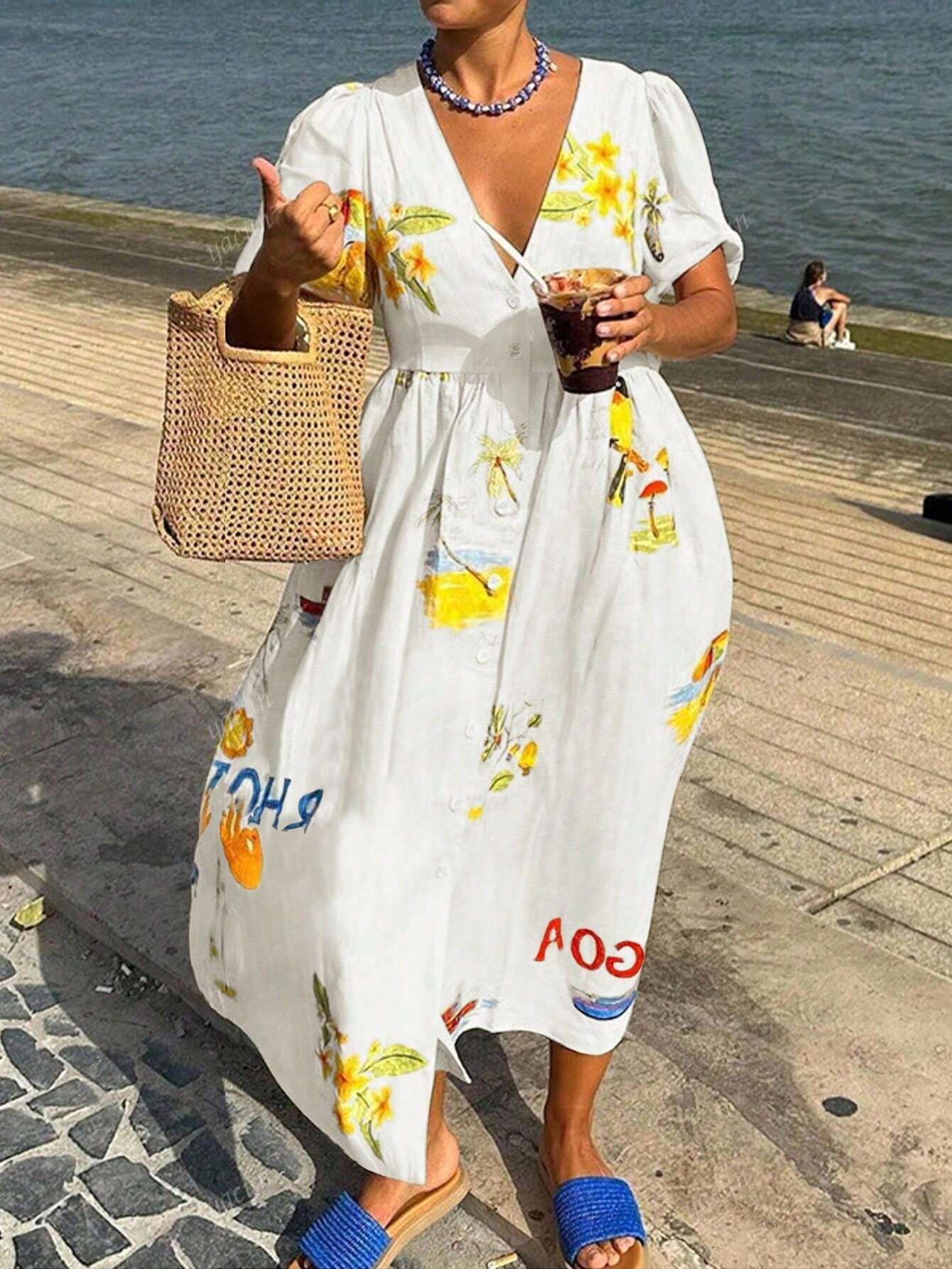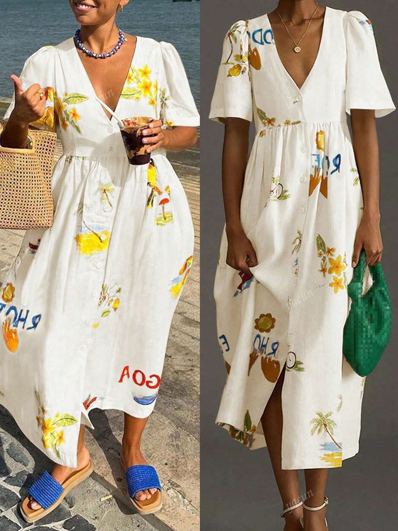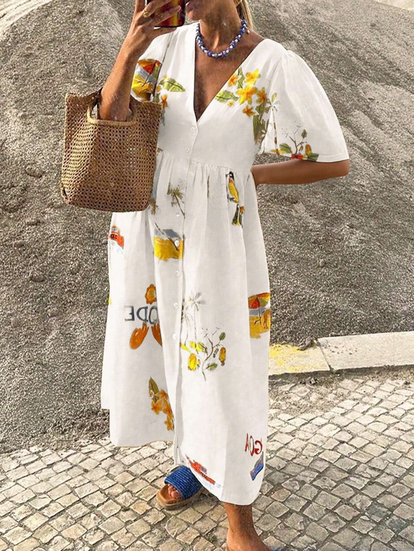 New Spring/Summer Fashion Random Floral Print V-Neck Loose Fit Bubble Short Sleeve Dress For Women, Boho