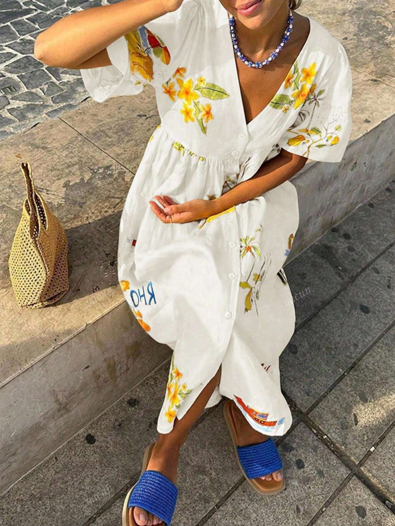 فستان نسائي فضفاض بأكمام قصيرة ورقبة على شكل حرف V بطبعة زهور عشوائية، ربيع/صيف جديد، بوهو