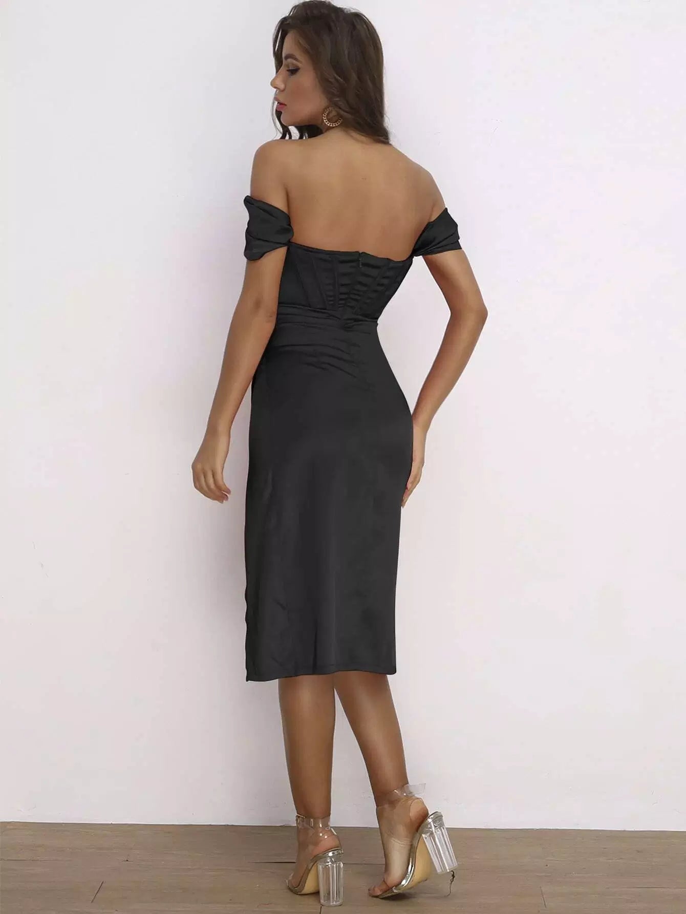 فستان من الساتان بحافة ملفوفة من الساتان مكشوف الكتفين