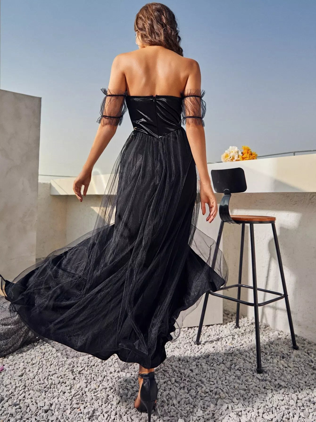 فستان مكشوف الأكتاف مقسم على الفخذين بطبقة شبكية متراكبة