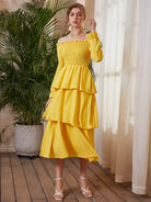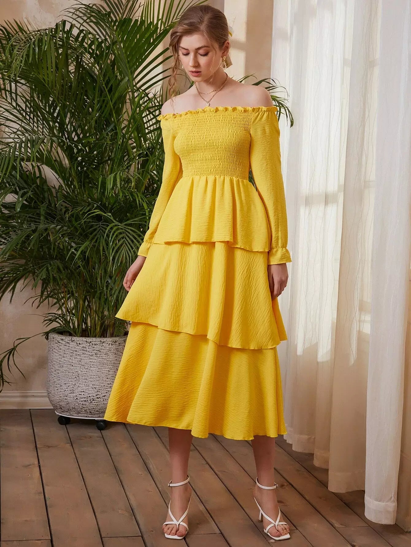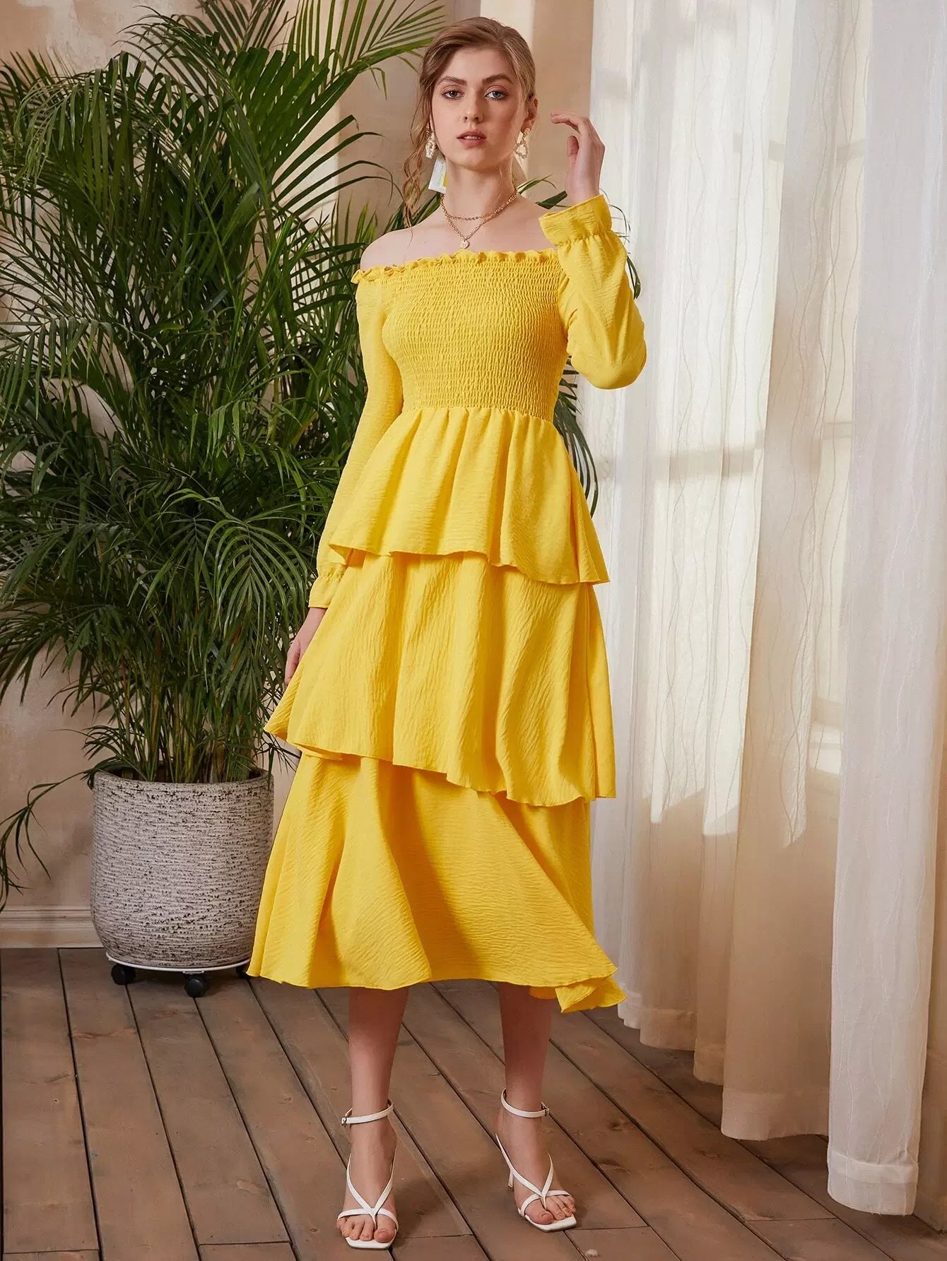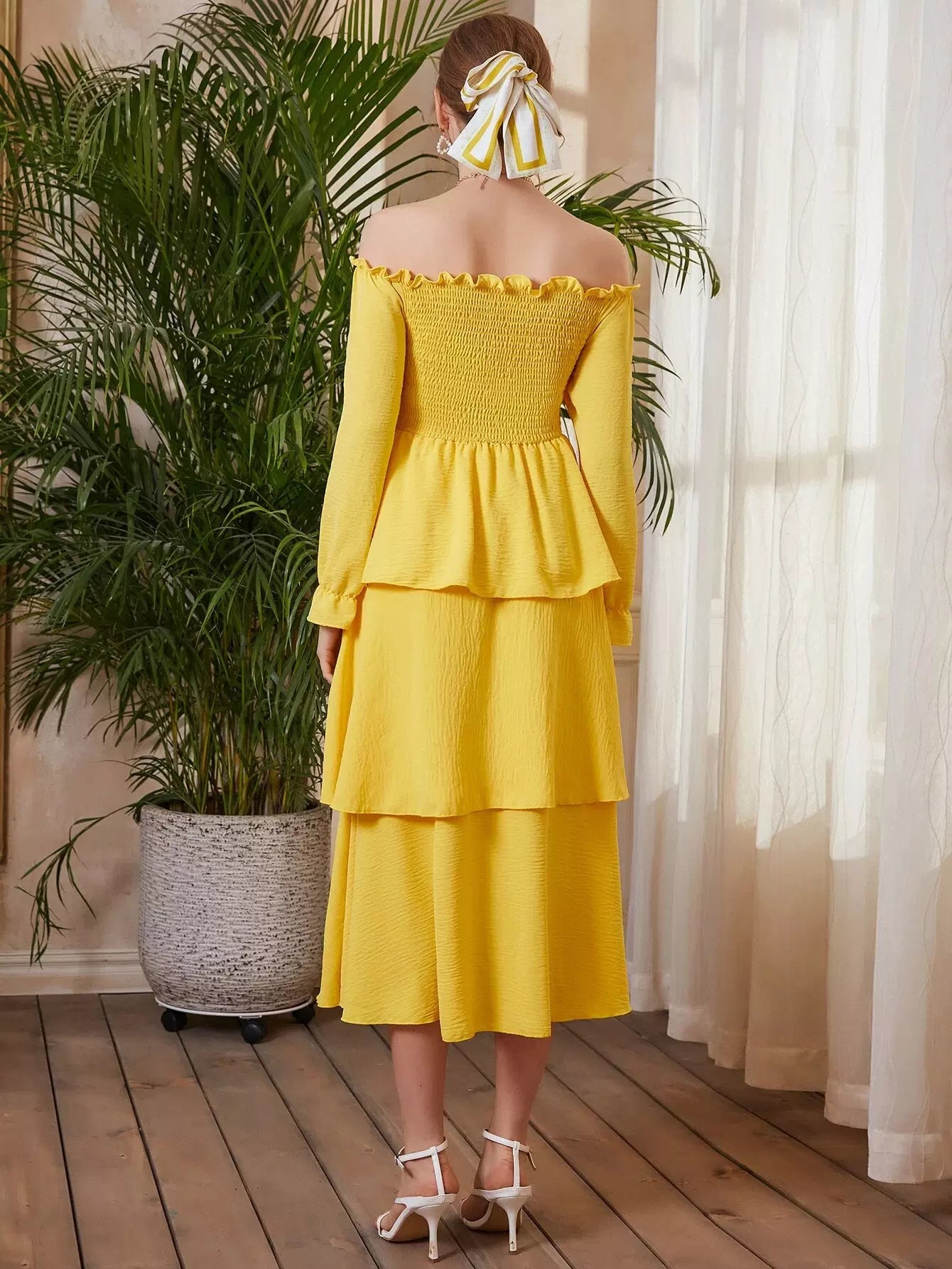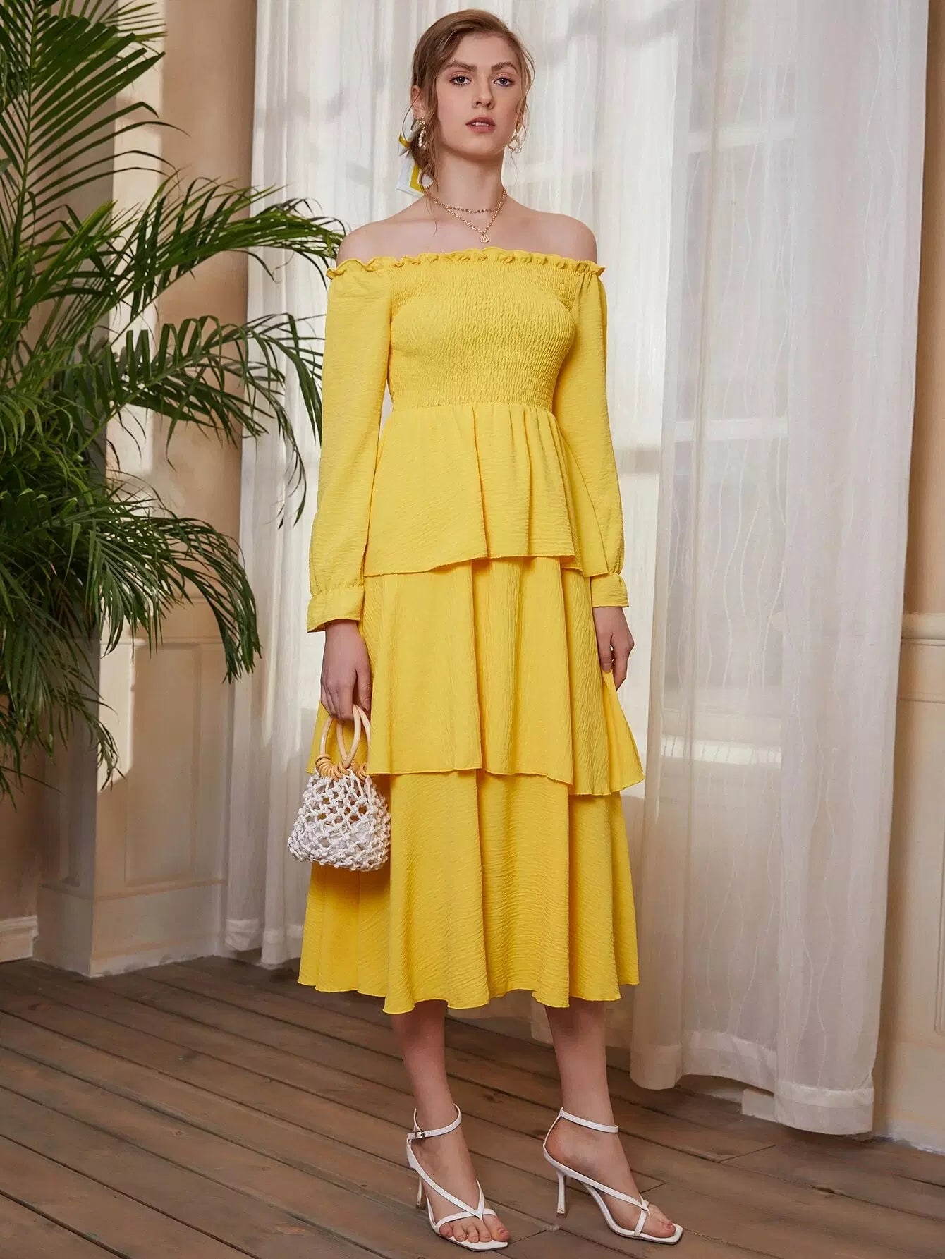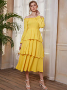 فستان بأكمام منسدلة بطبقات منسدلة على الأكتاف