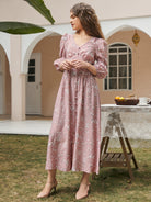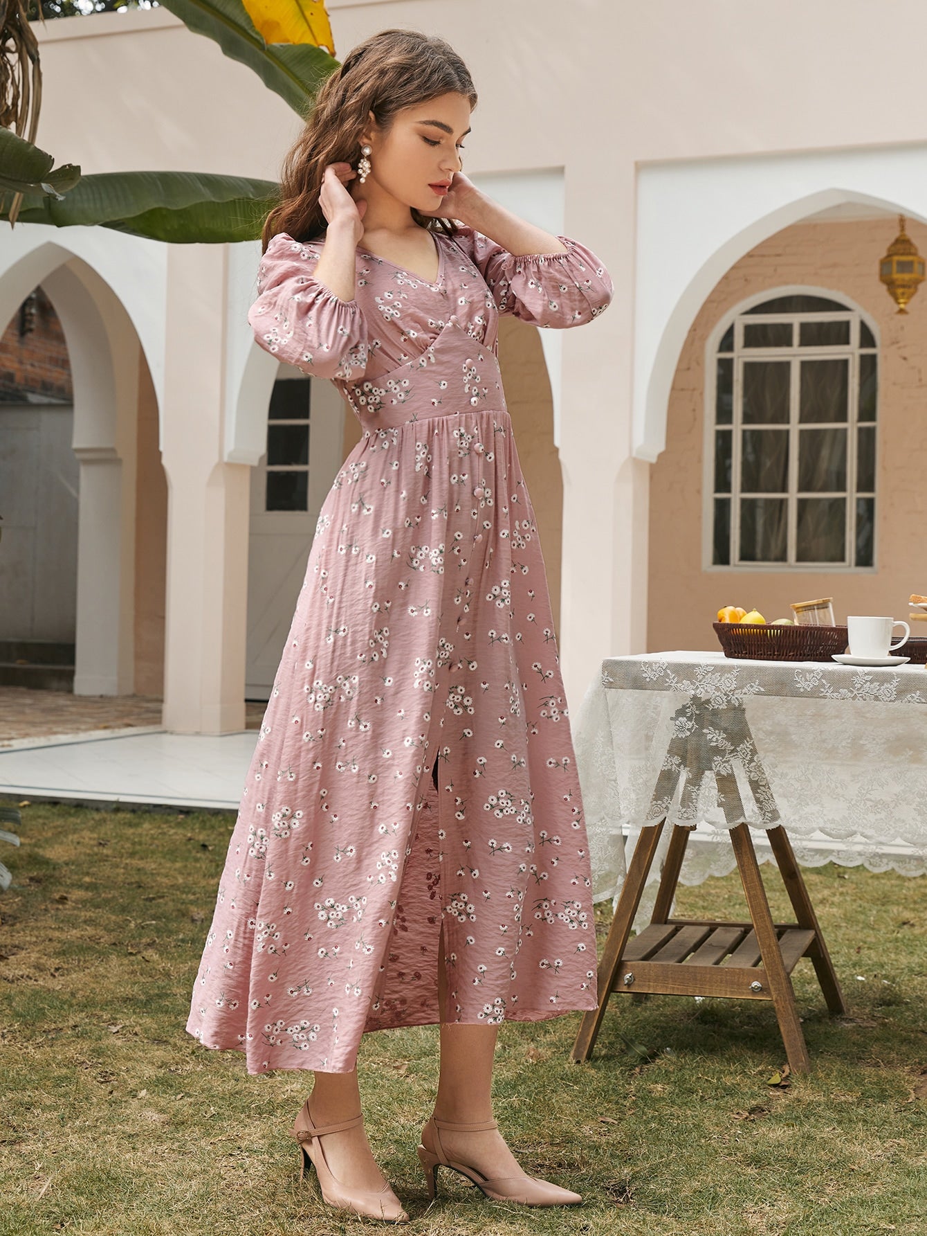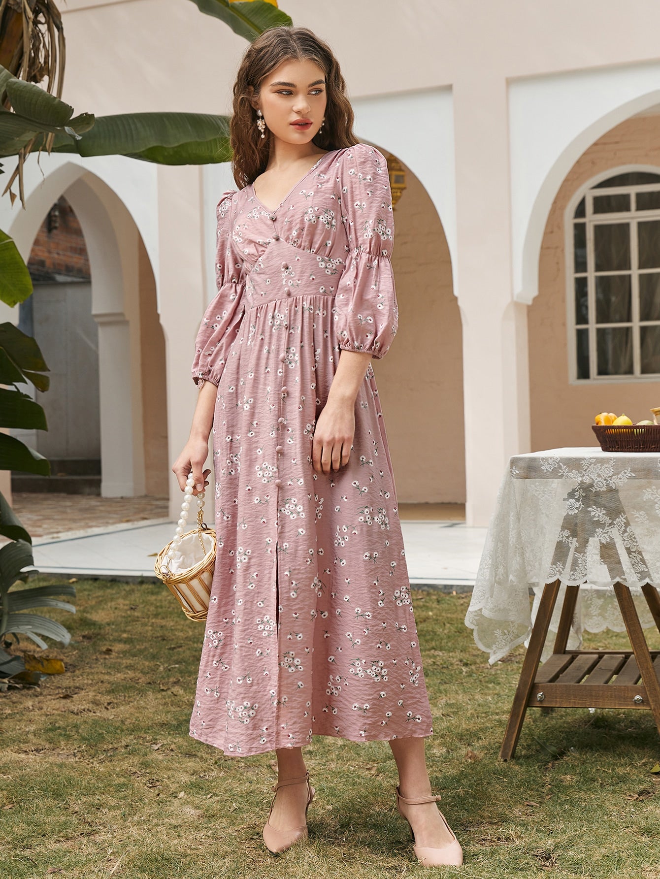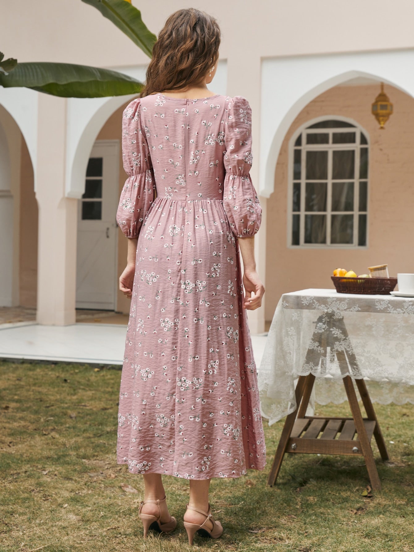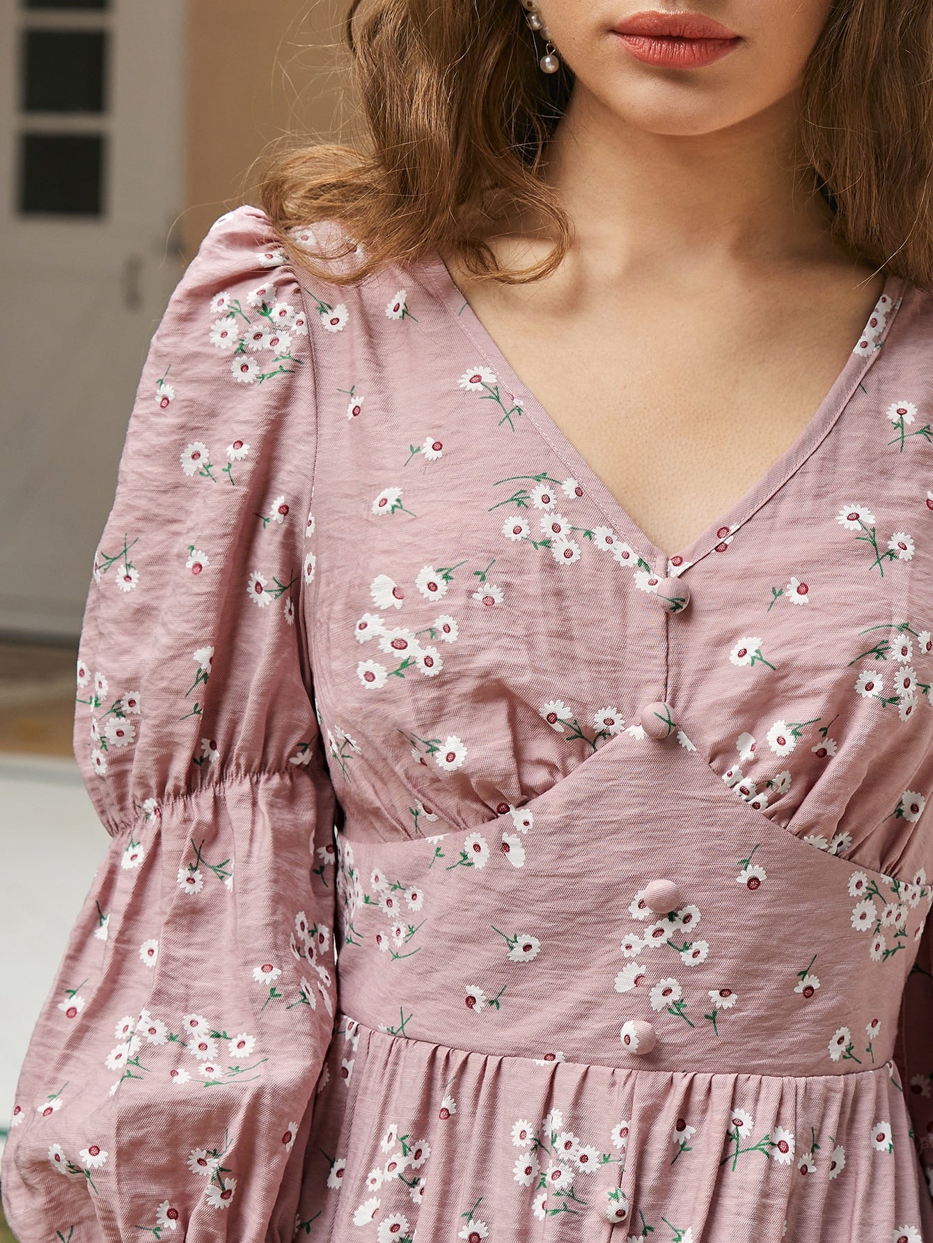 Ditsy Floral Covered Button Bishop Sleeve Dress