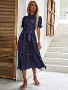 فستان منقط بأكمام منتفخة وحاشية مطوية بدون حزام