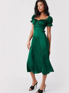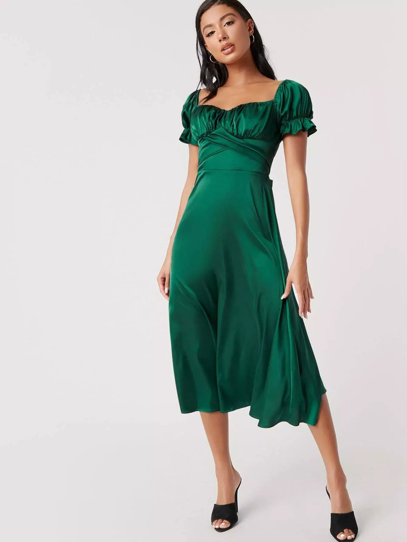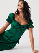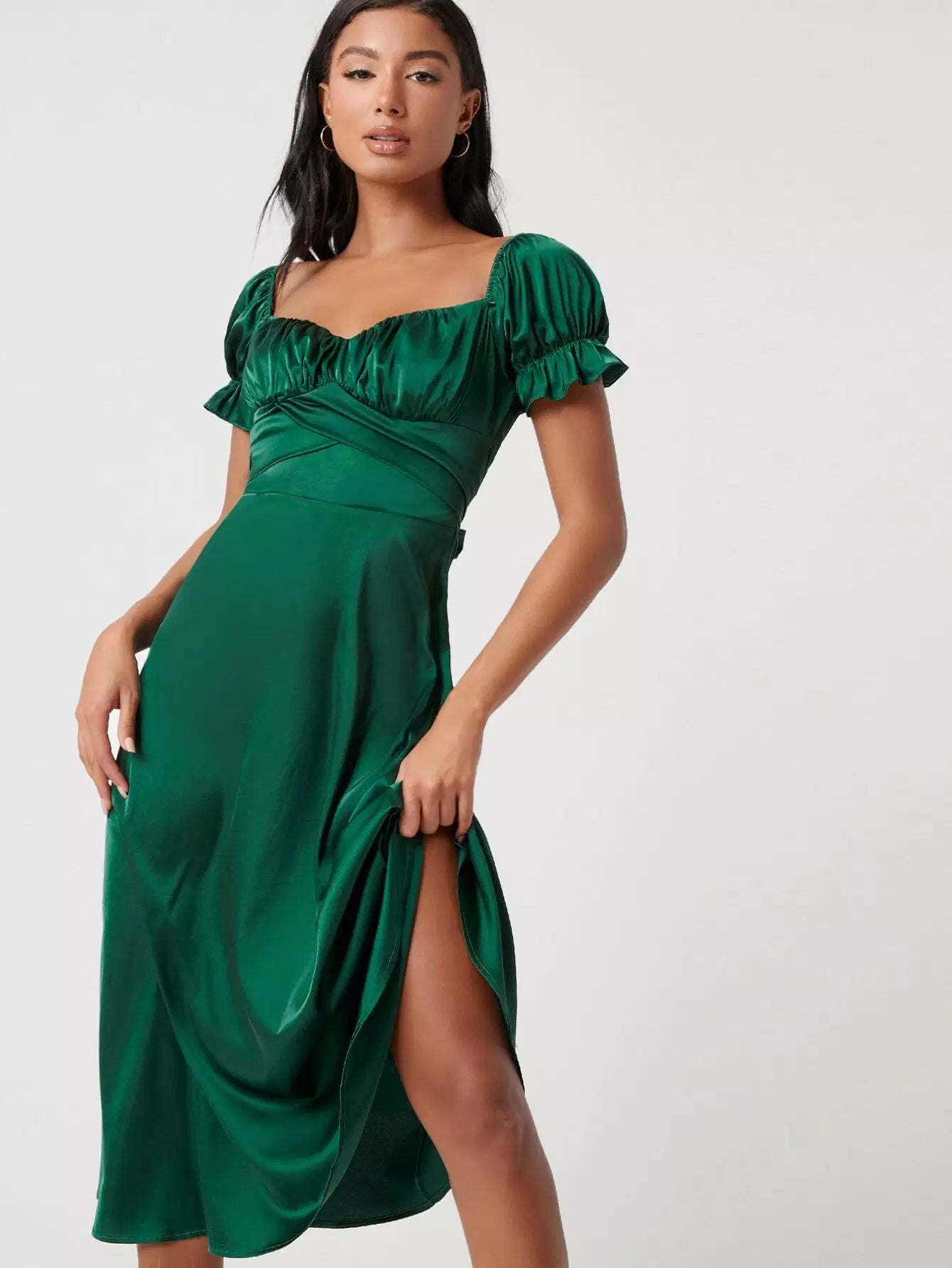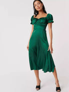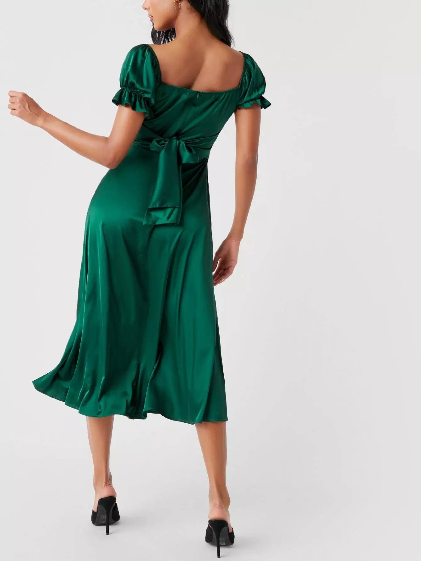 فستان من الساتان بأكمام منفوشة مكشكشة على الصدر وربطة عنق من الخلف