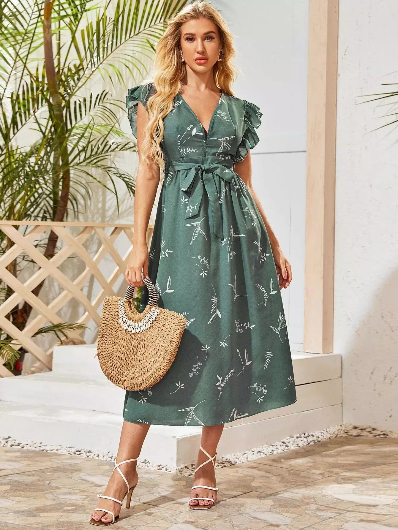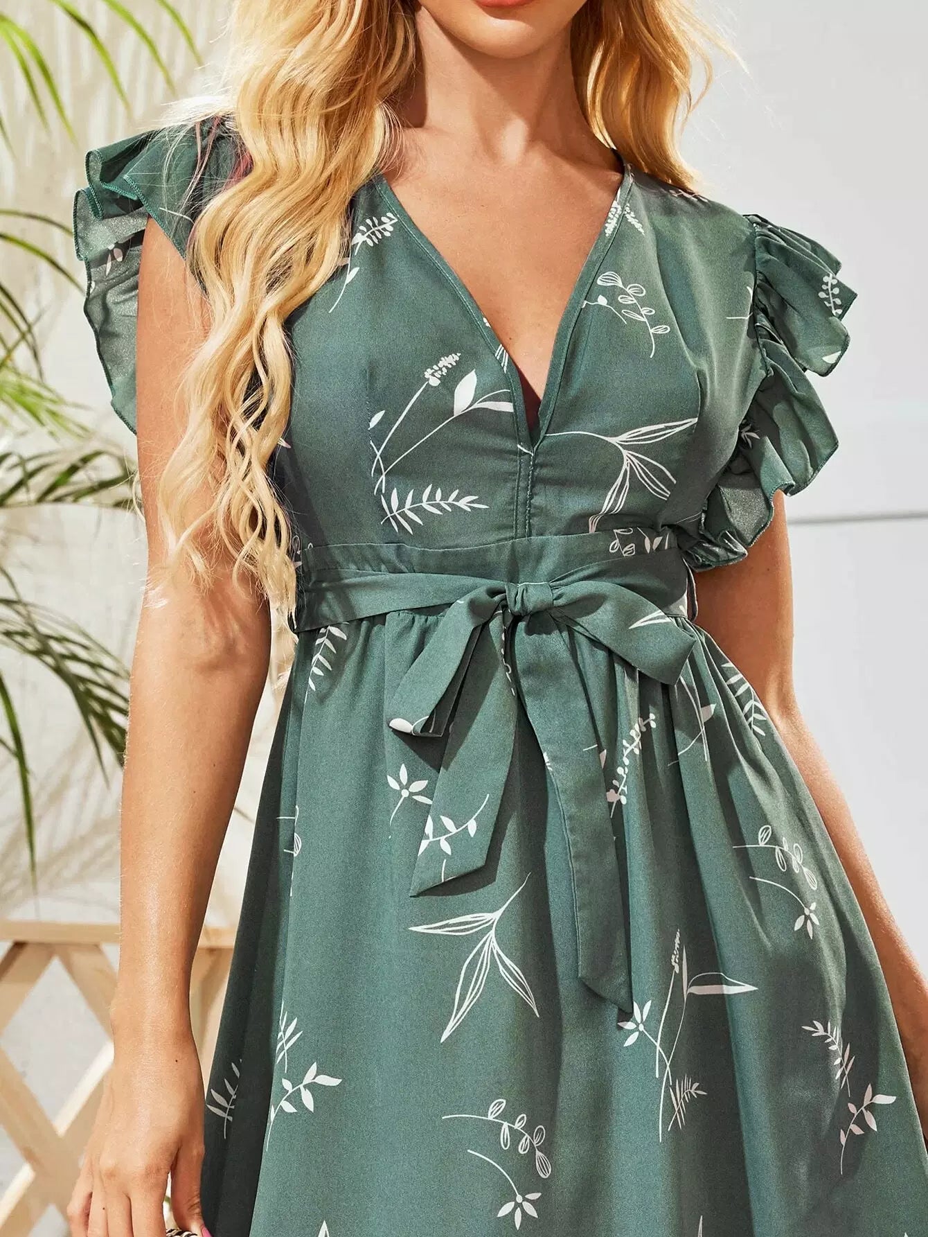 فستان بدون حزام مع كشكشة ونباتات عند فتحة الذراع