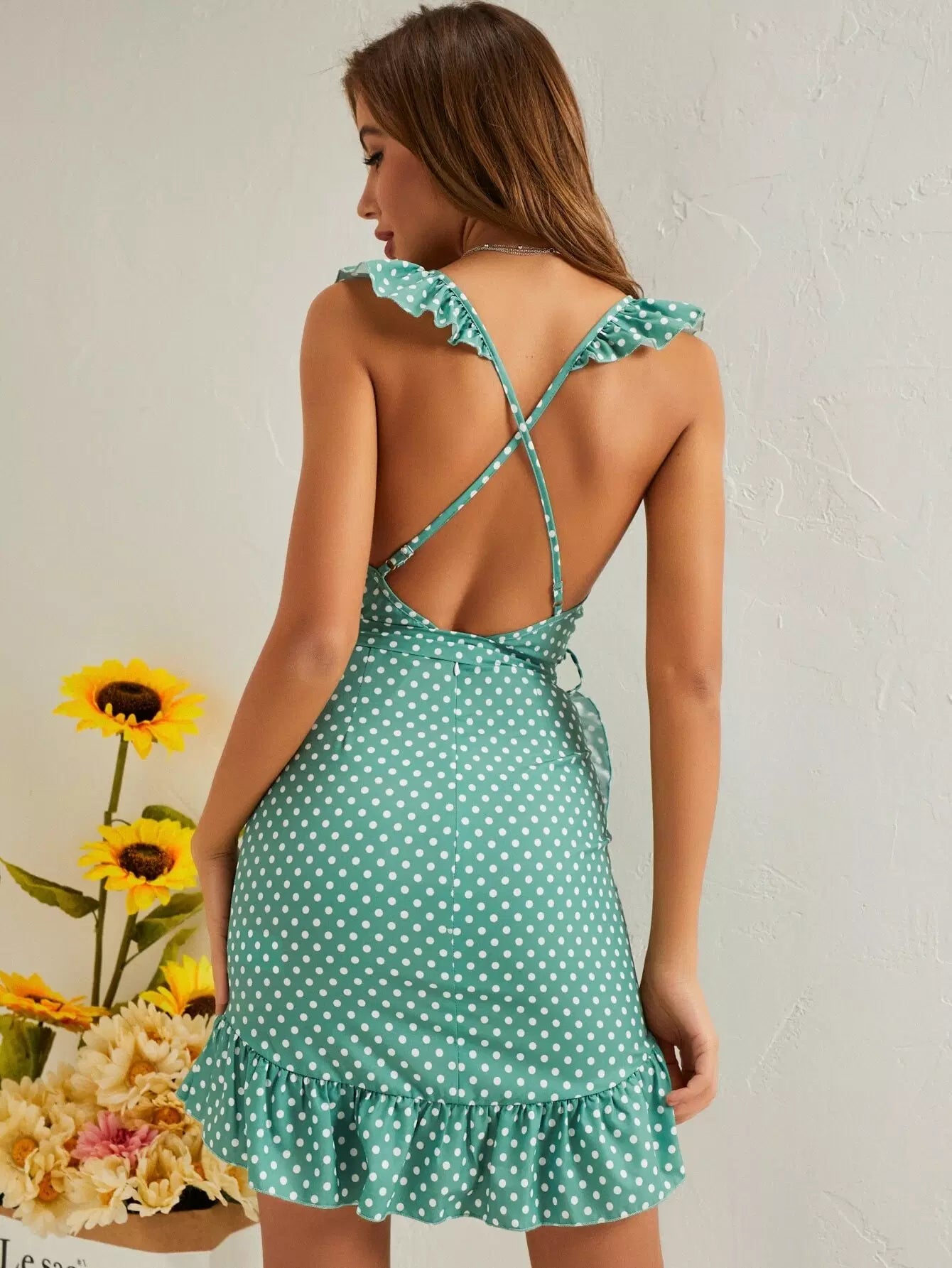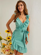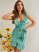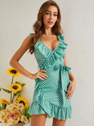 فستان منقط بكشكشة ورقبة مكشوفة الظهر بدون حزام