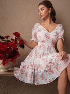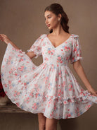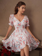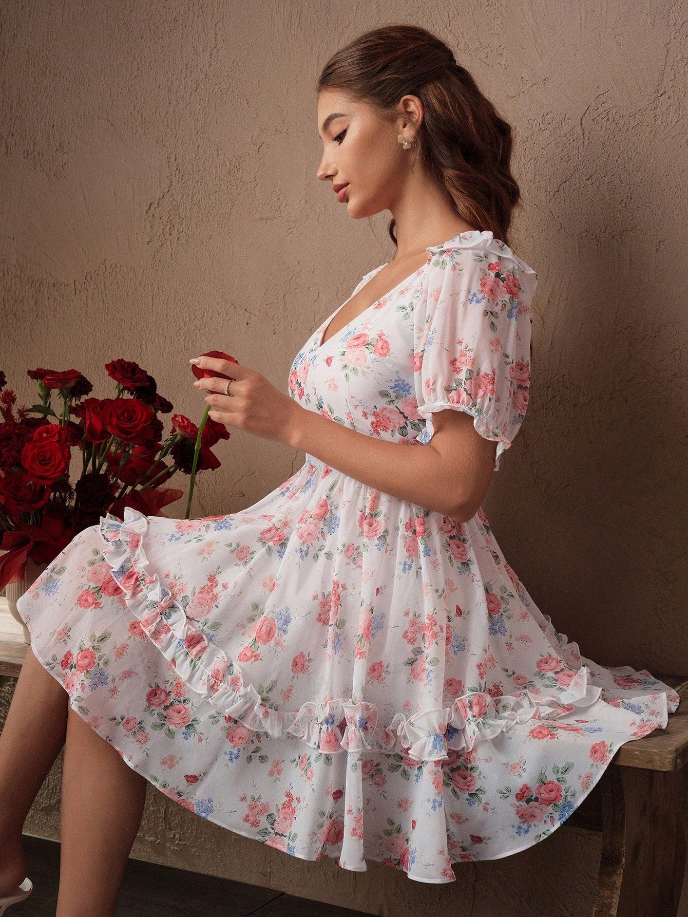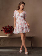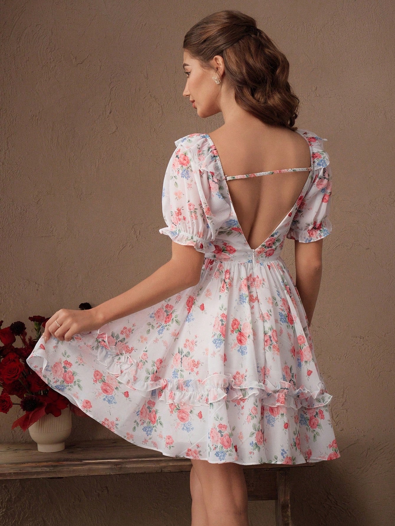 Savoree Ruffled Backless Floral Print A-Line Short Dress With Puff Sleeves, Summer Vacation Style