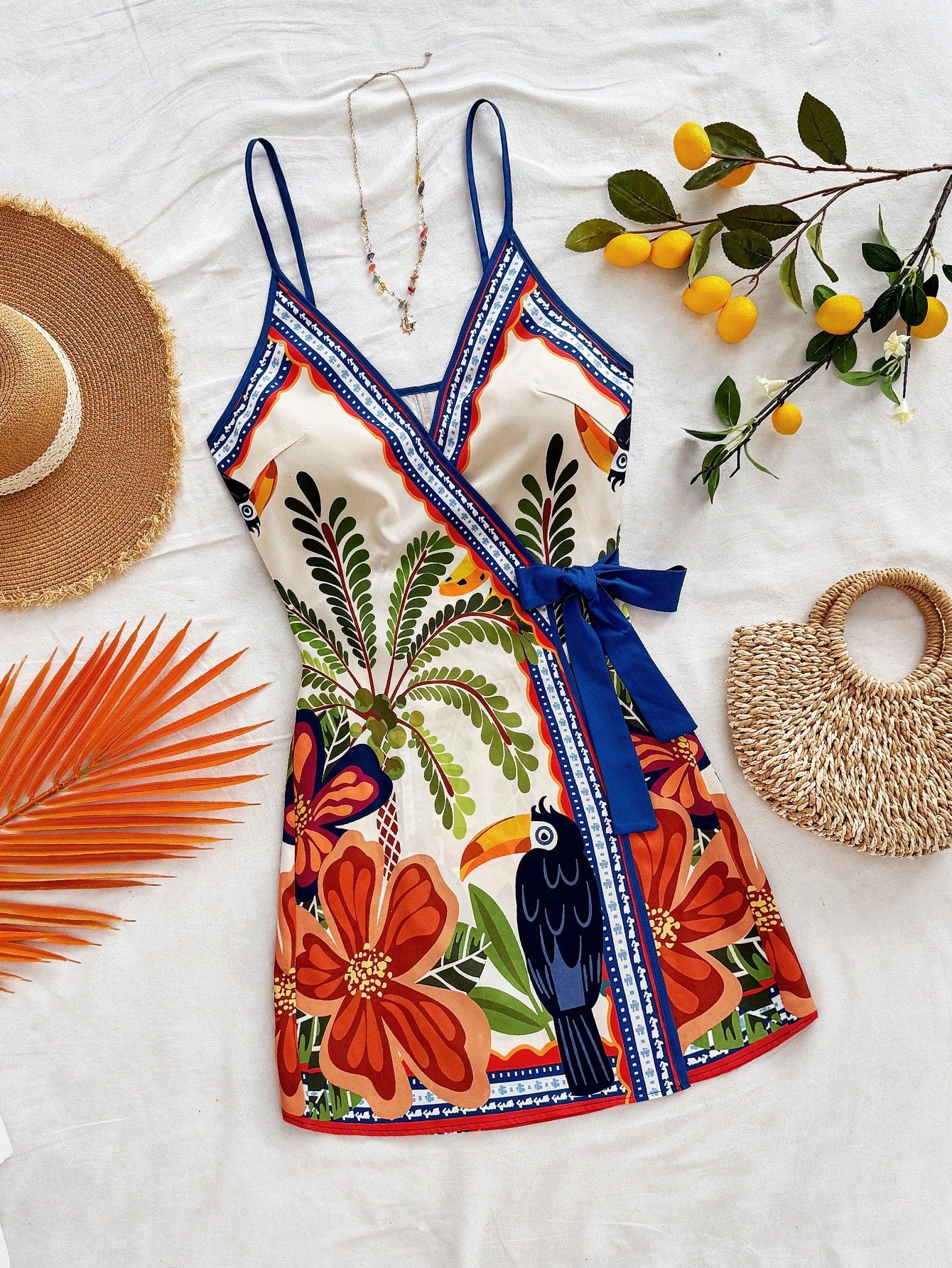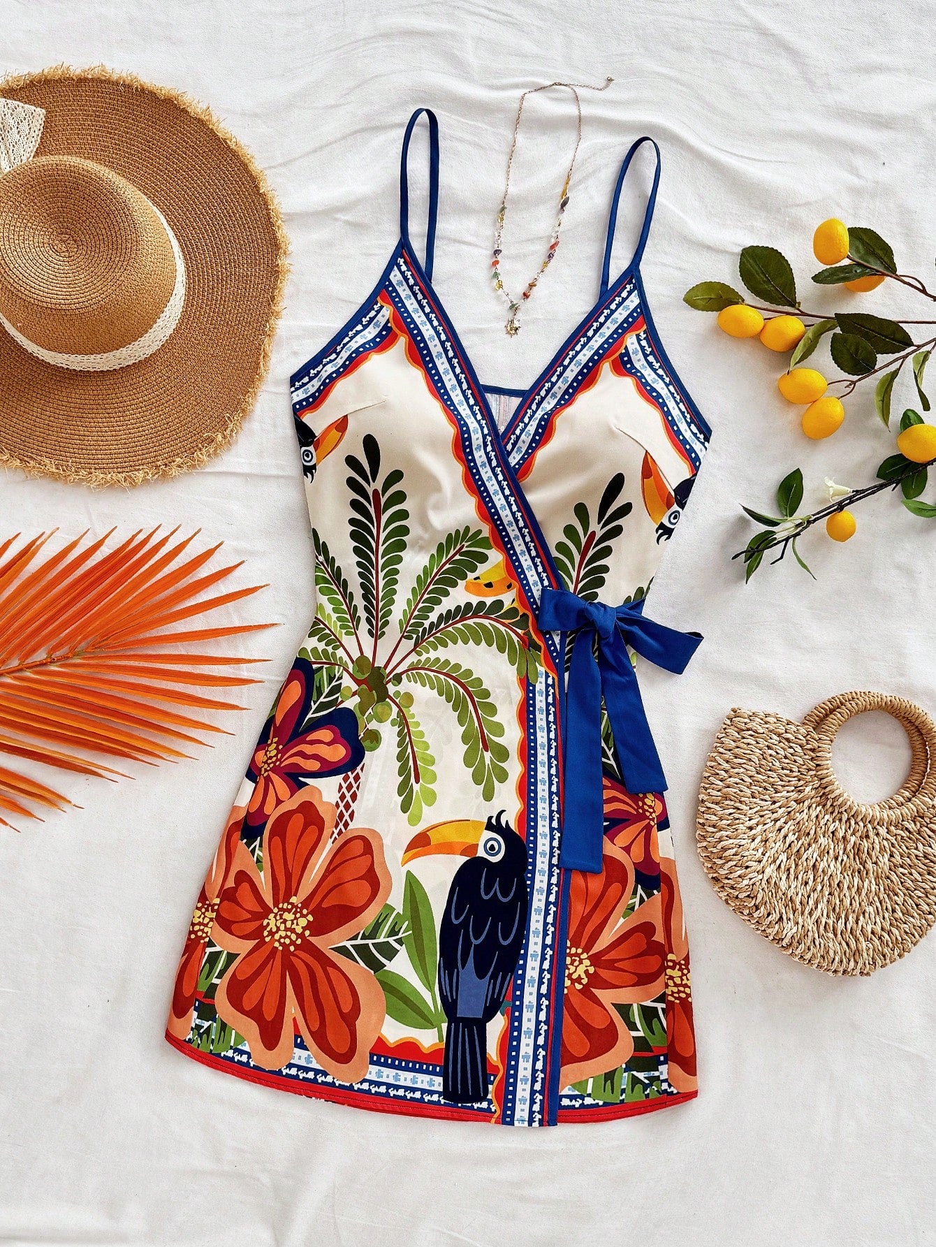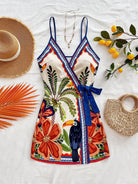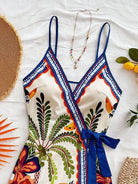 Soleia Women's Vacation Tropical Element Coconut Tree Palm Leaf Spaghetti Strap Mini Wrap Dress,Bohemia