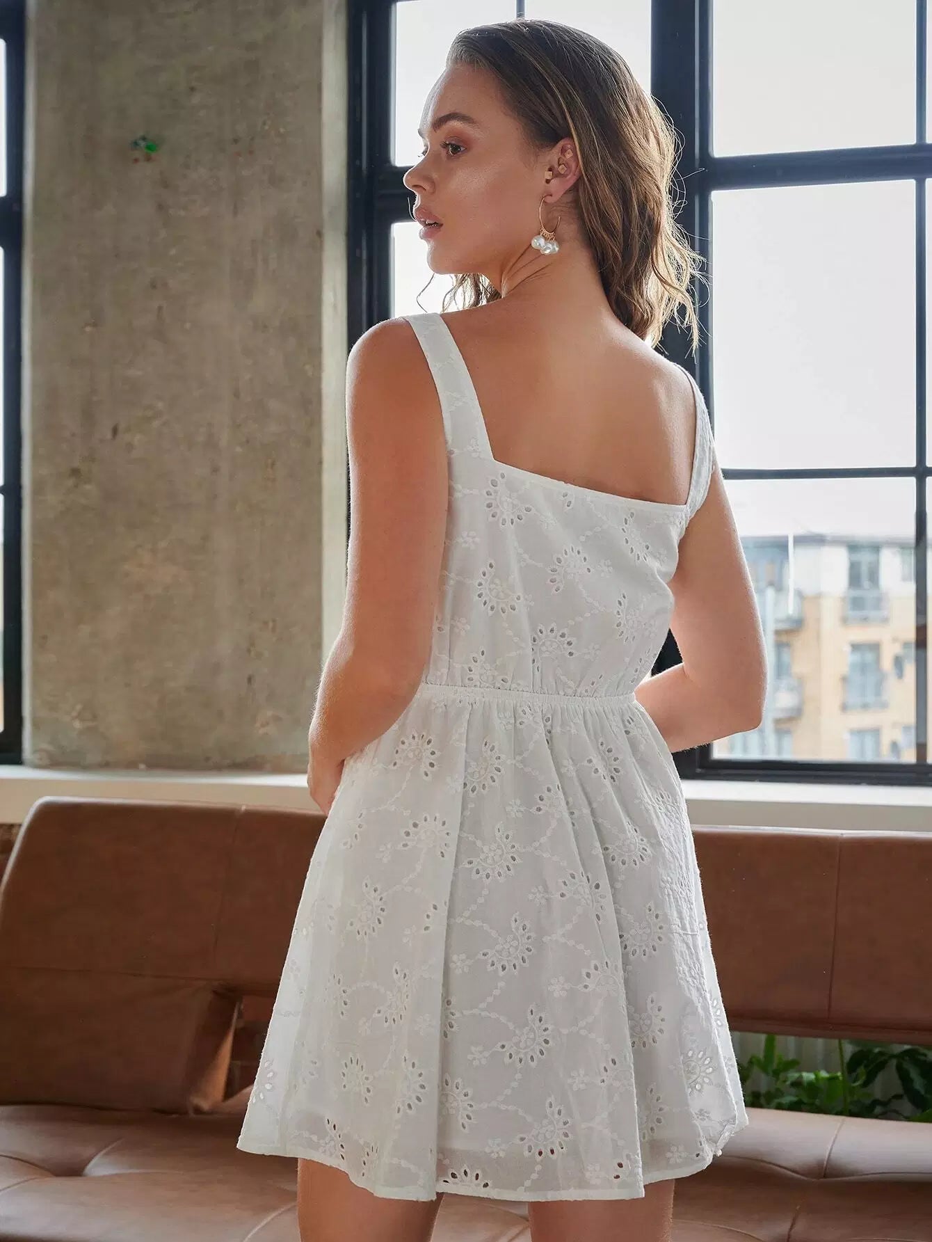 فستان شيفي بفتحة رقبة مربعة وأزرار أمامية