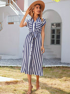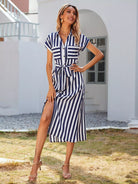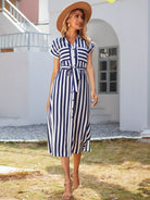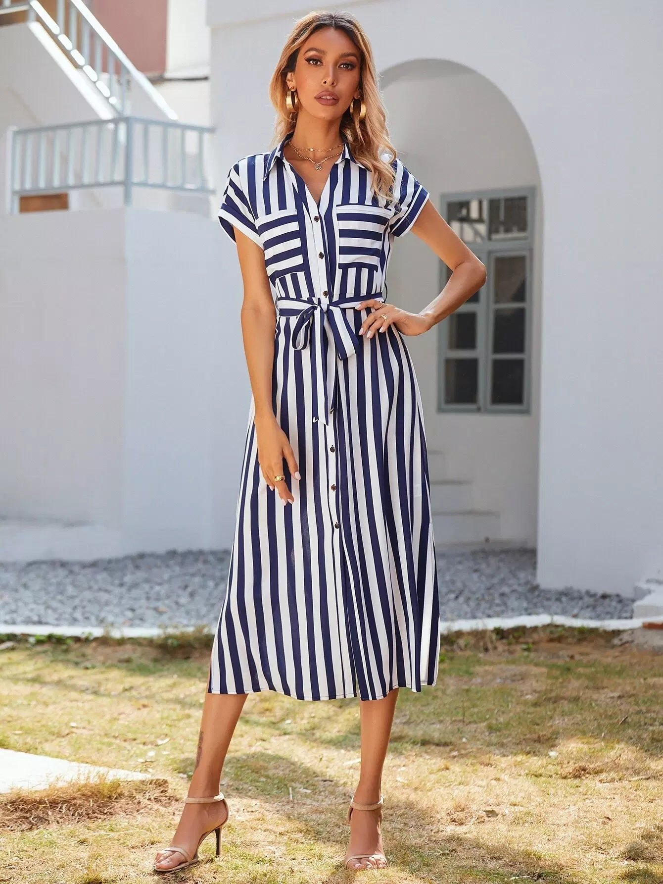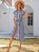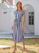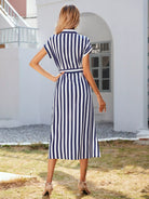 فستان قميص مخطط بأزرار أمامية وحاشية مقسمة بدون حزام