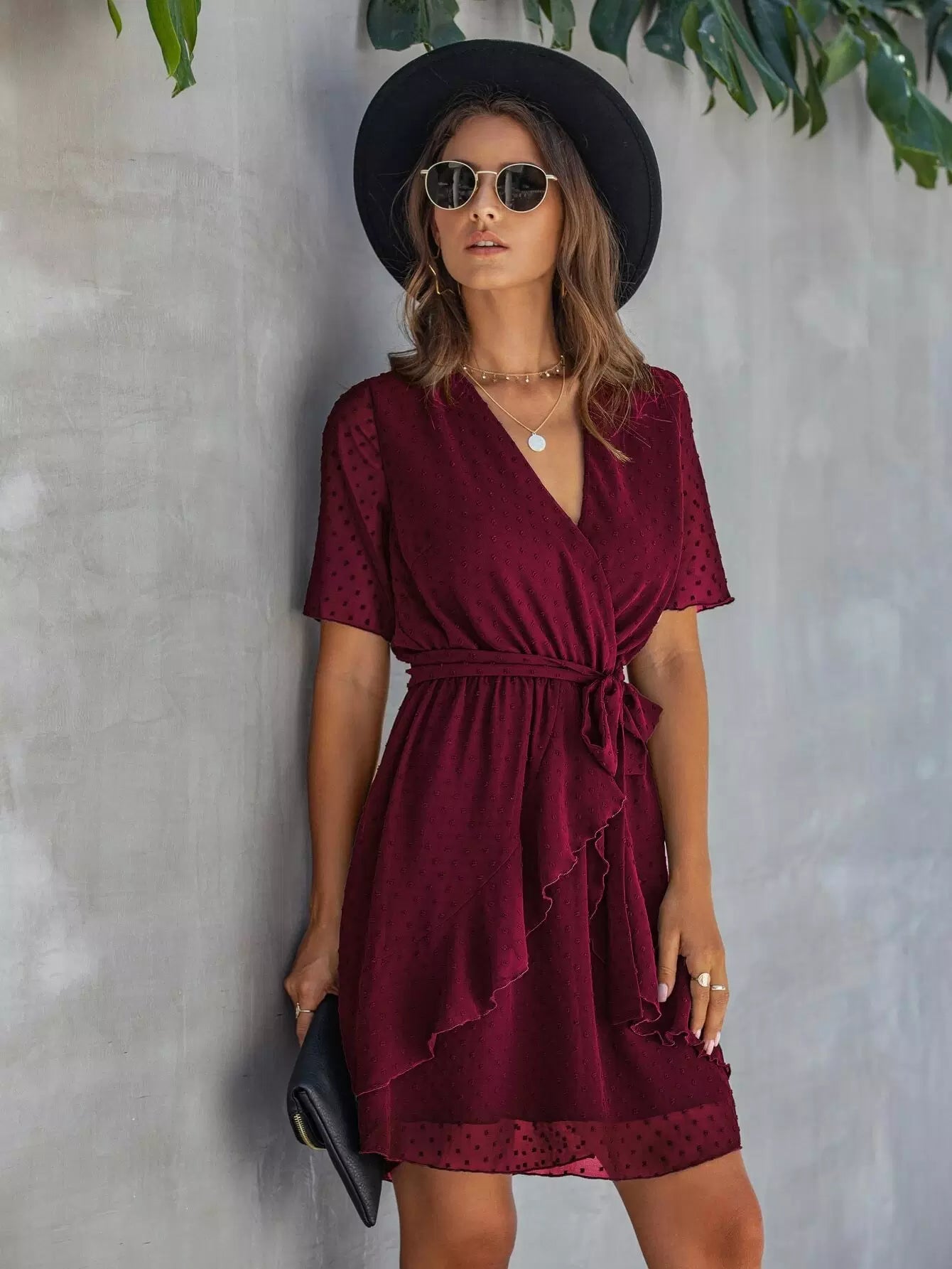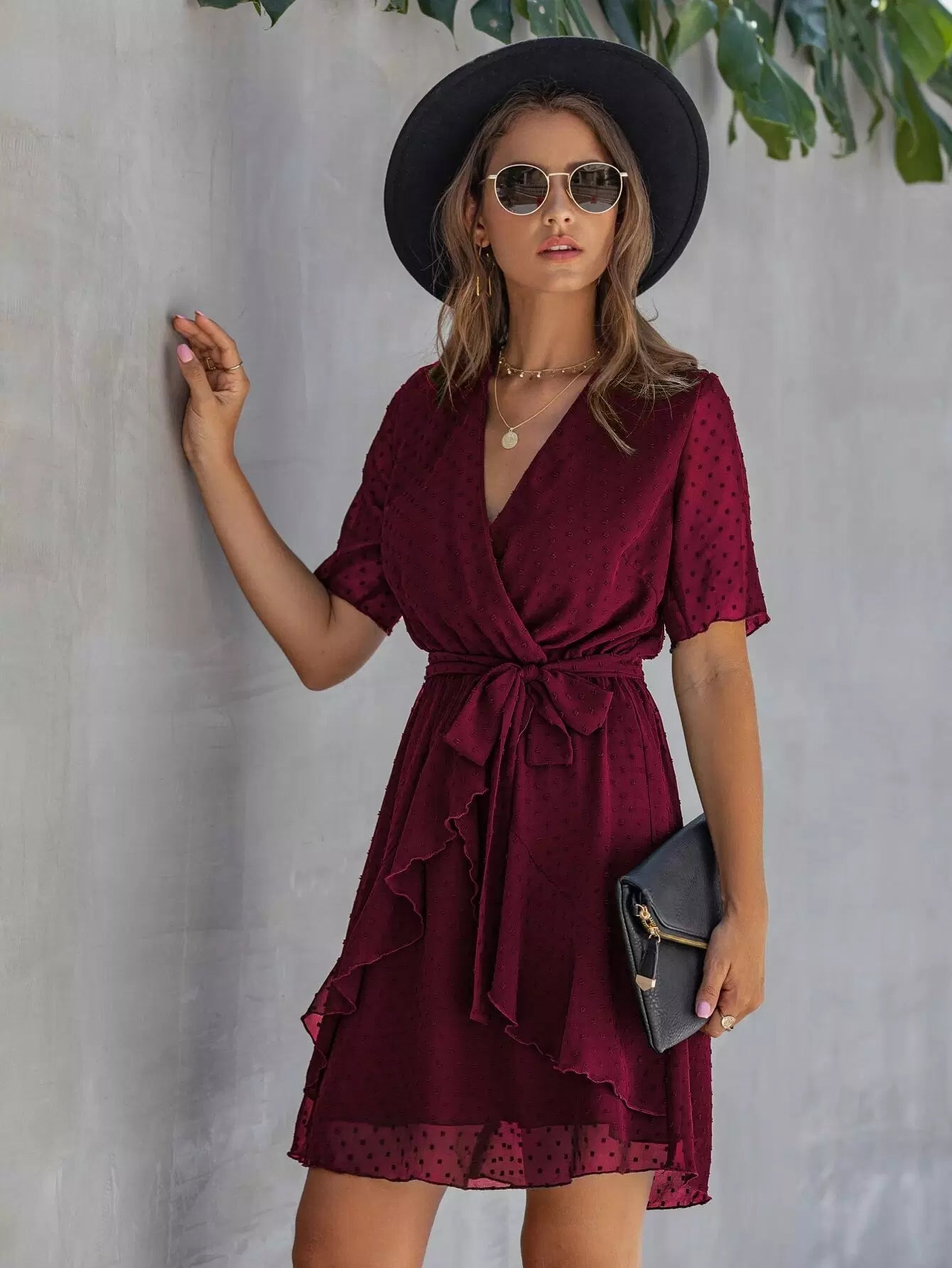 للنساء - فستان بحزام مزين بنقاط سويسرية