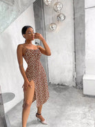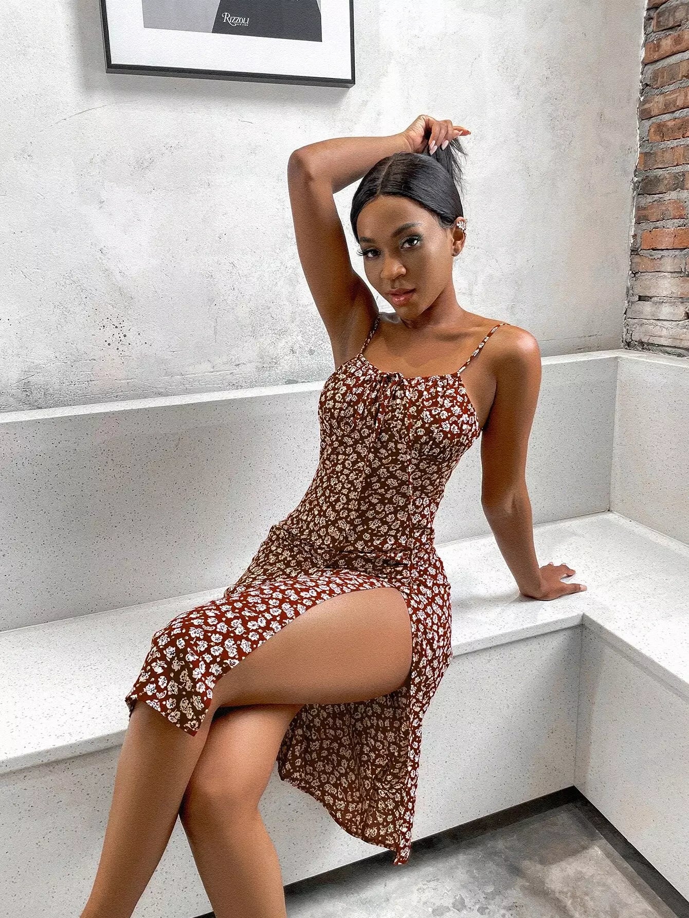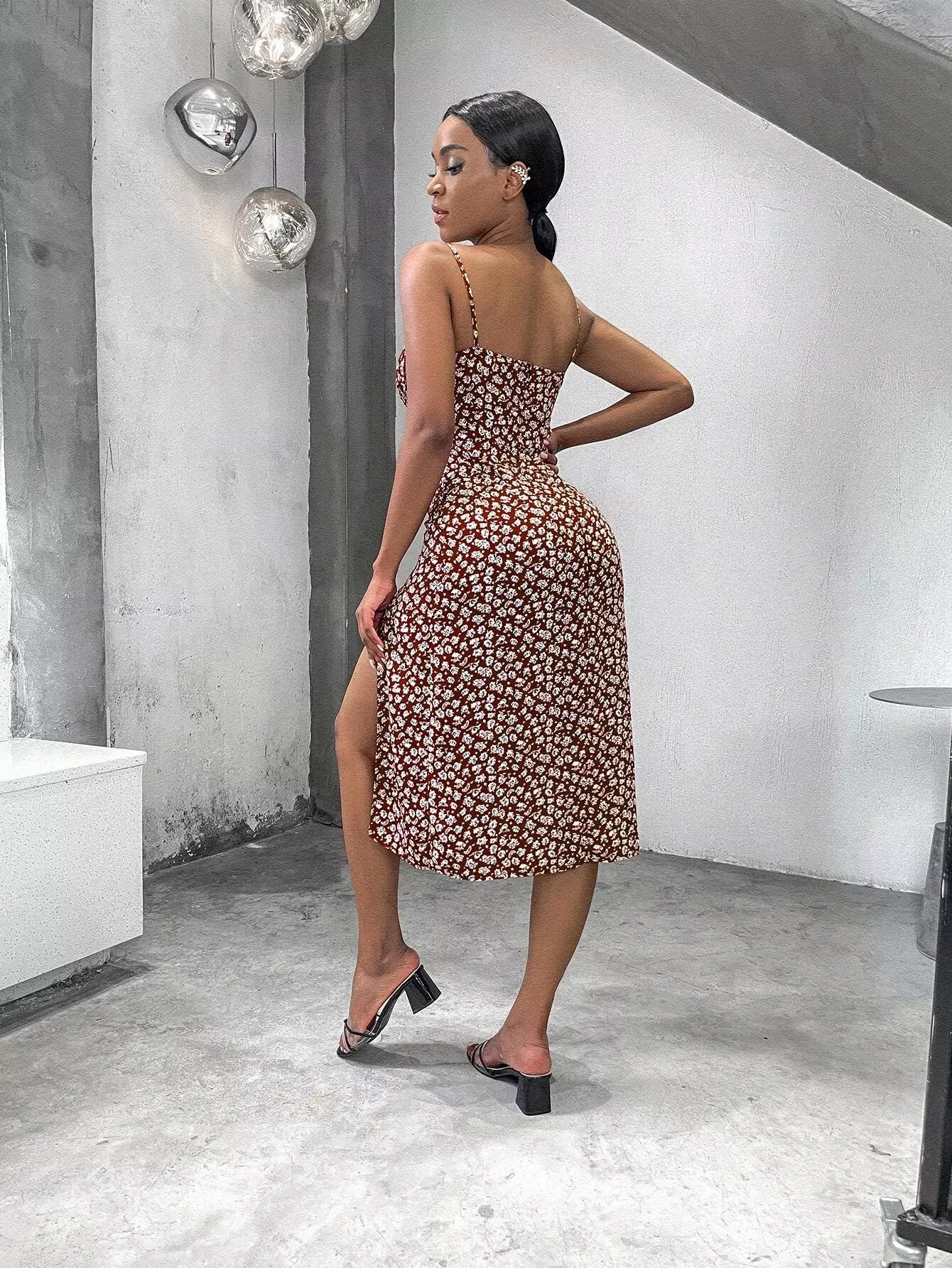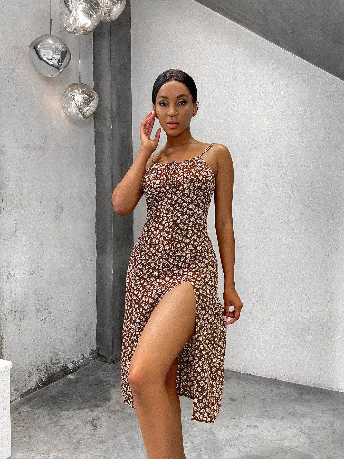 فستان كامي مزهر برباط أمامي مكشكش وفتحة صدر وفخذ