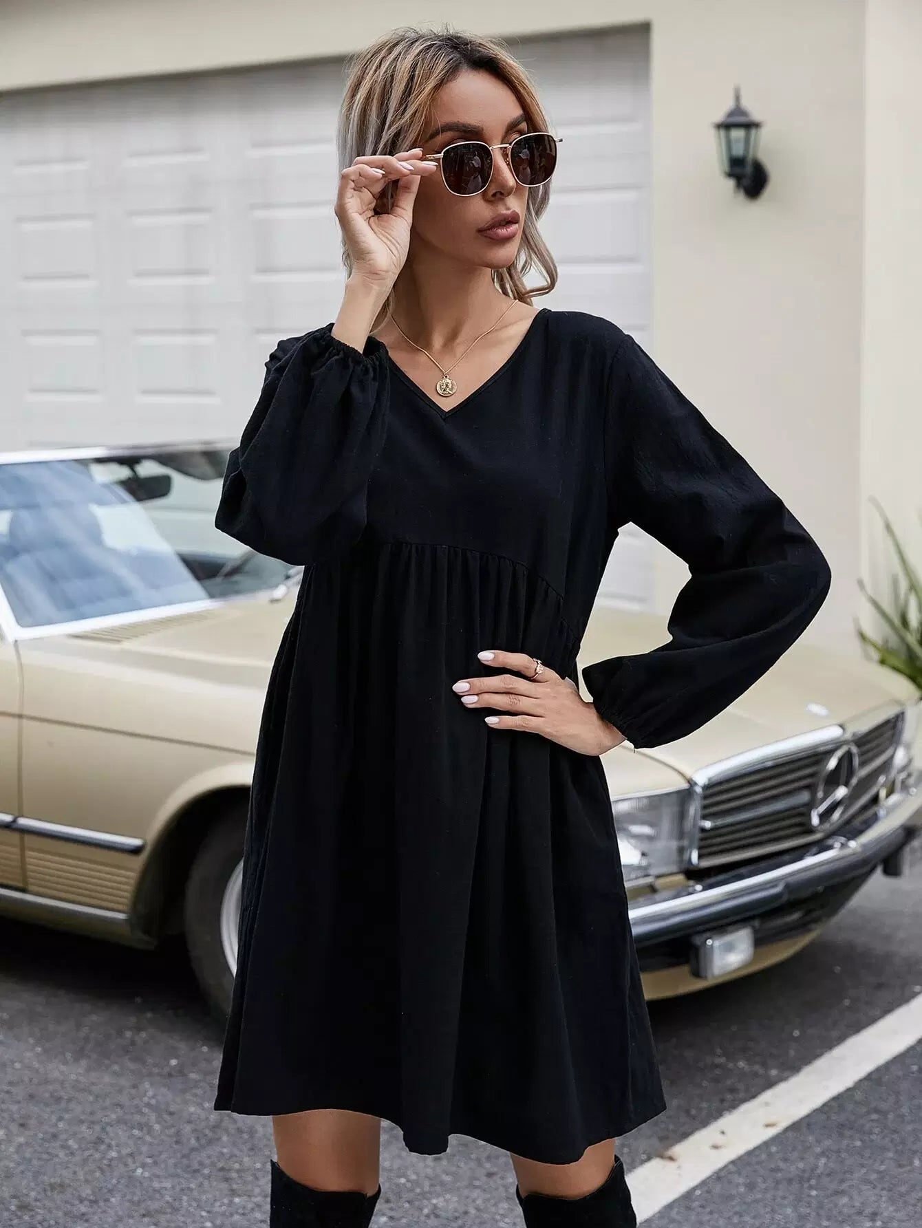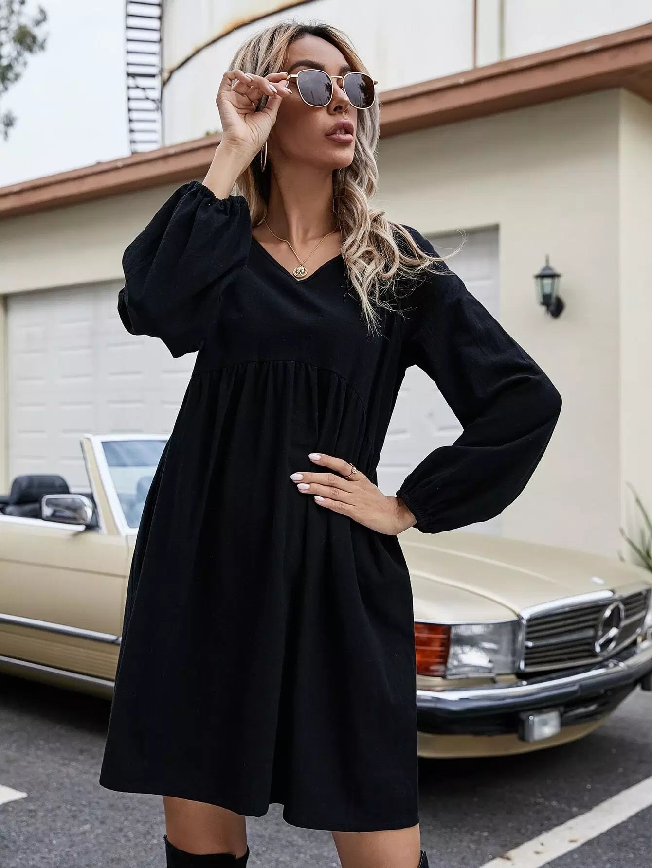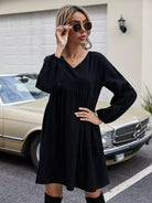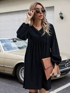 فستان سموك بأكمام على شكل حرف V بياقة على شكل أسقف