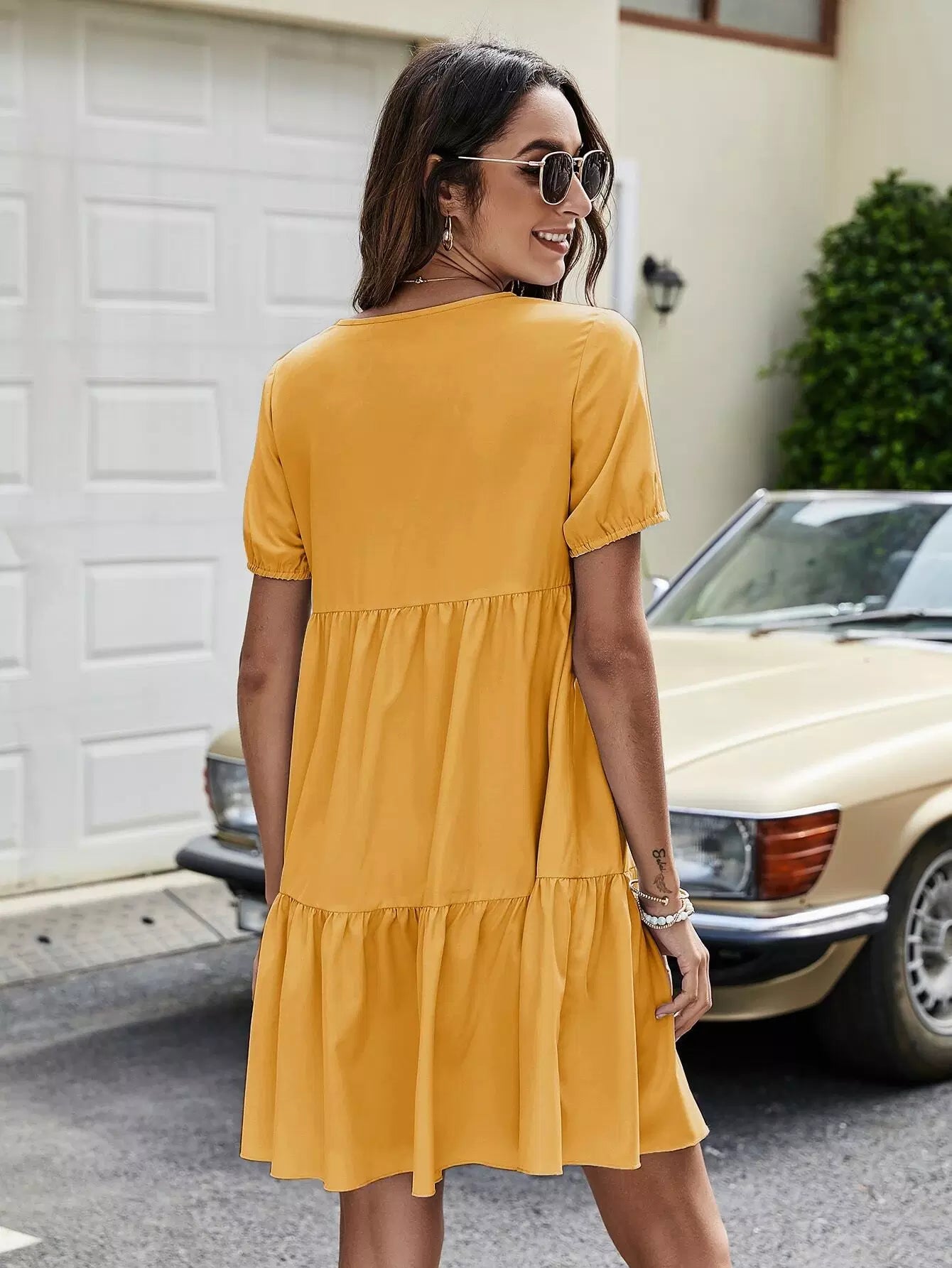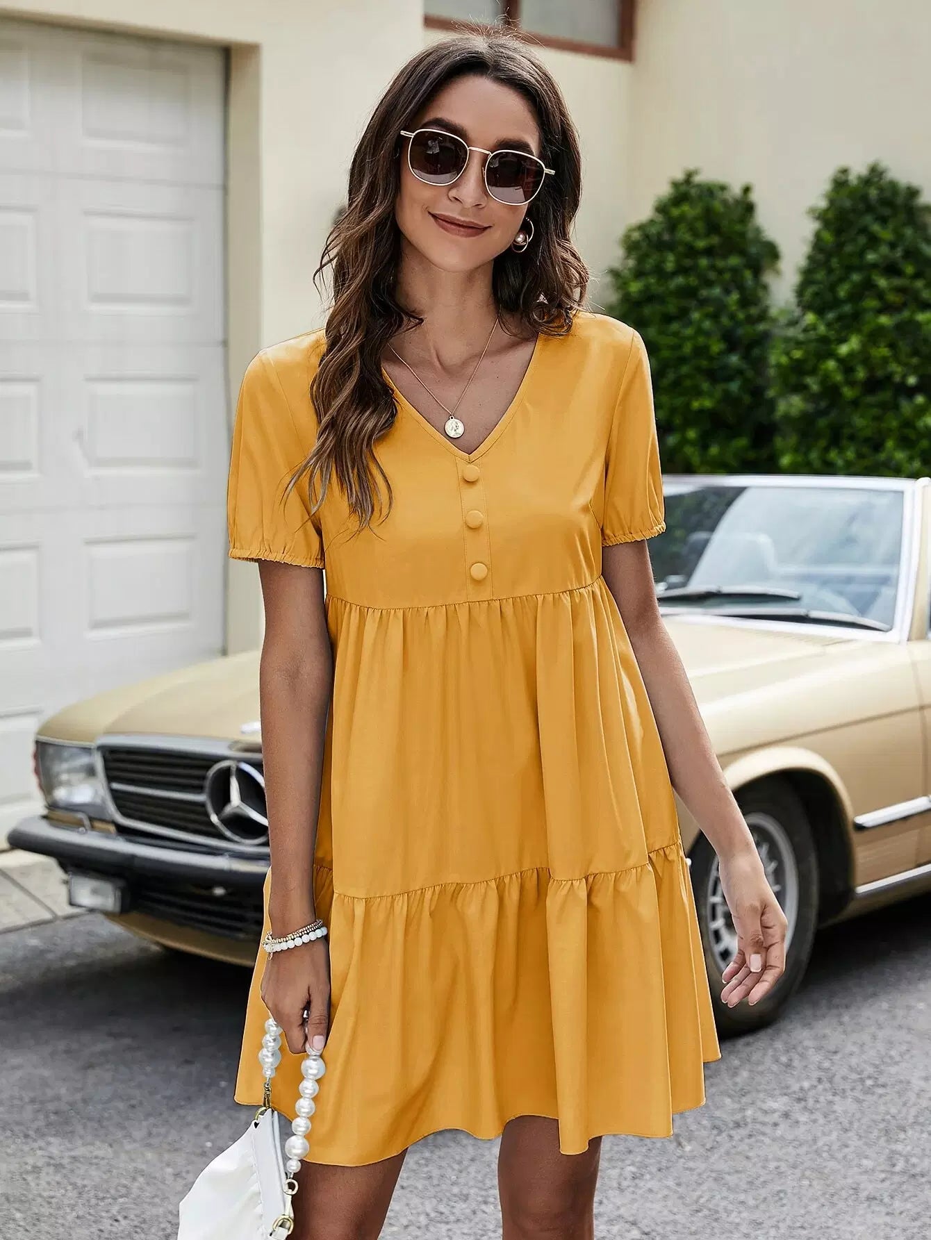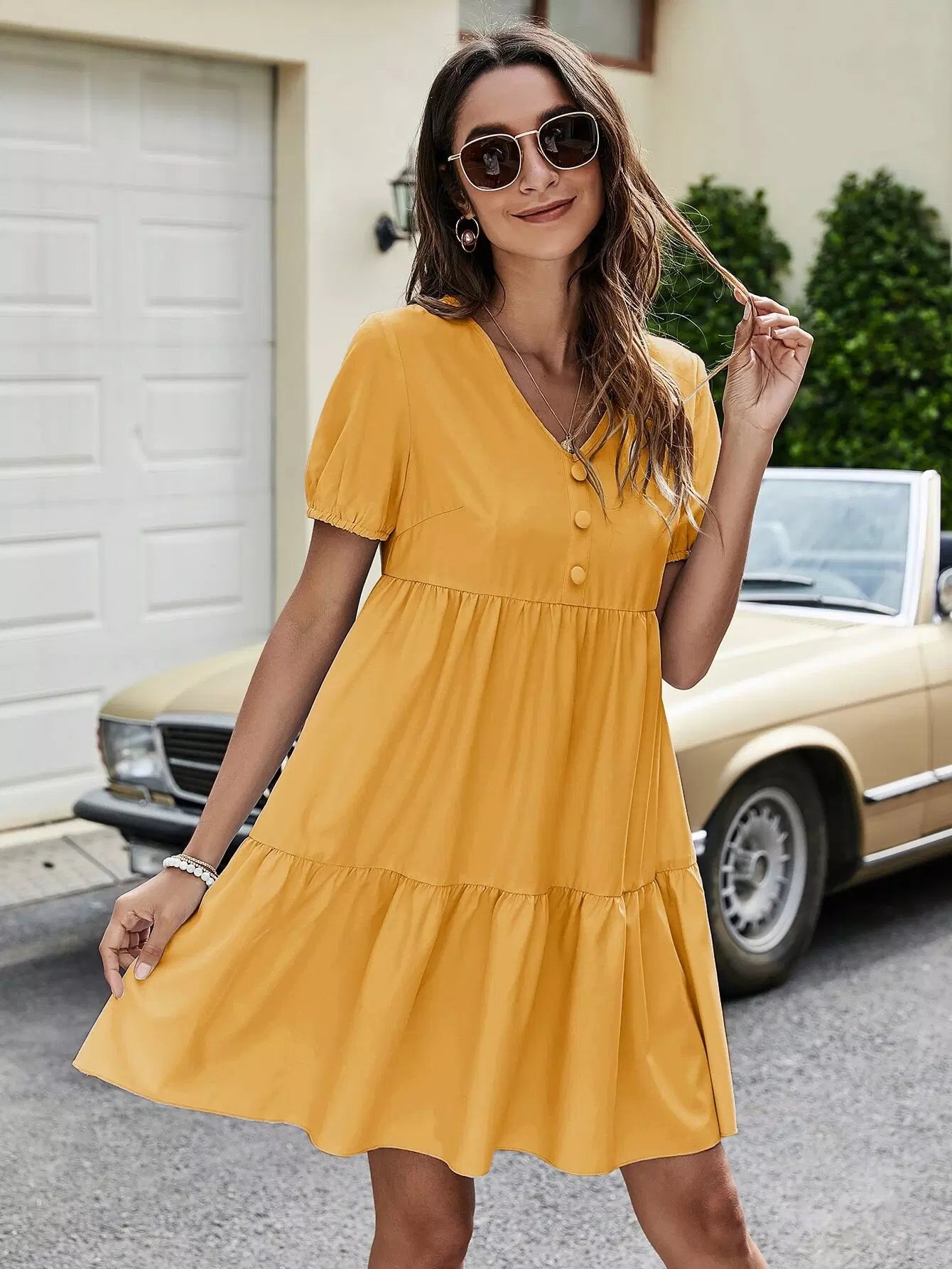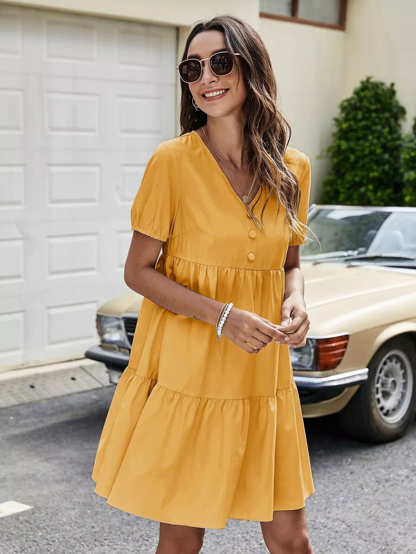 فستان بياقة على شكل حرف V بياقة على شكل أزرار أمامية مكشكشة من الأمام