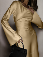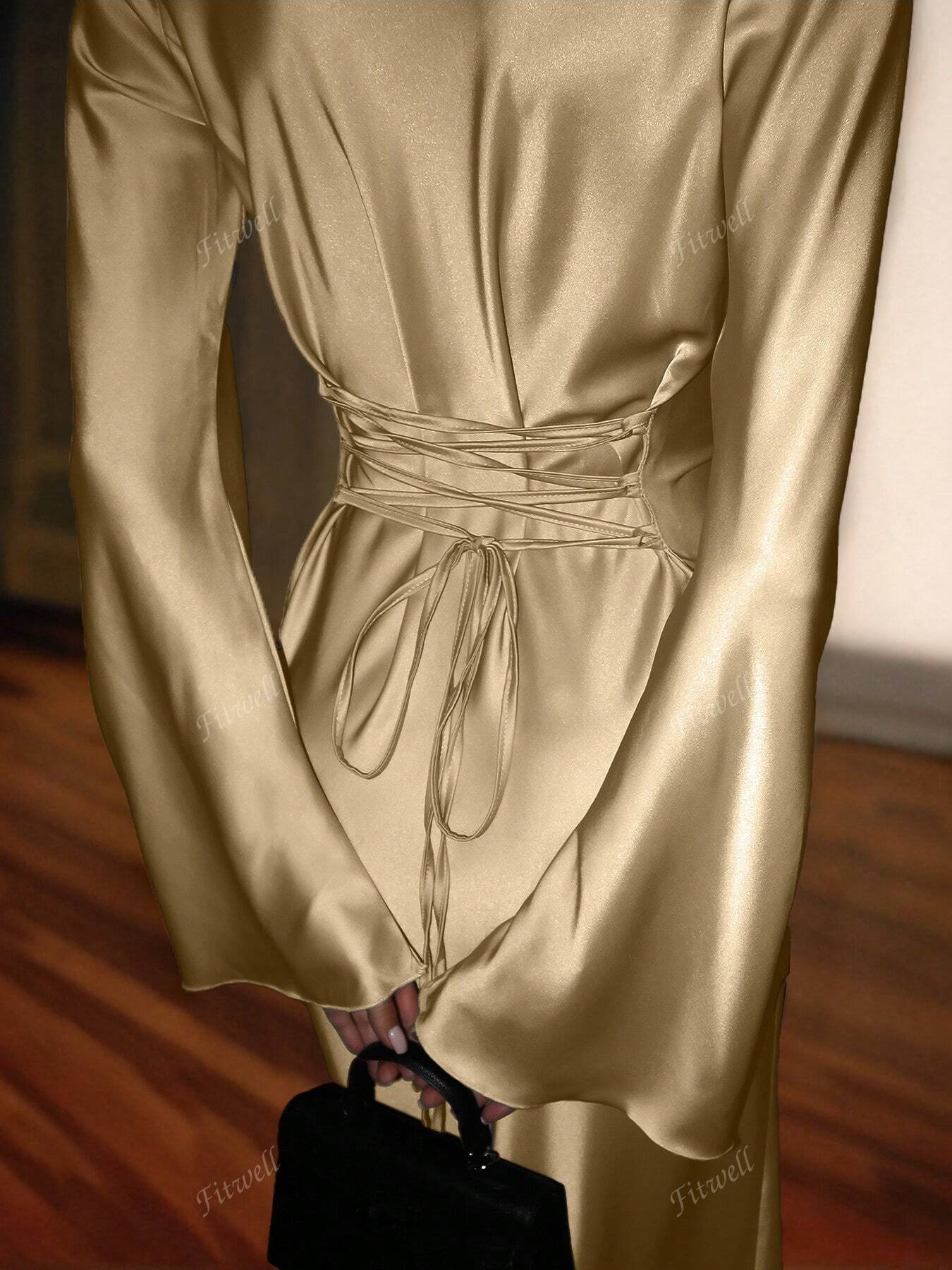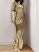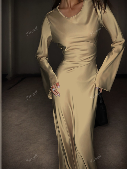 فستان ماكسي ساتان نسائي مصمم حسب الطلب مع رباط خصر مشد، رقبة مستديرة كلاسيكية وأكمام واسعة مثيرة فاخرة