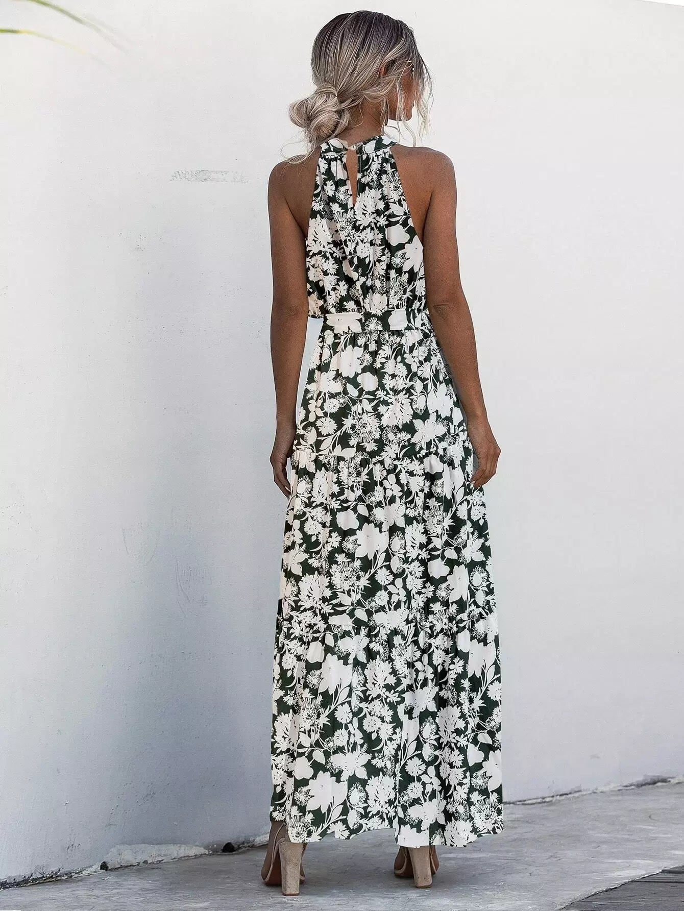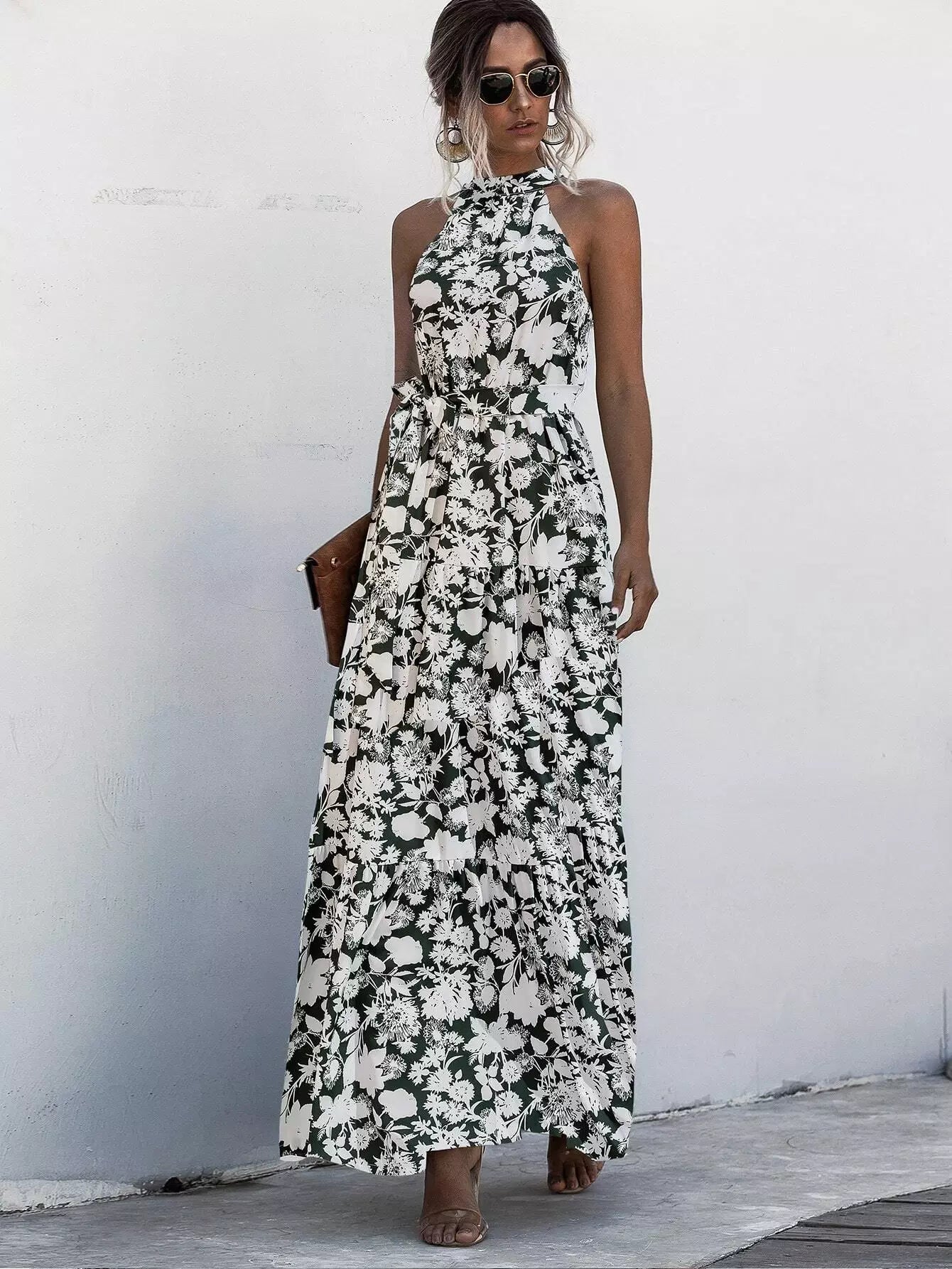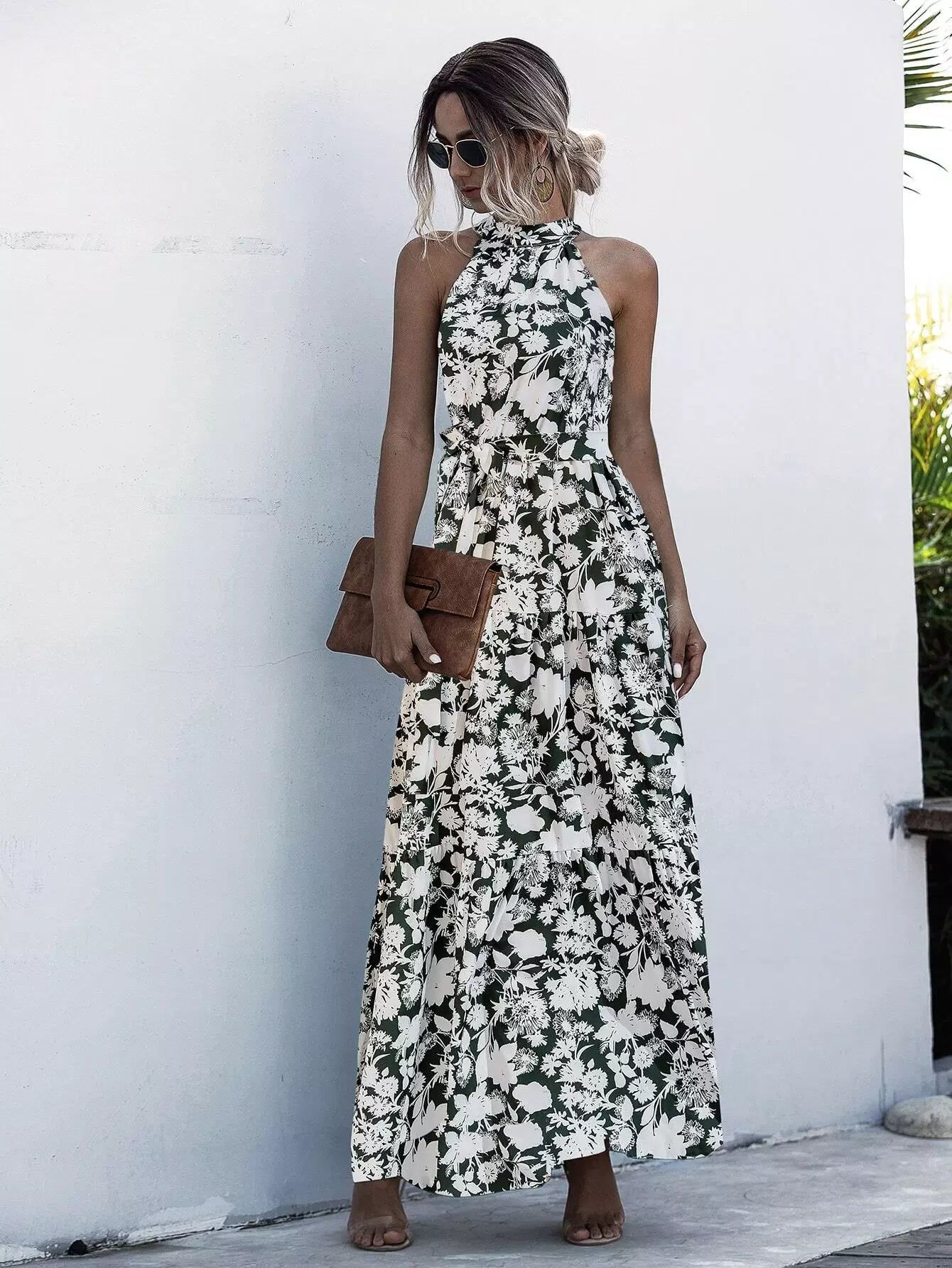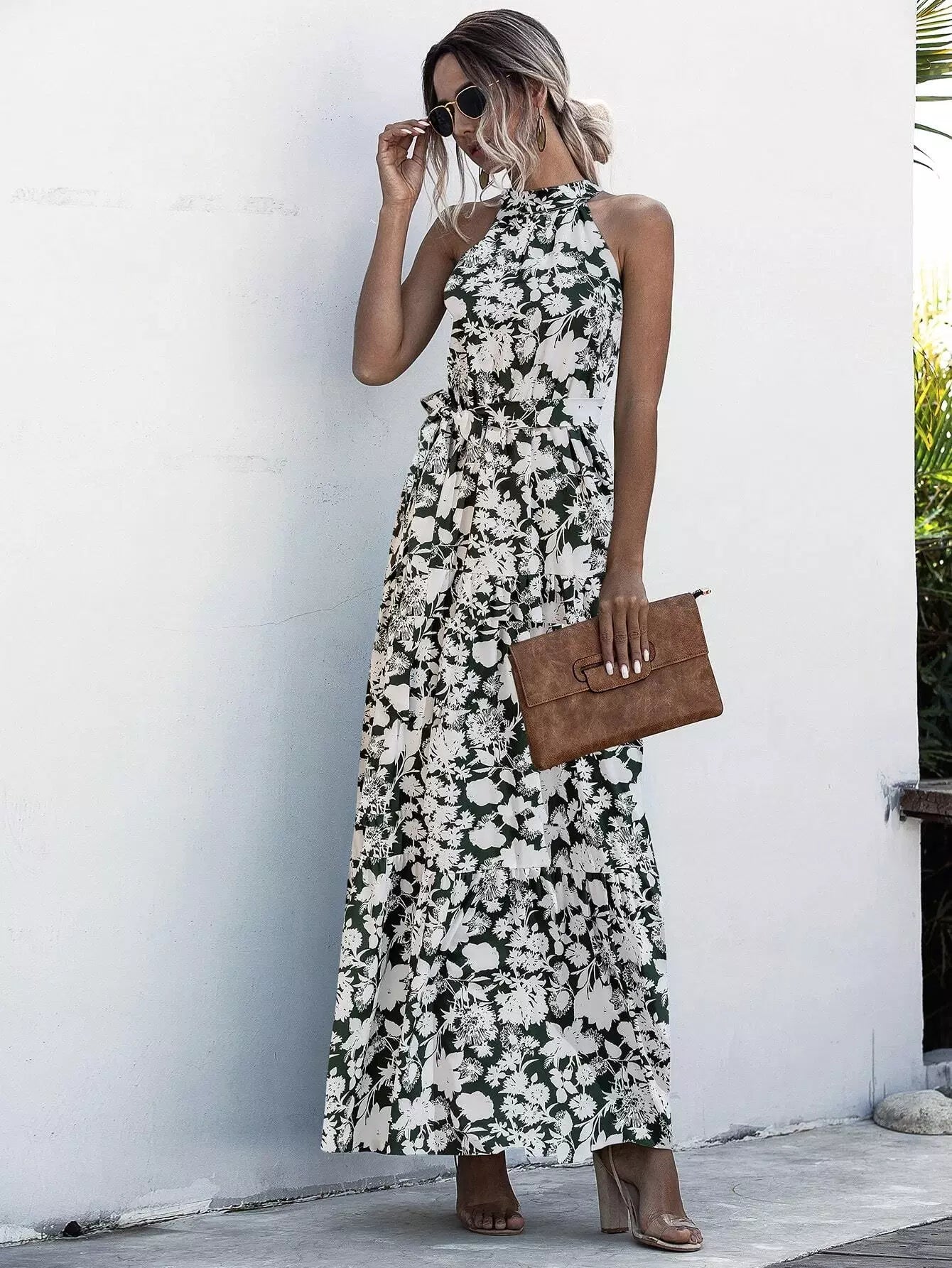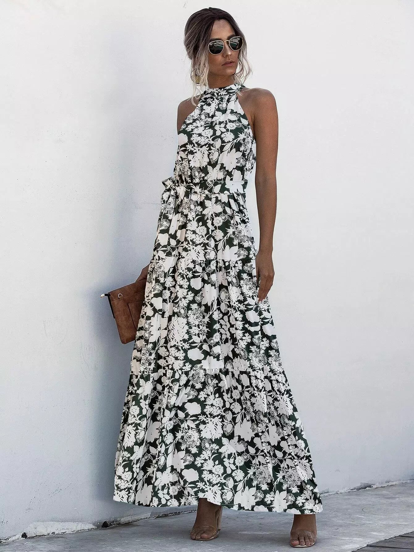 فستان هالتر بطباعة الأزهار بالكامل بدون حزام