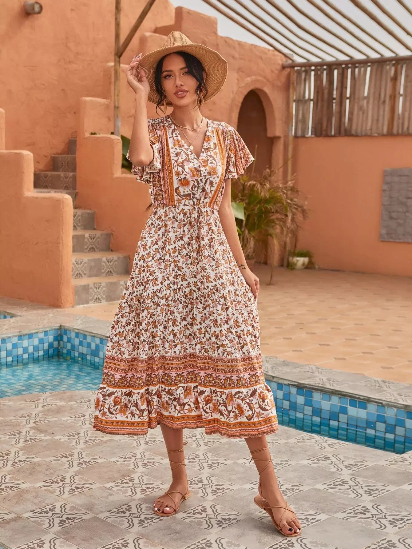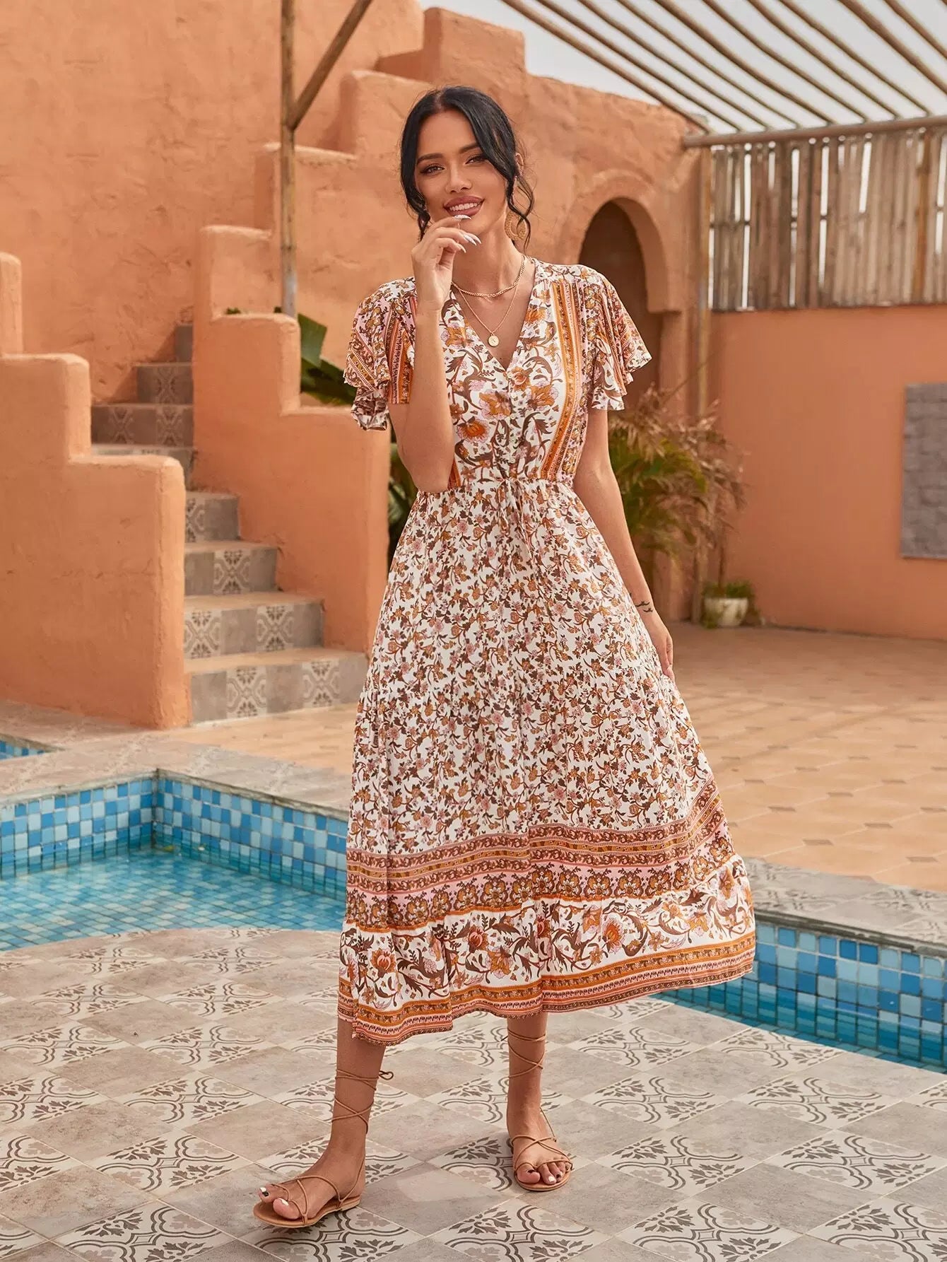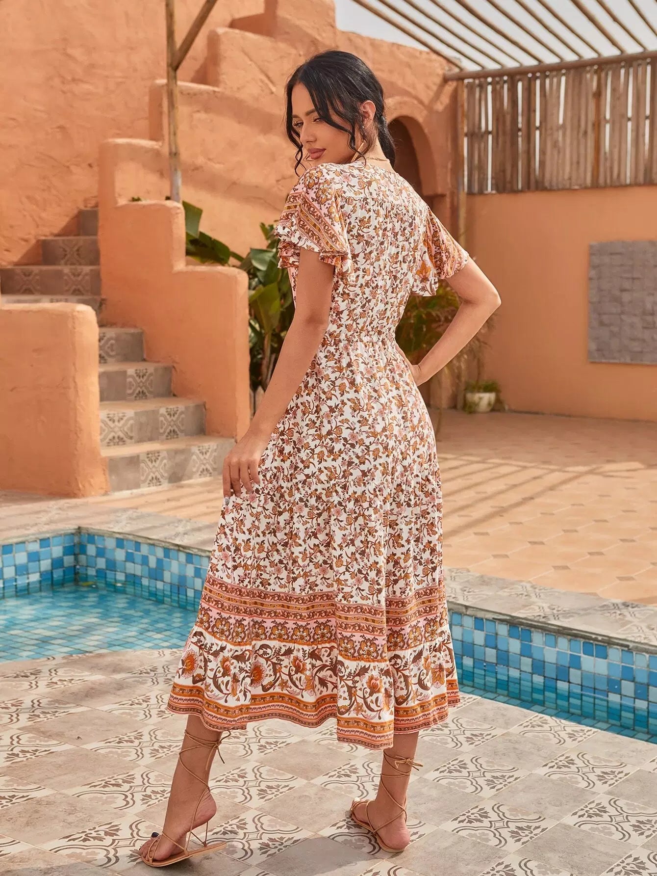 فستان بأكمام على شكل فراشة مطبوع عليه زهور بالكامل