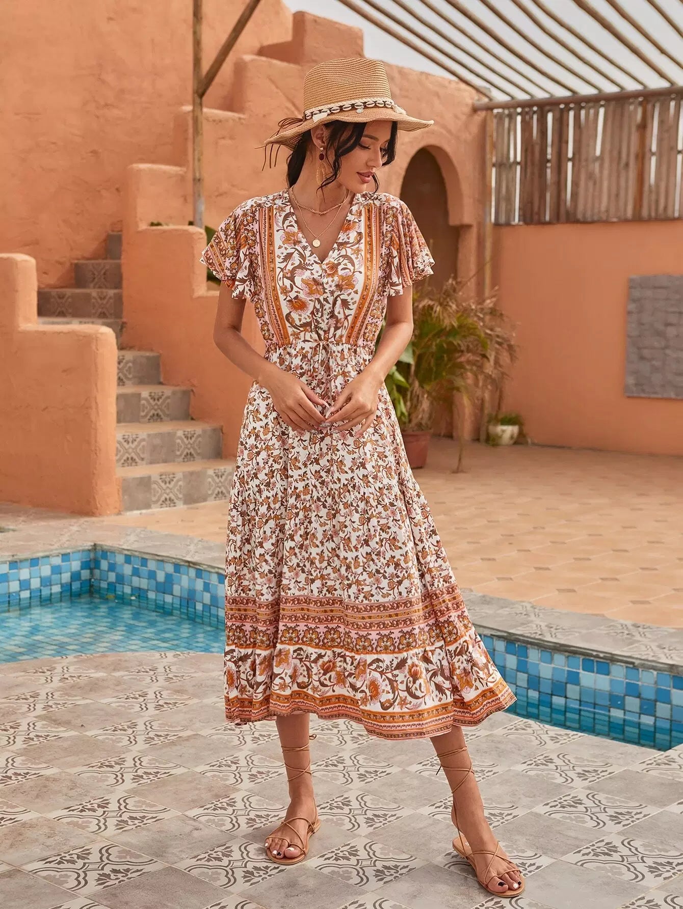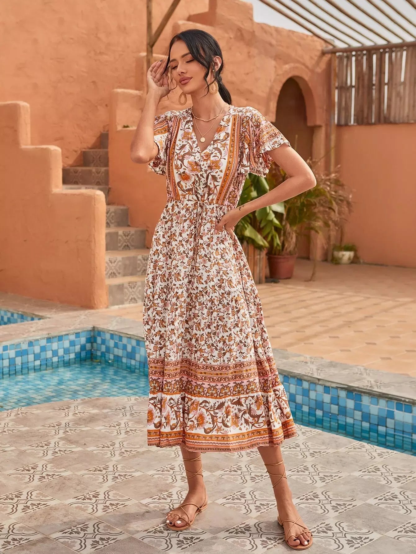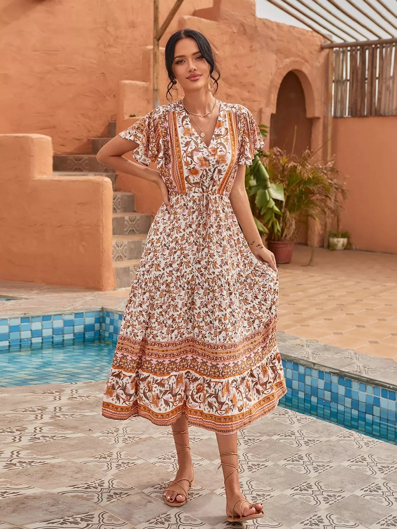 فستان بأكمام على شكل فراشة مطبوع عليه زهور بالكامل