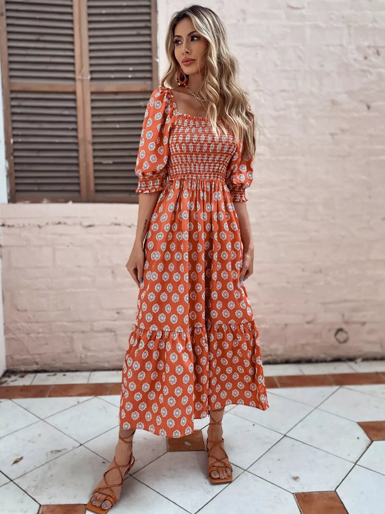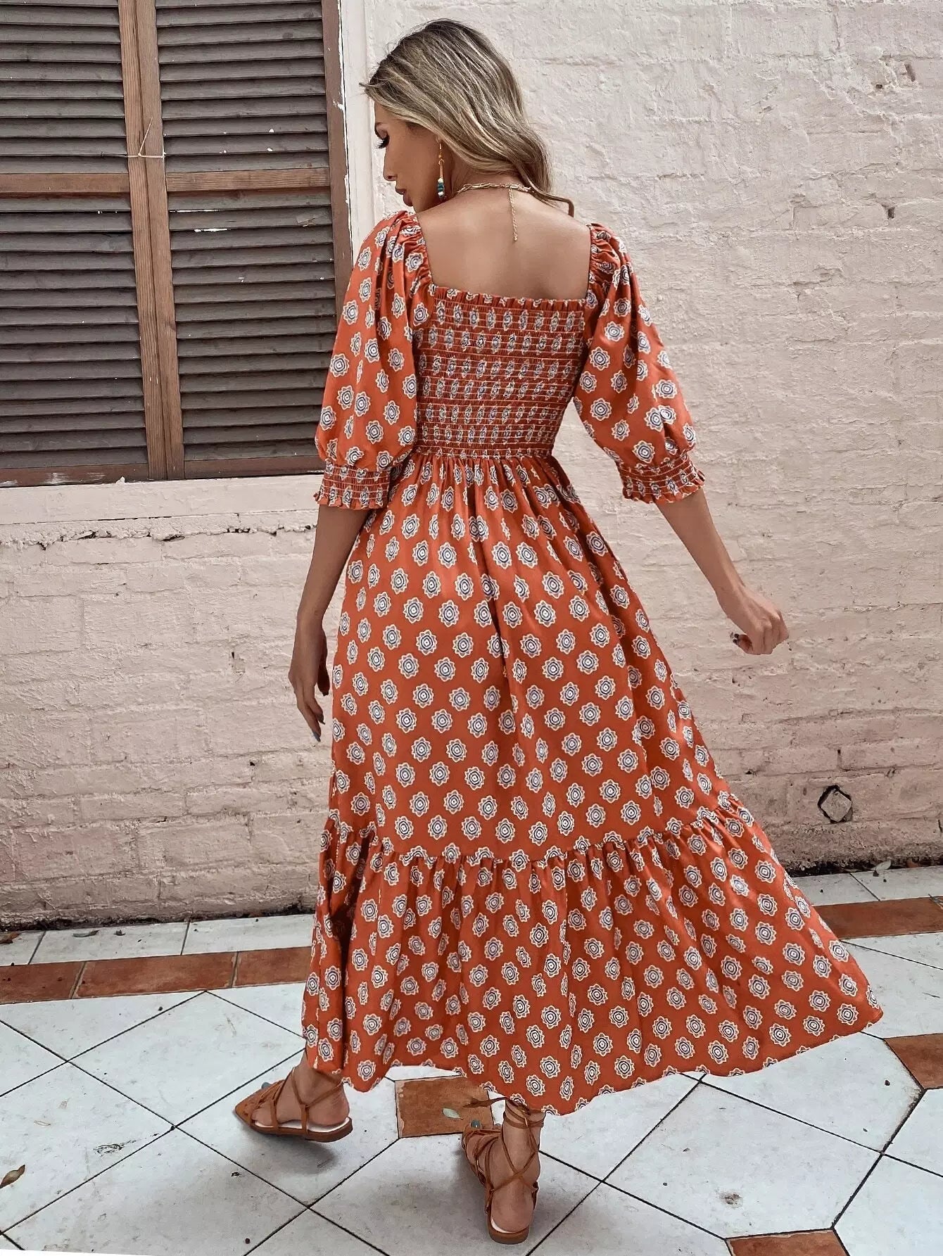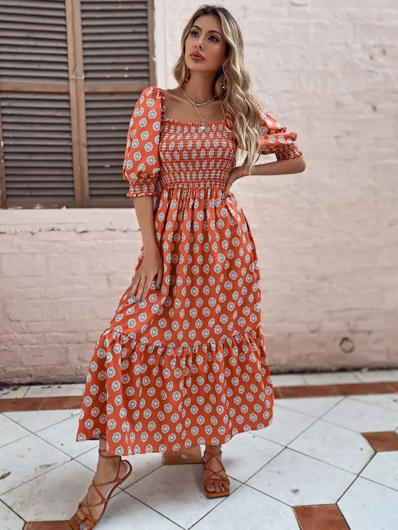 فستان بحافة كشكش مطبوع بالكامل على شكل حرف A