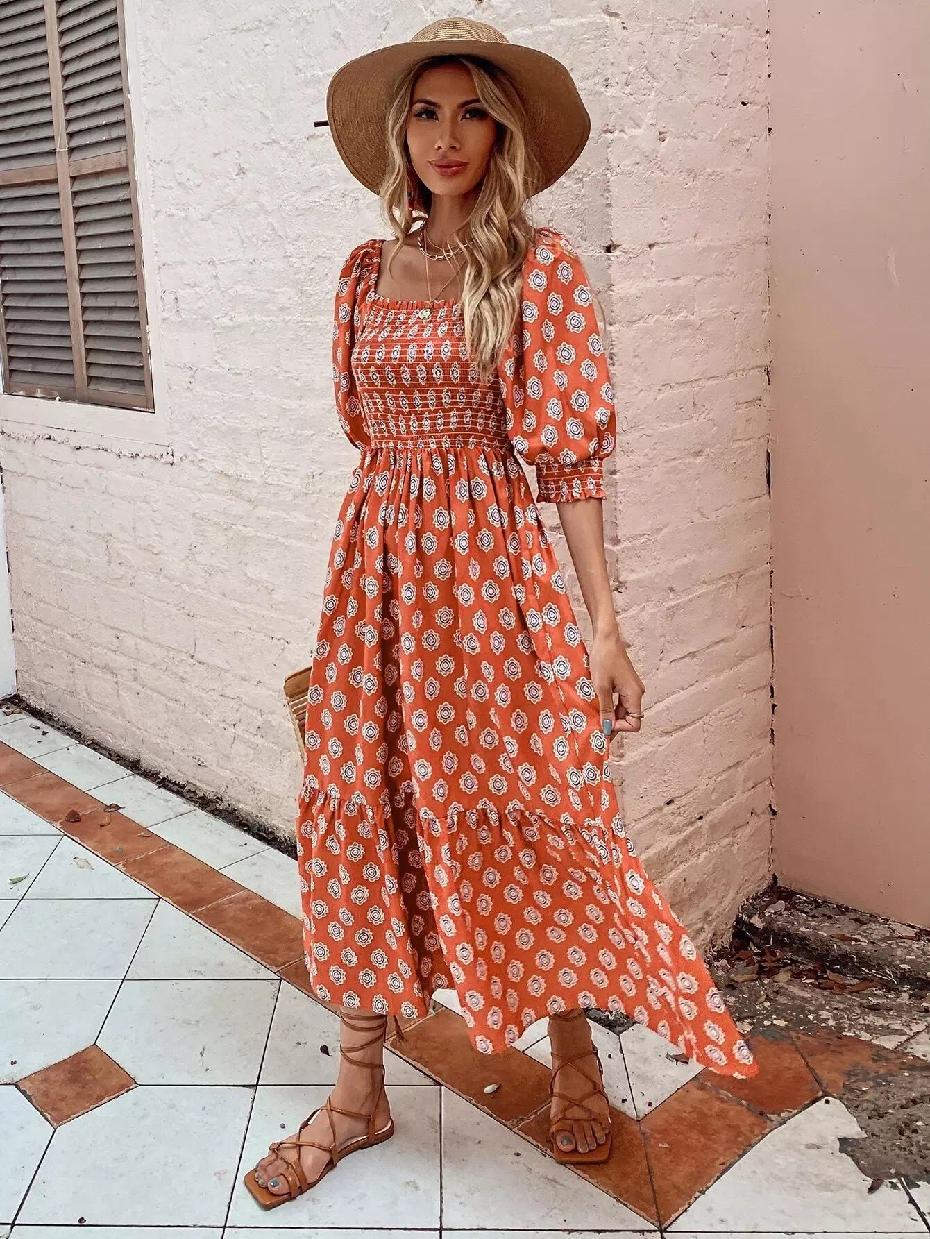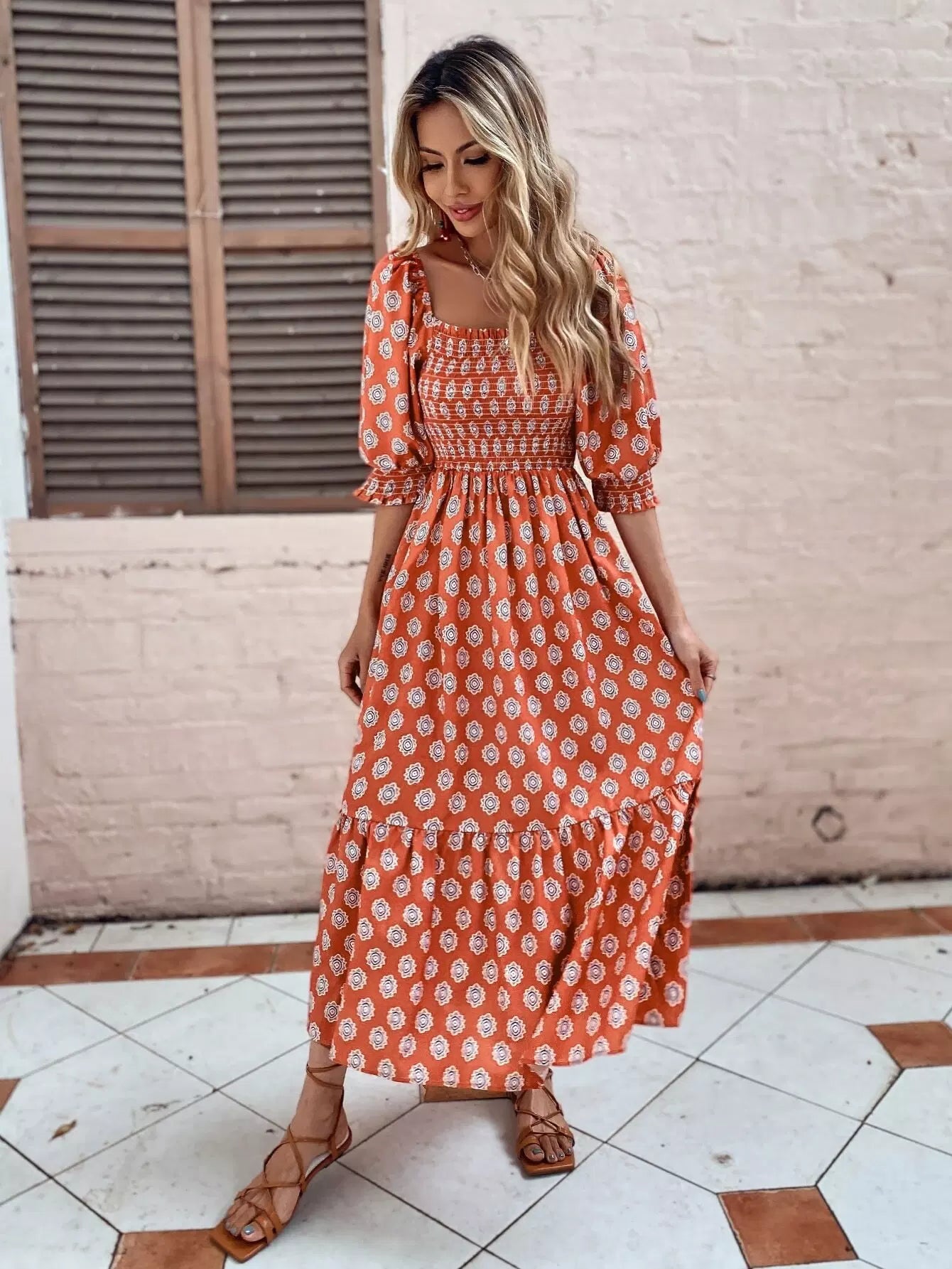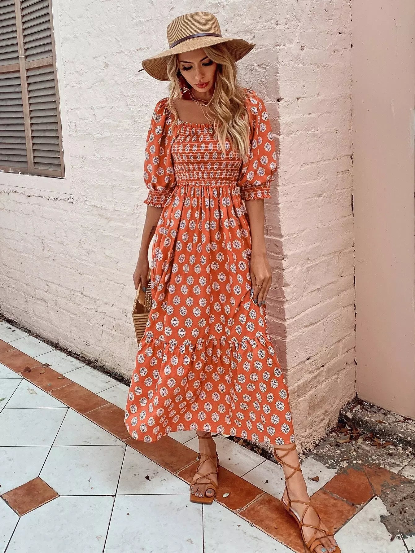 فستان بحافة كشكش مطبوع بالكامل على شكل حرف A