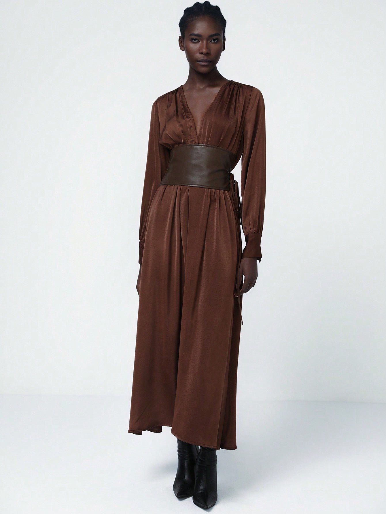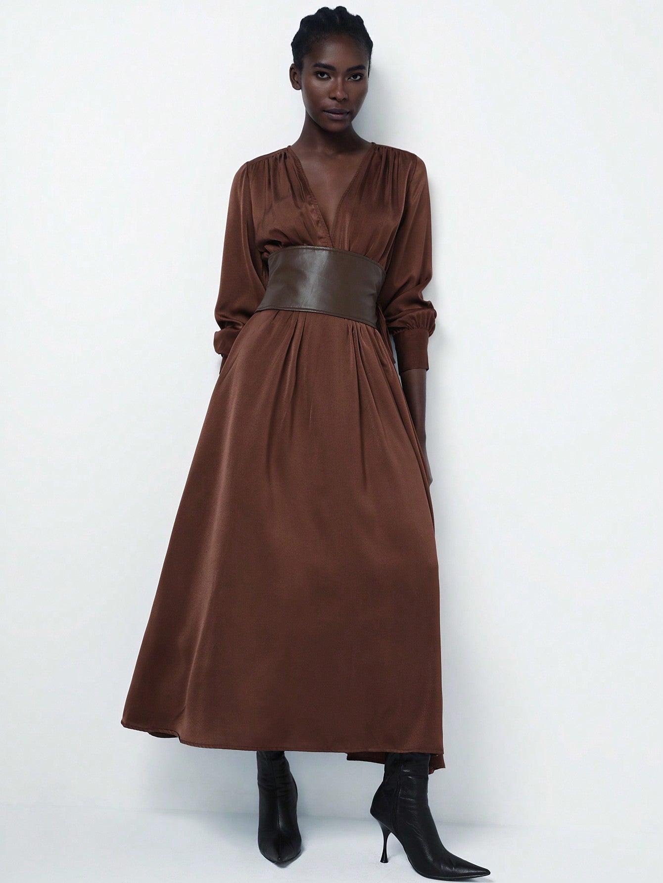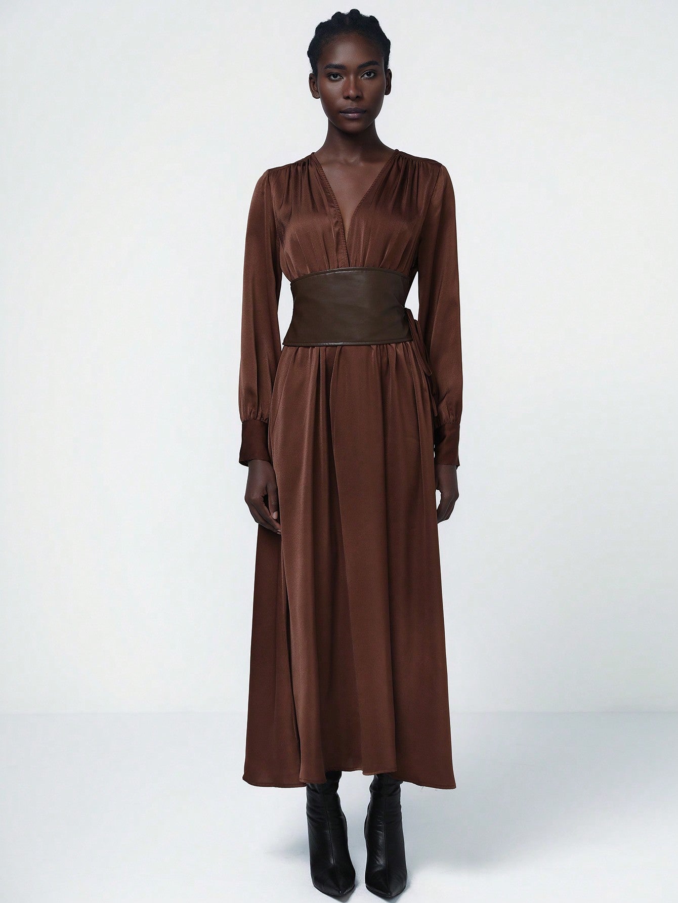 فستان أفالوريا موديتشيك ماكسي فلاير بني بأكمام طويلة ورقبة على شكل حرف V وخصر للنساء بدون حزام