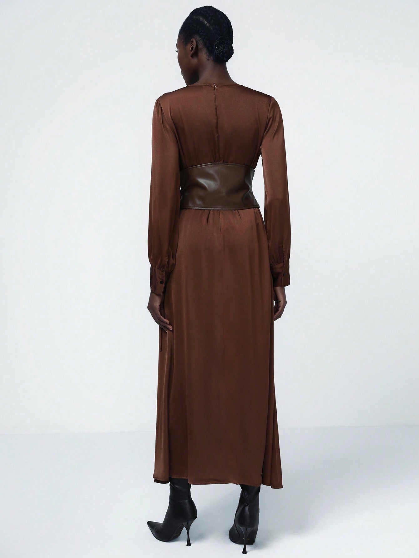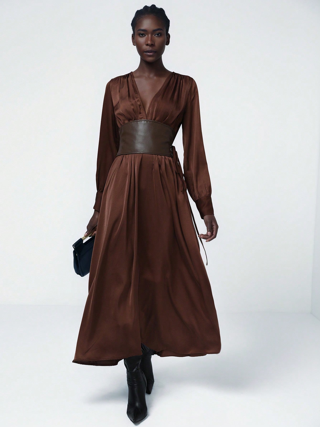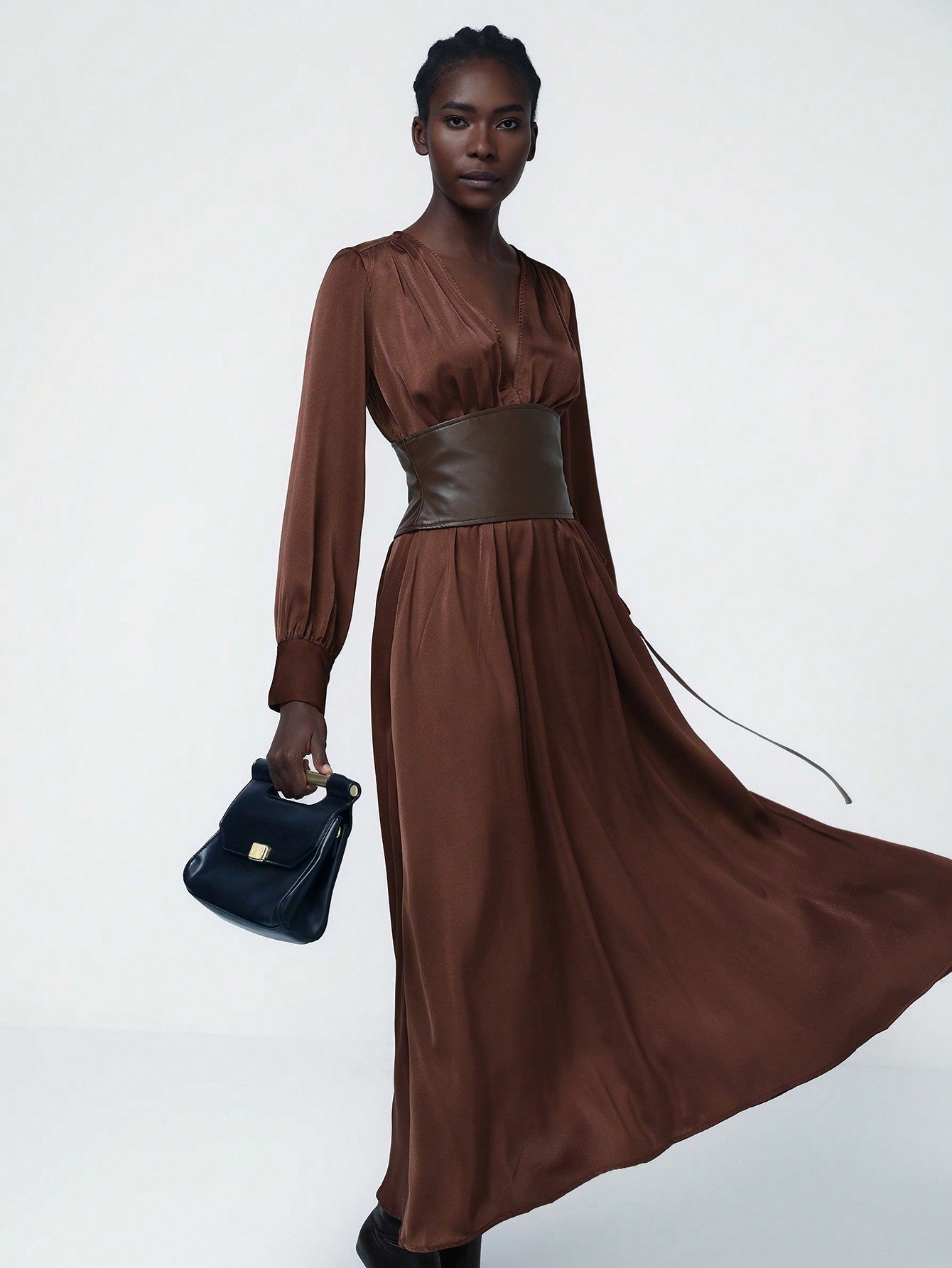 فستان أفالوريا موديتشيك ماكسي فلاير بني بأكمام طويلة ورقبة على شكل حرف V وخصر للنساء بدون حزام