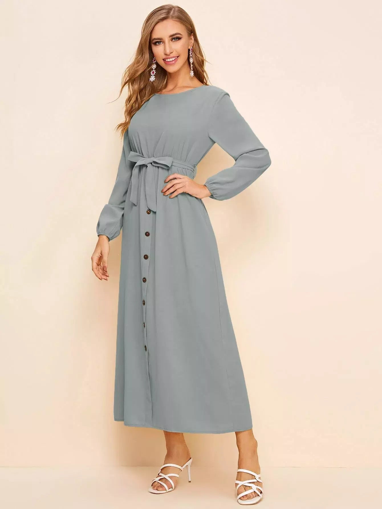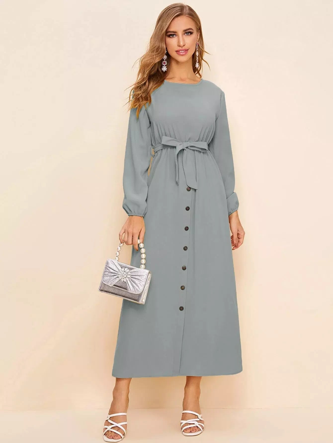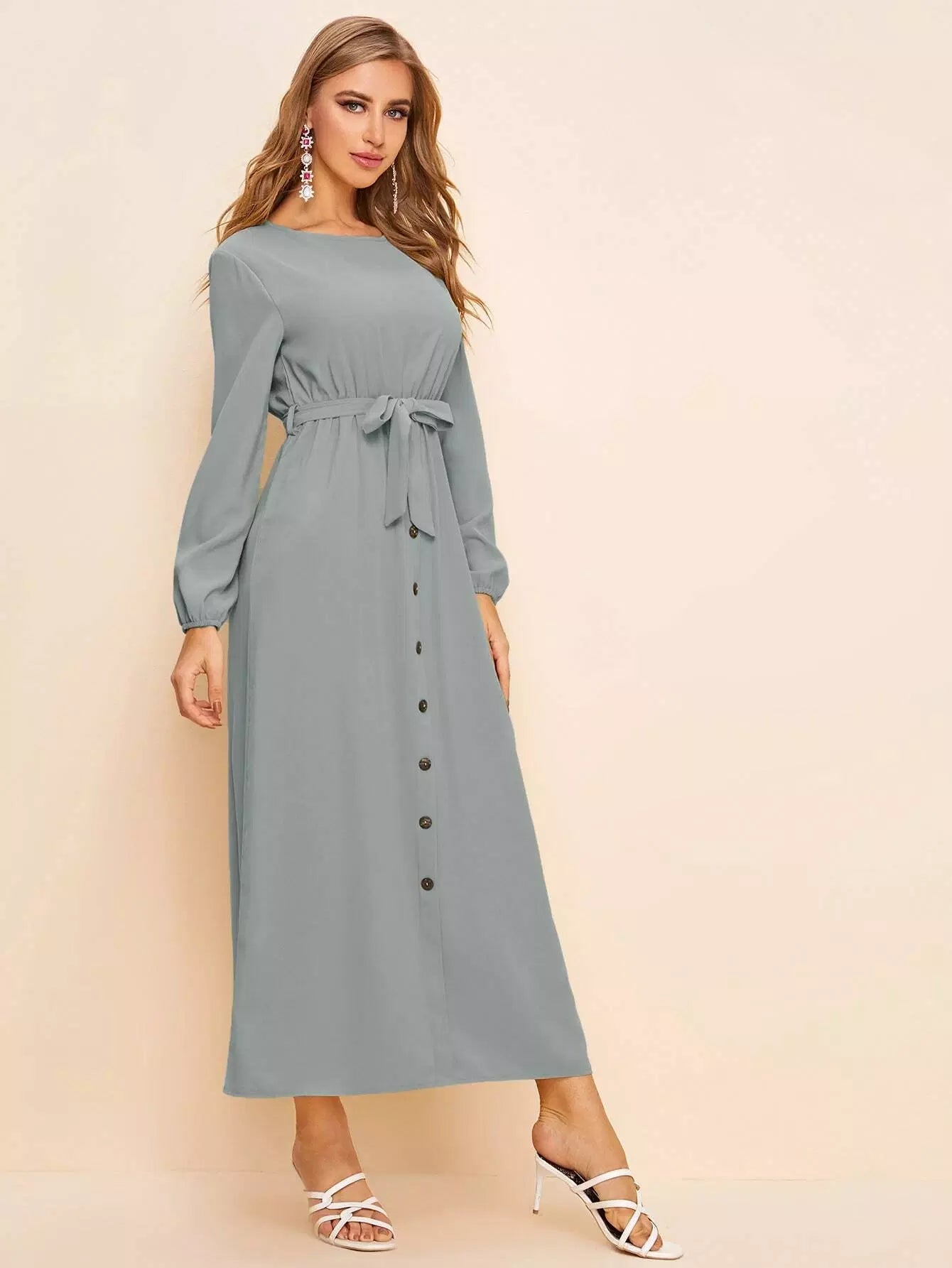 فستان طويل بأزرار أمامية وفتحة خلفية بدون حزام