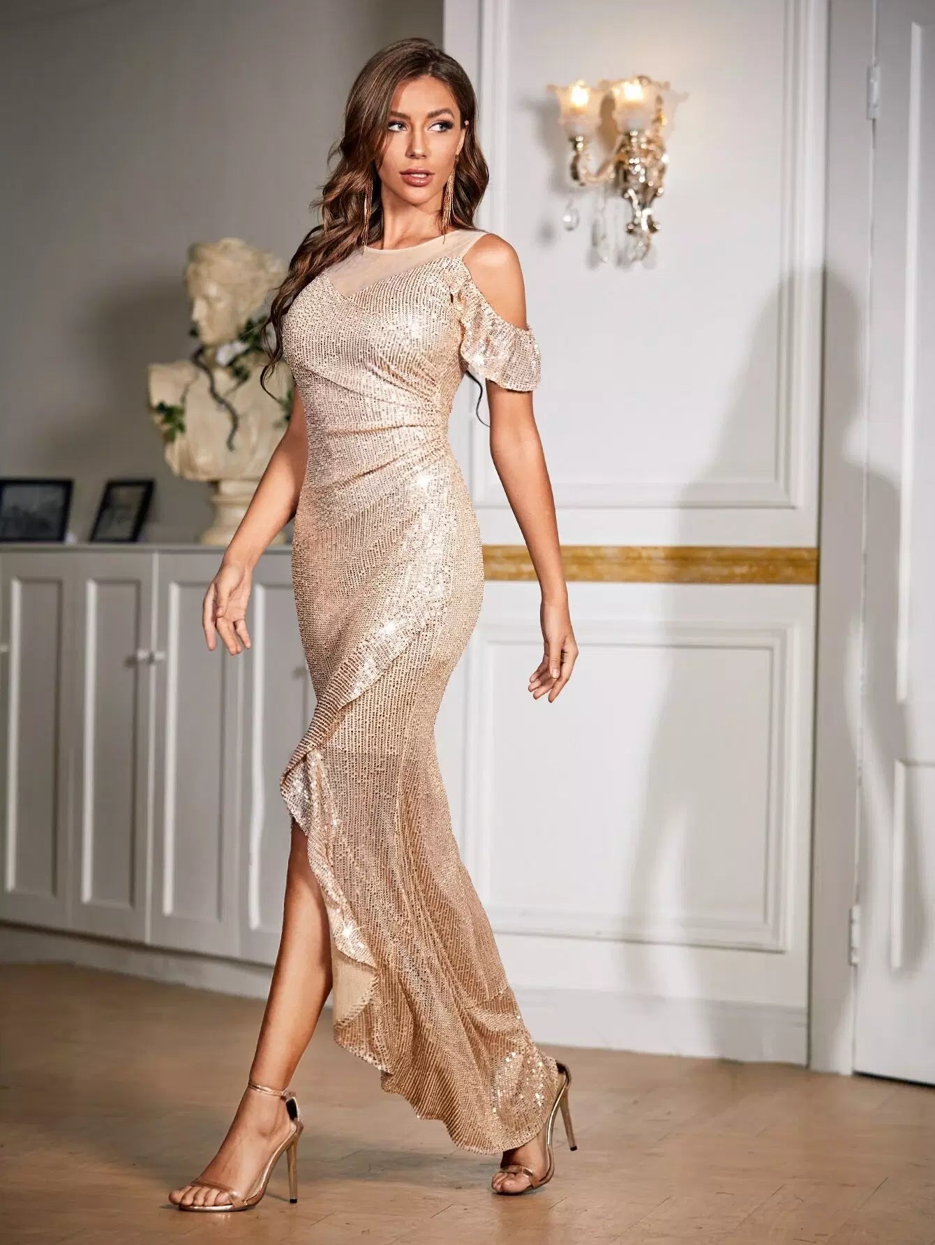 فستان كشكش غير متماثل بحافة كشكش بارد الأكتاف من الترتر