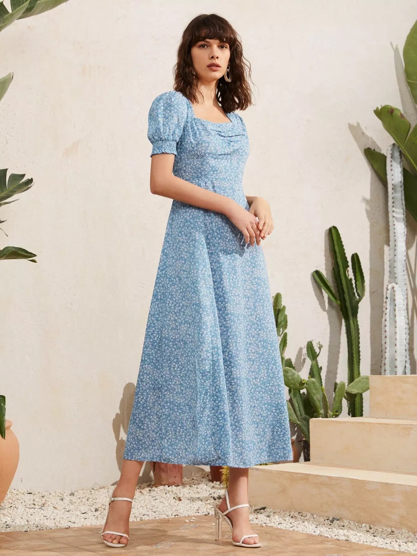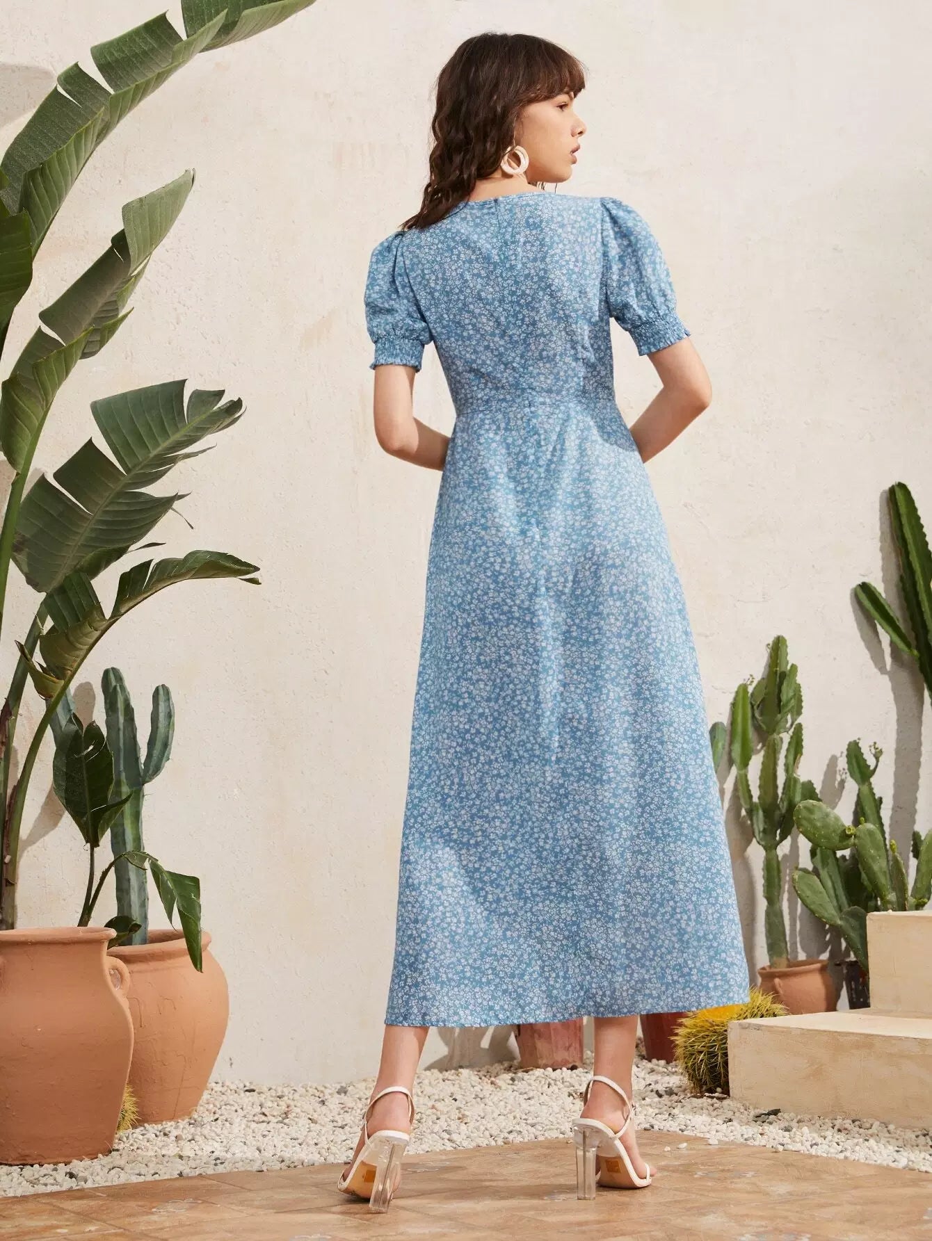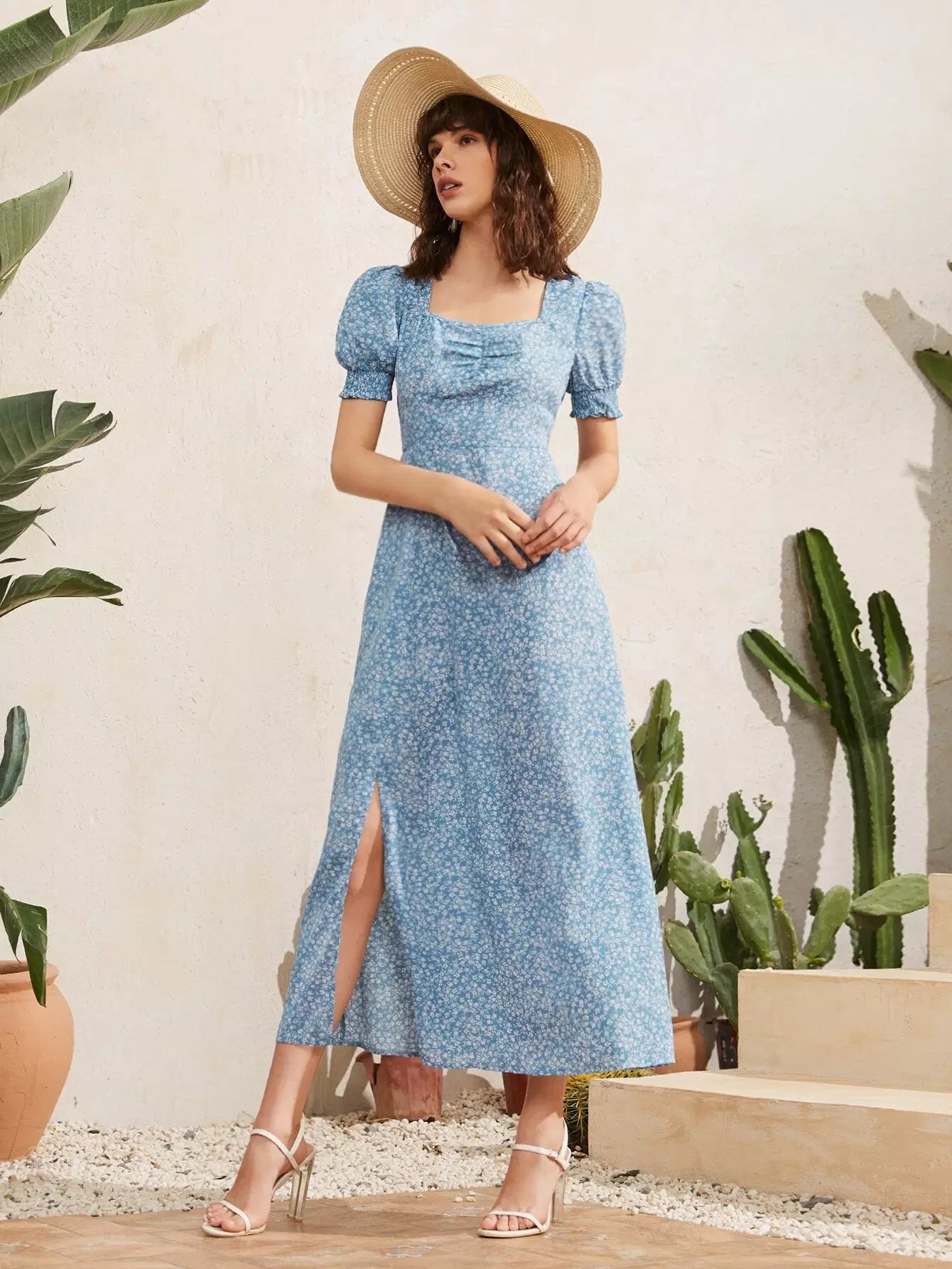 فستان ديتسي مزين بالورود مشقوق الفخذين