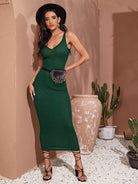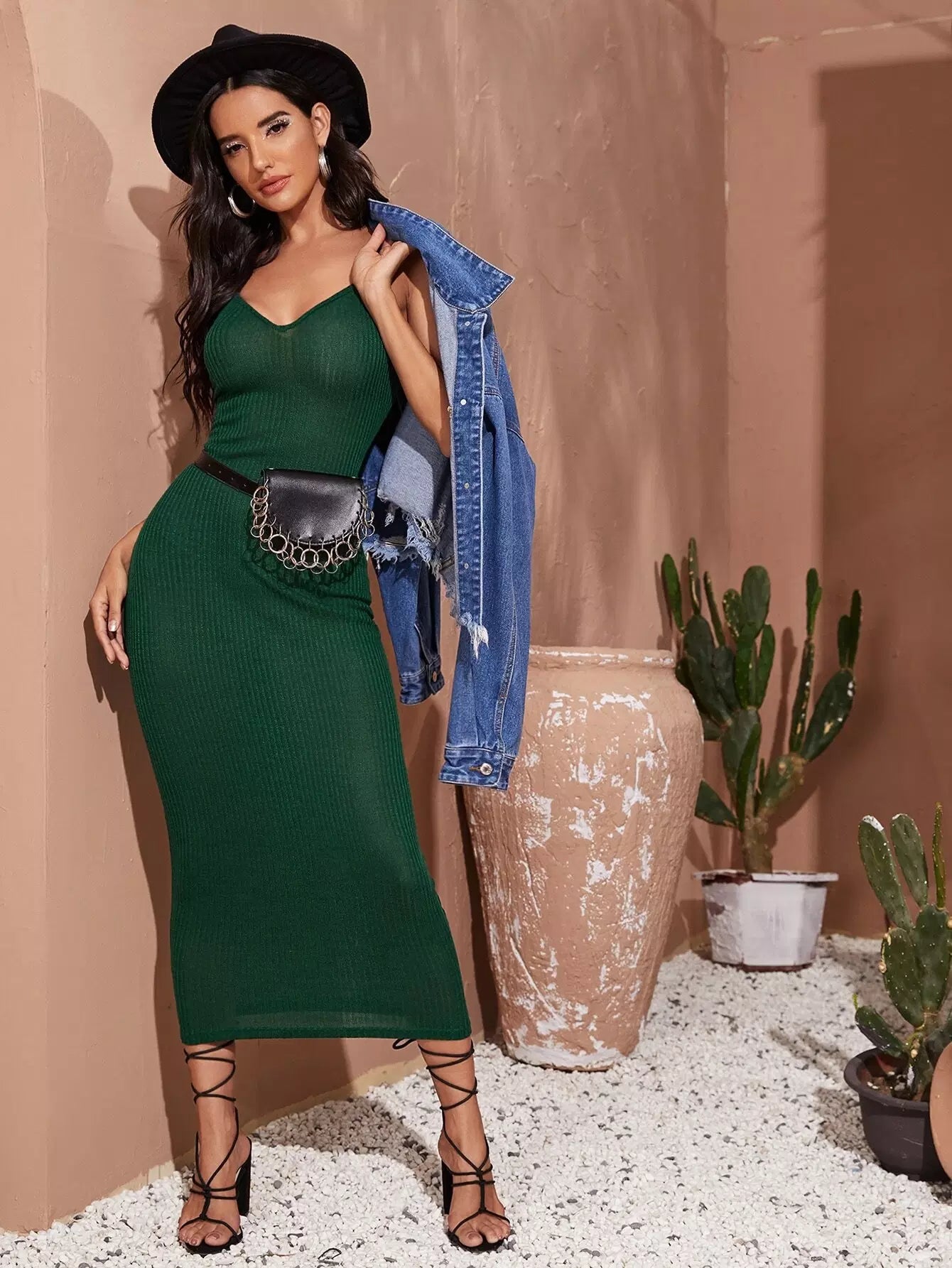 فستان بياقة مزدوجة على شكل حرف V برقبة مزدوجة محبوكة على شكل ضلع بدون حقيبة