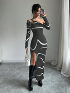 فستان إلينزجا بطبعة جرافيتي تجريدية غير متماثل بأكمام طويلة ومنفصل