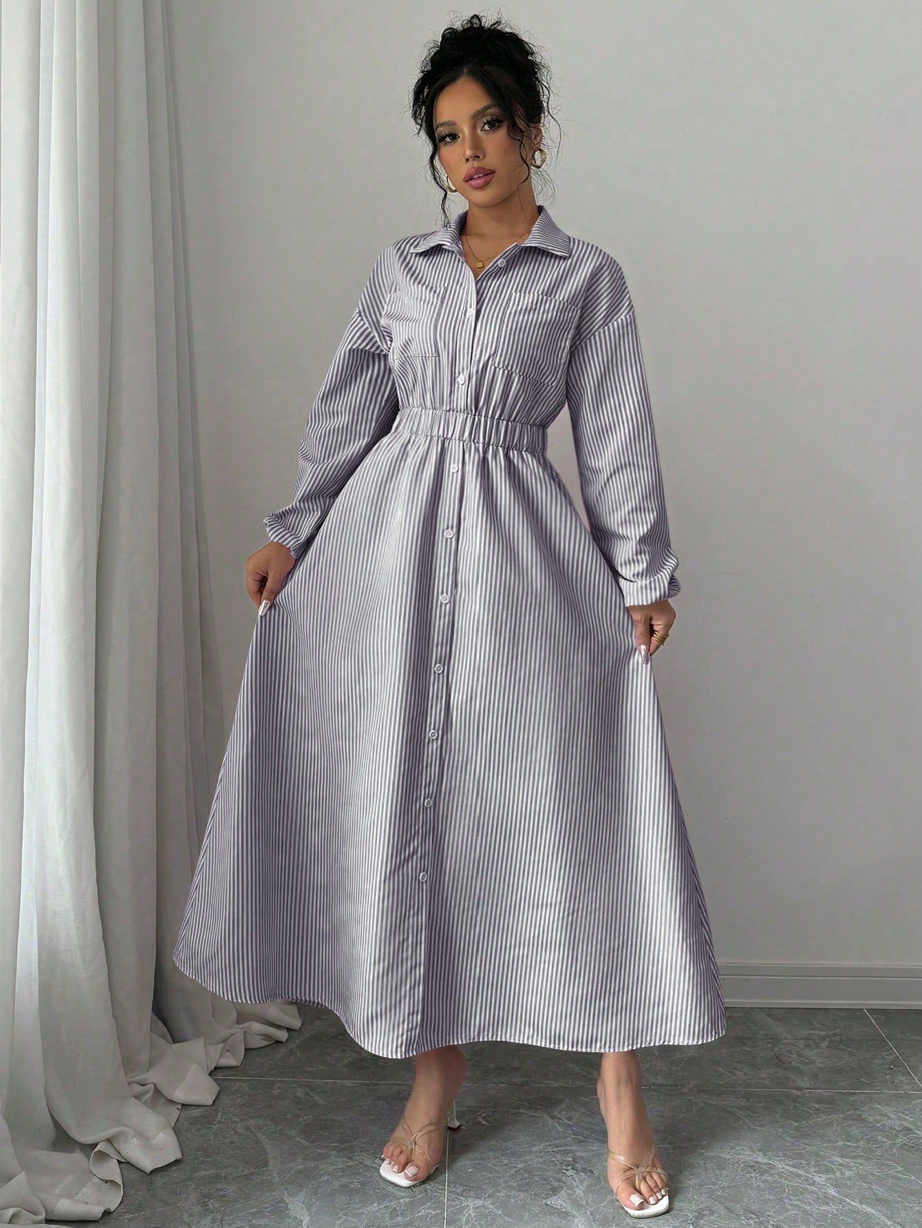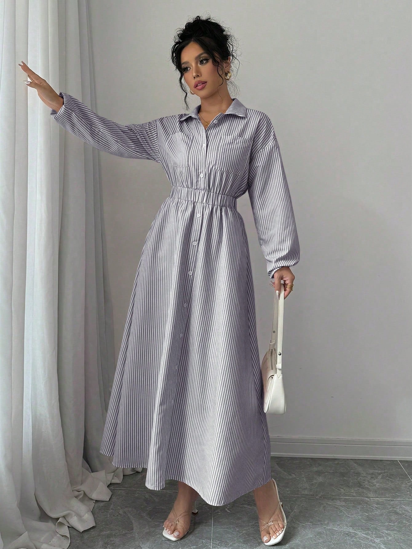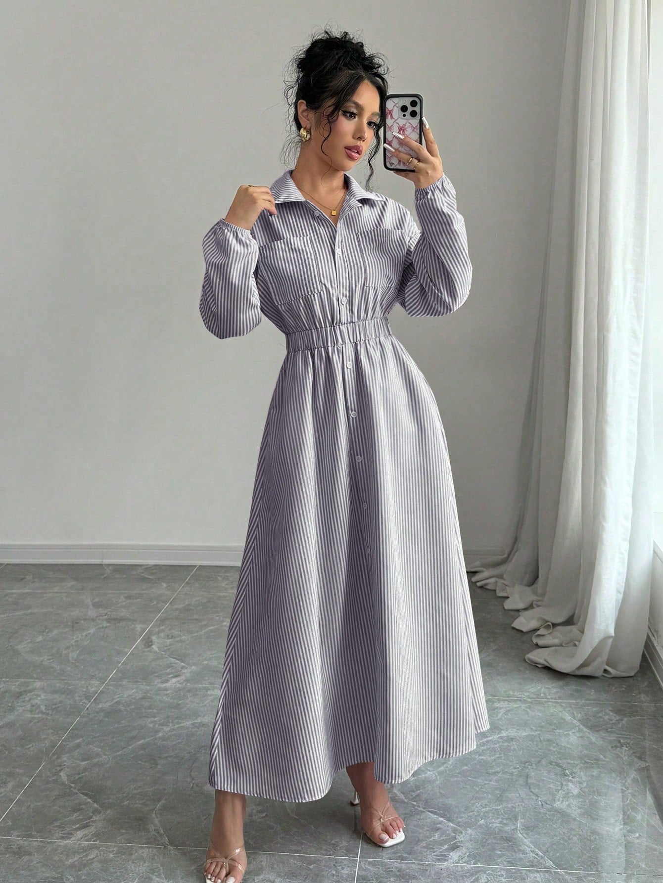 فستان إلينزجا النسائي ذو القميص المخطط ذو الأزرار الأمامية، مناسب لفصل الربيع والخريف، بتصميم ماكسي