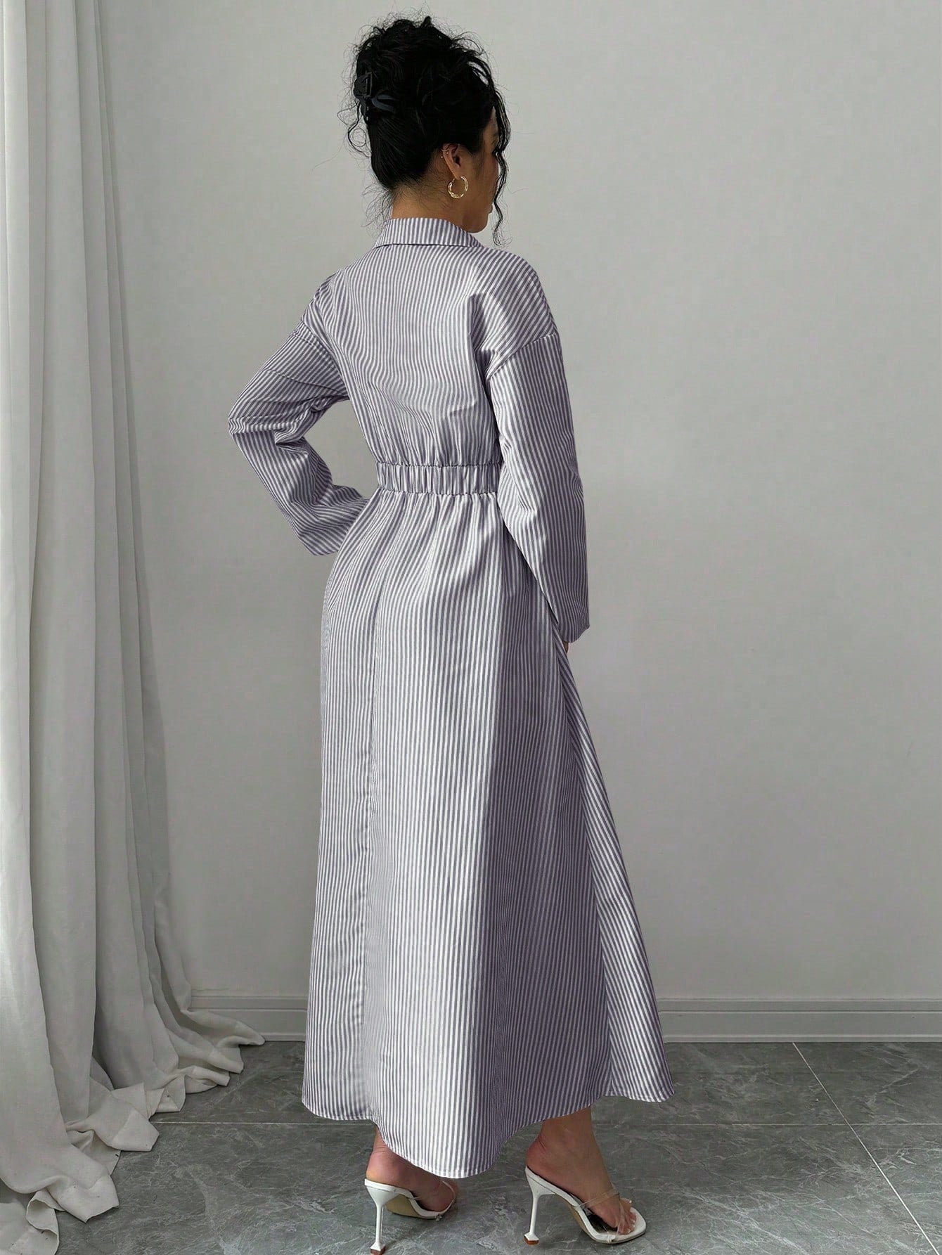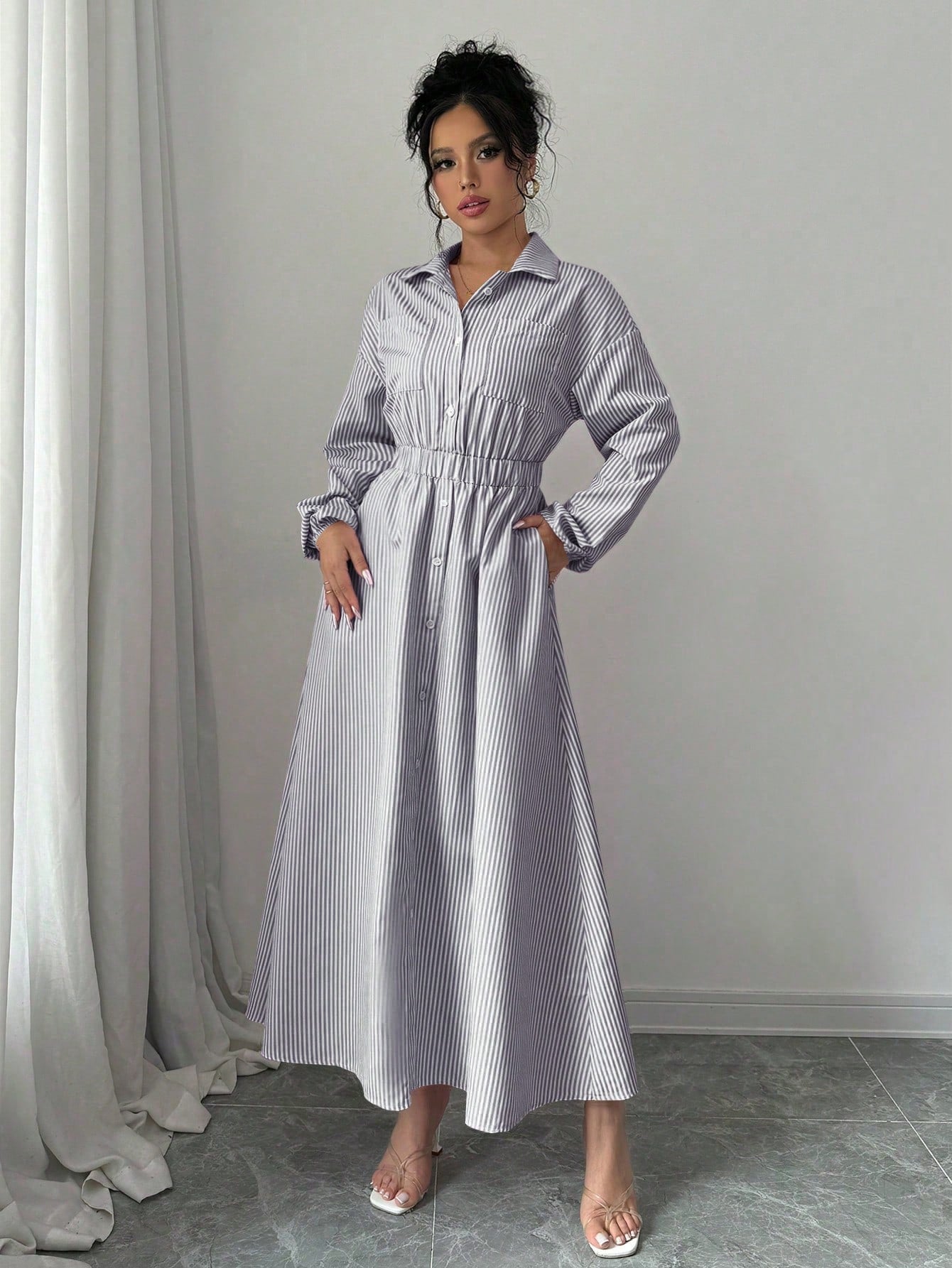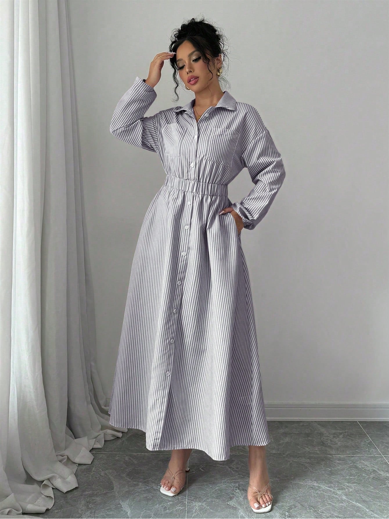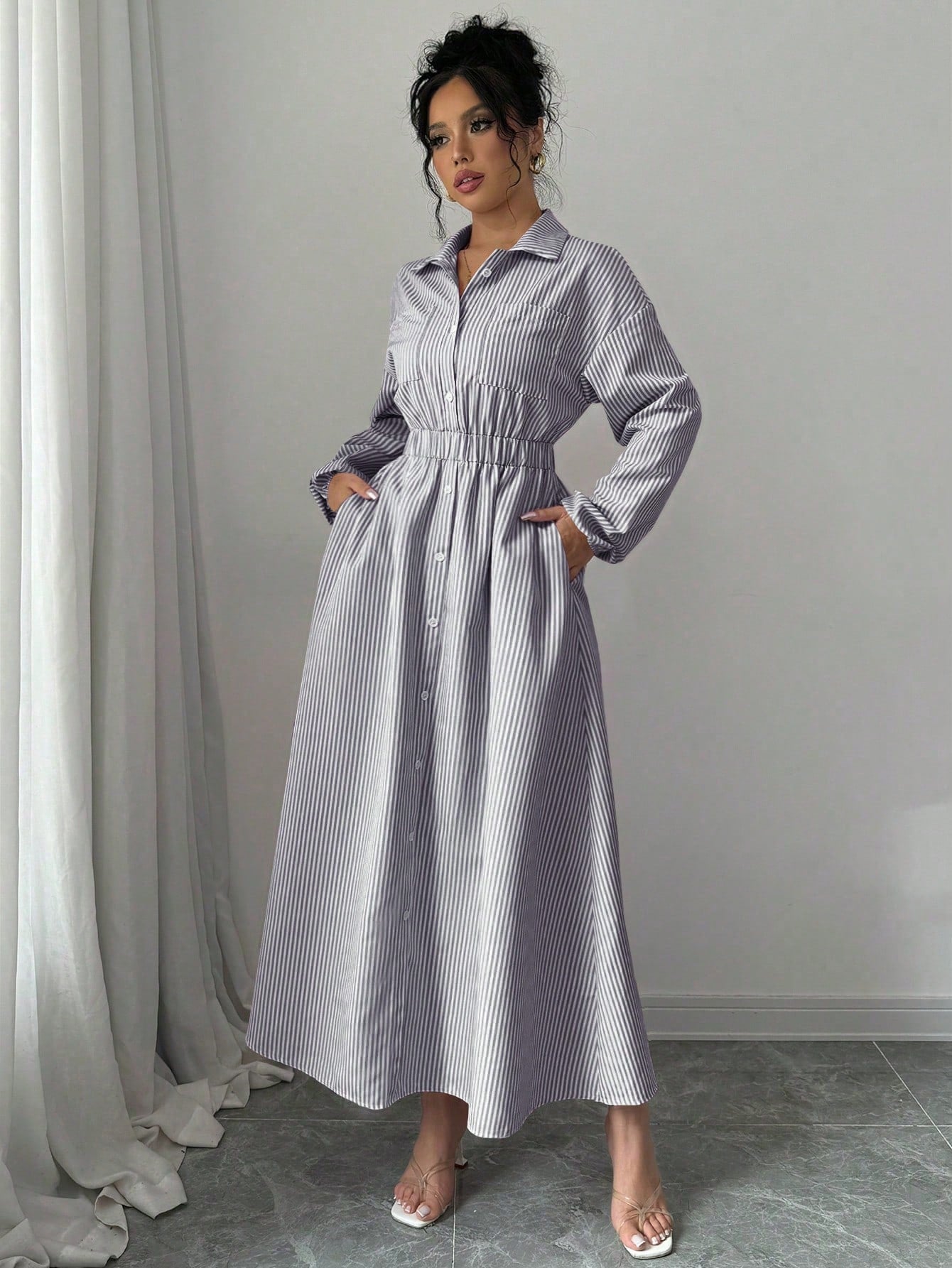فستان إلينزجا النسائي ذو القميص المخطط ذو الأزرار الأمامية، مناسب لفصل الربيع والخريف، بتصميم ماكسي