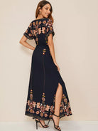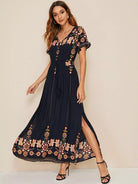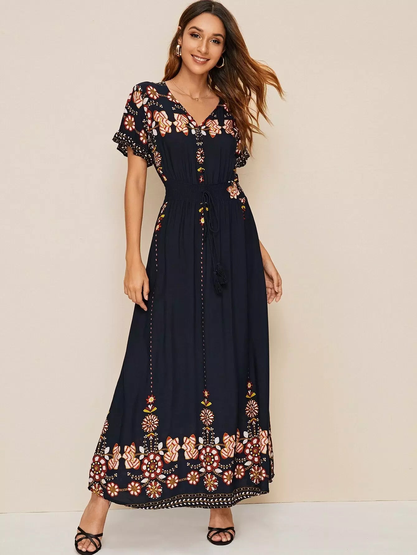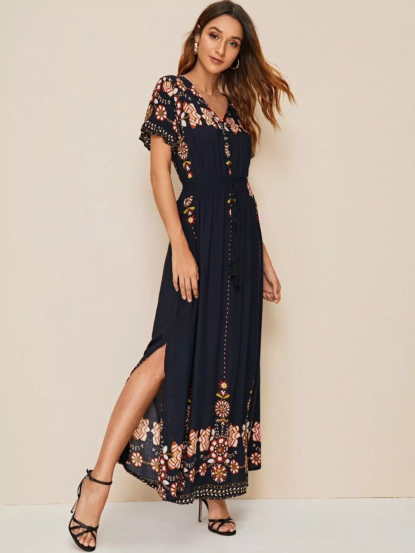 فستان مزين بطبعة زهور مطبوع بشراشيب على الخصر مشقوق الحاشية