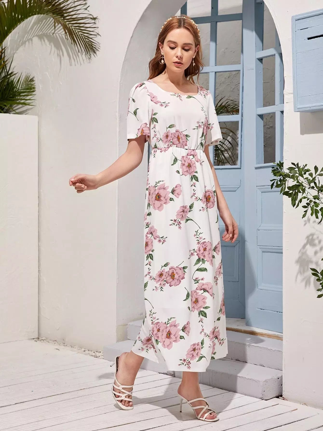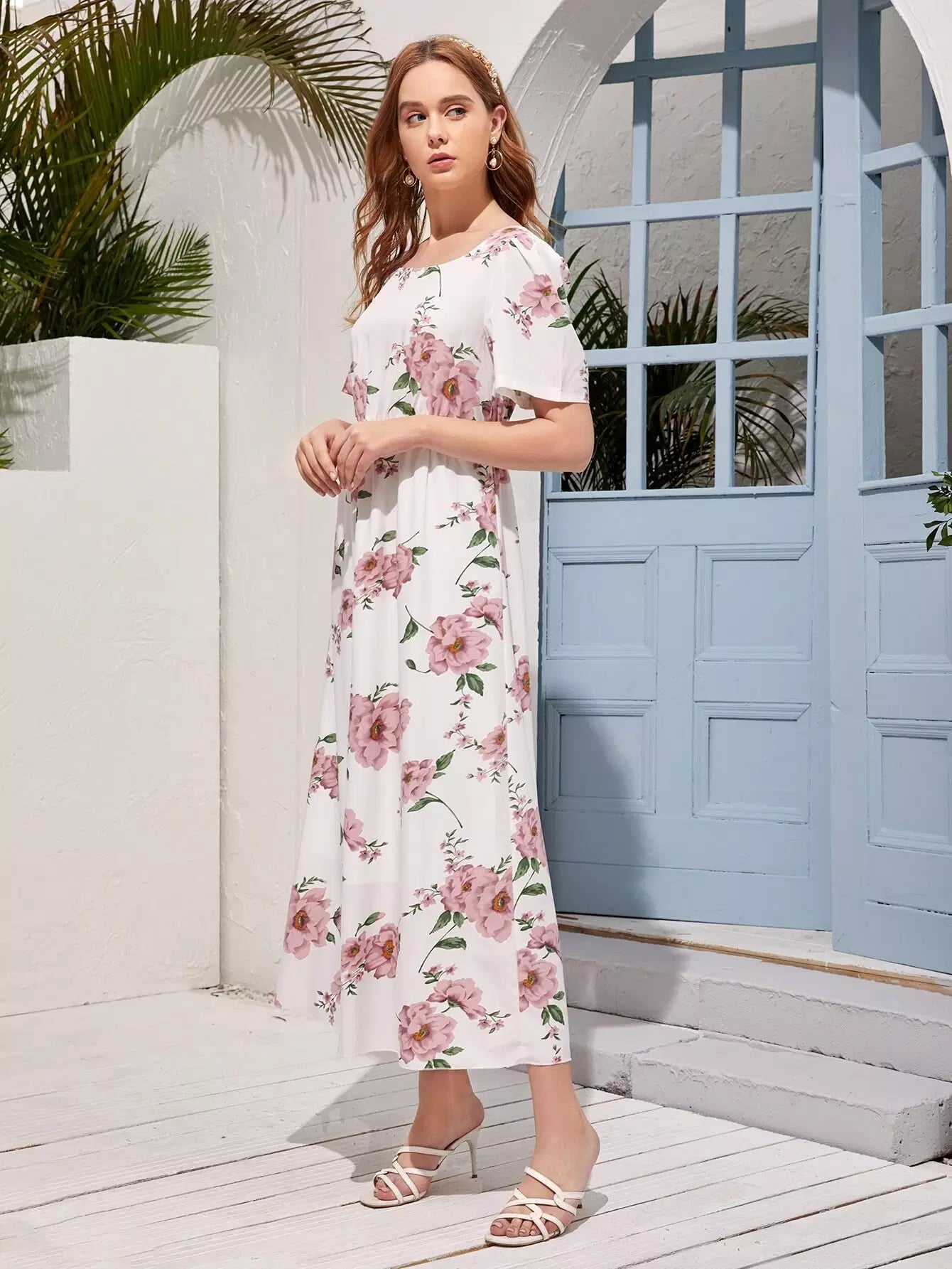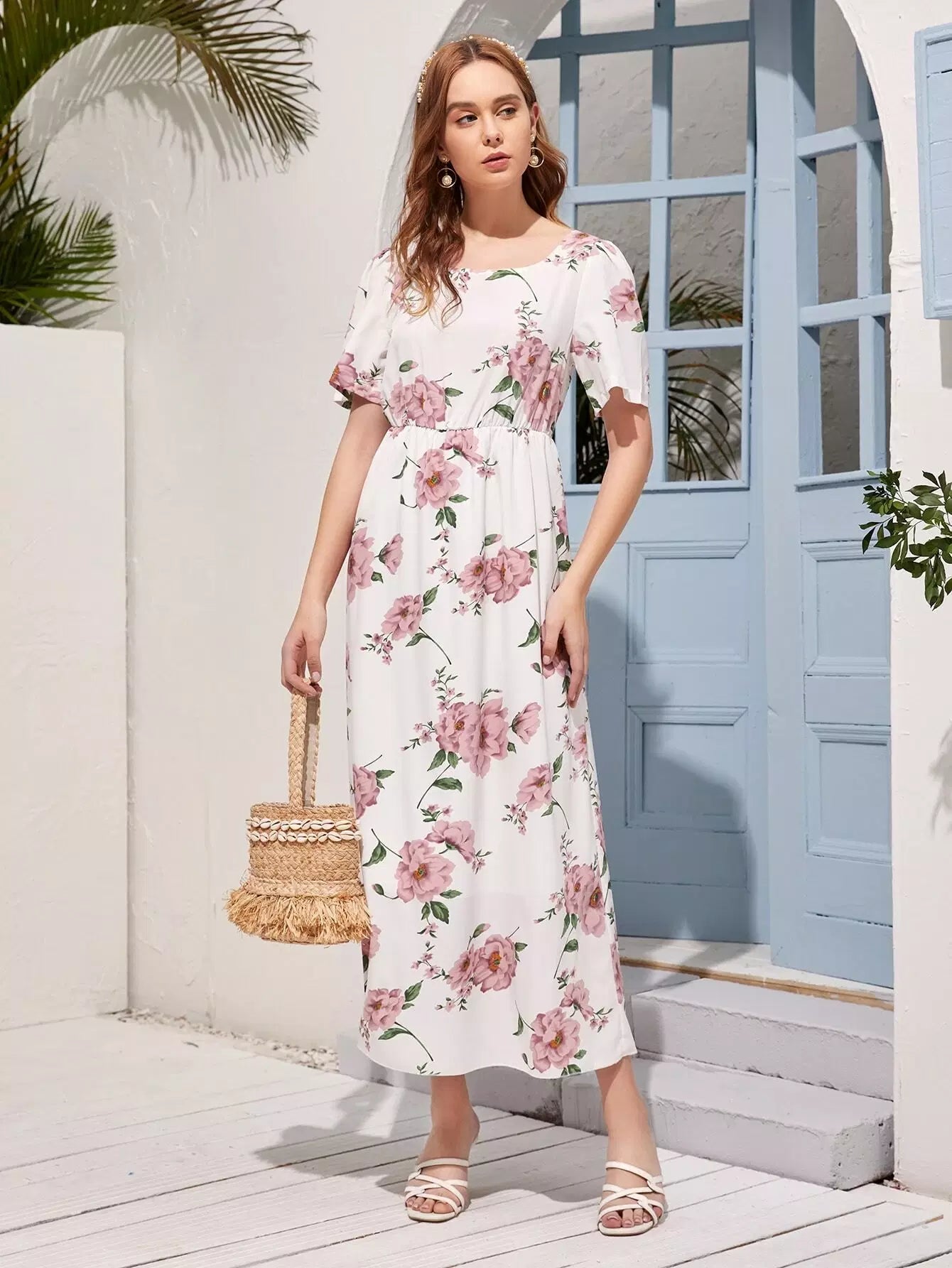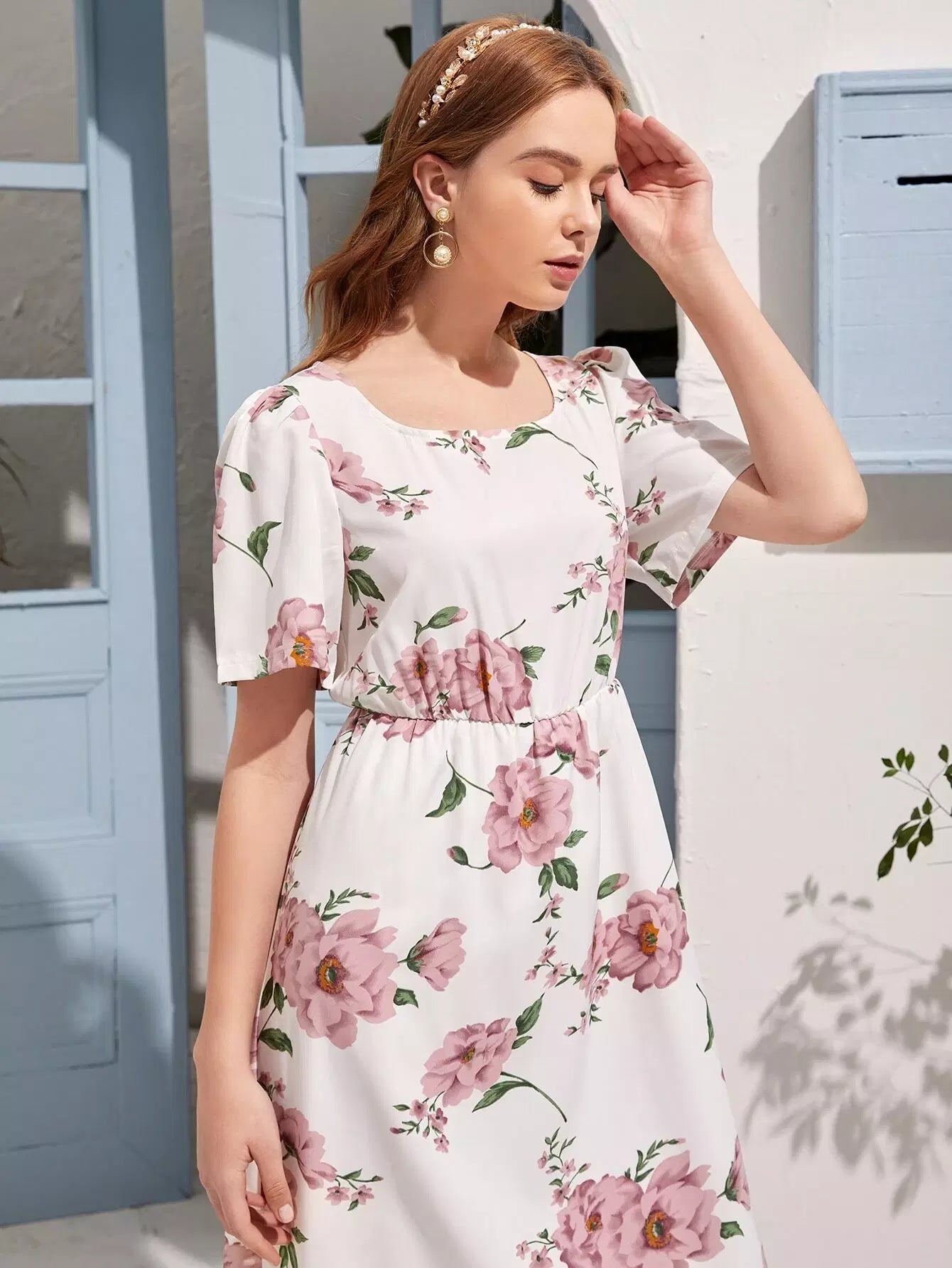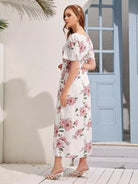 فستان بطبعة زهور مطبوع بخصر عالٍ على شكل حرف A