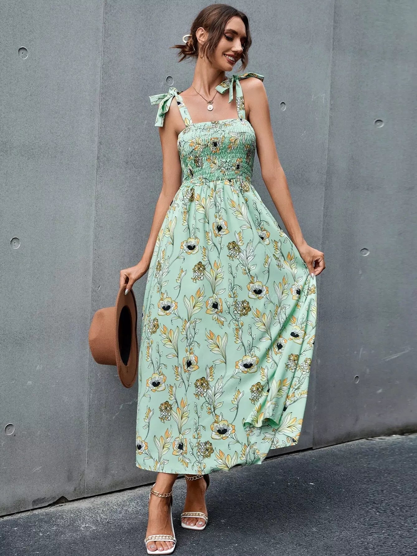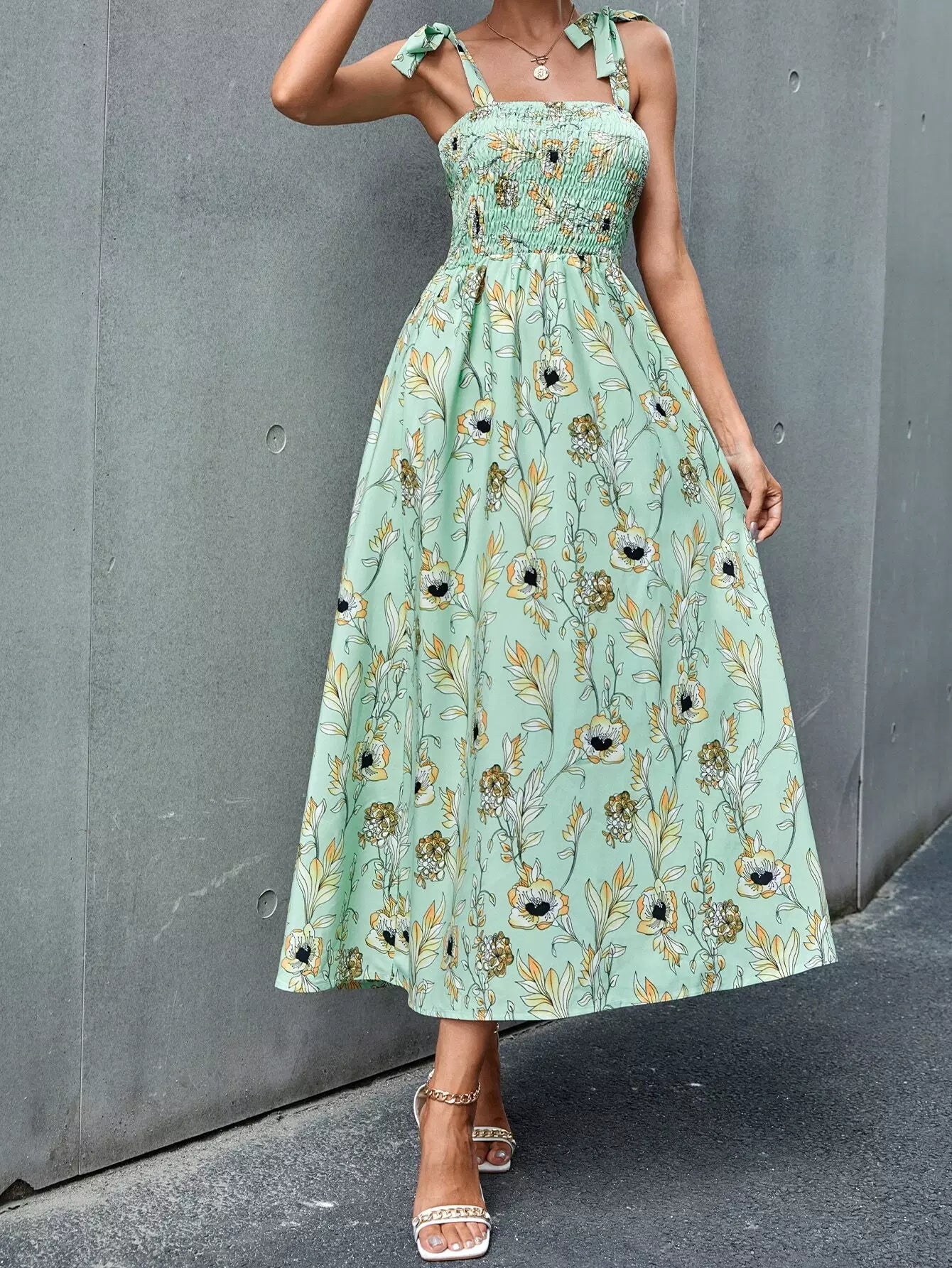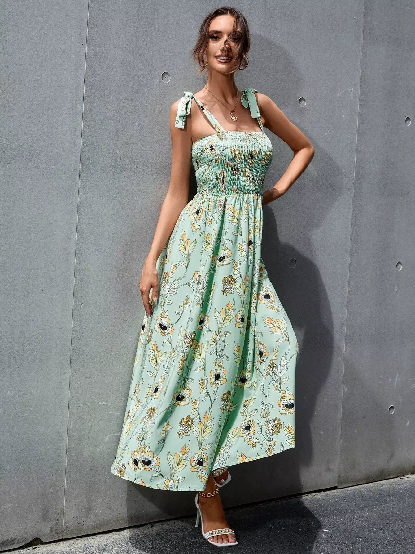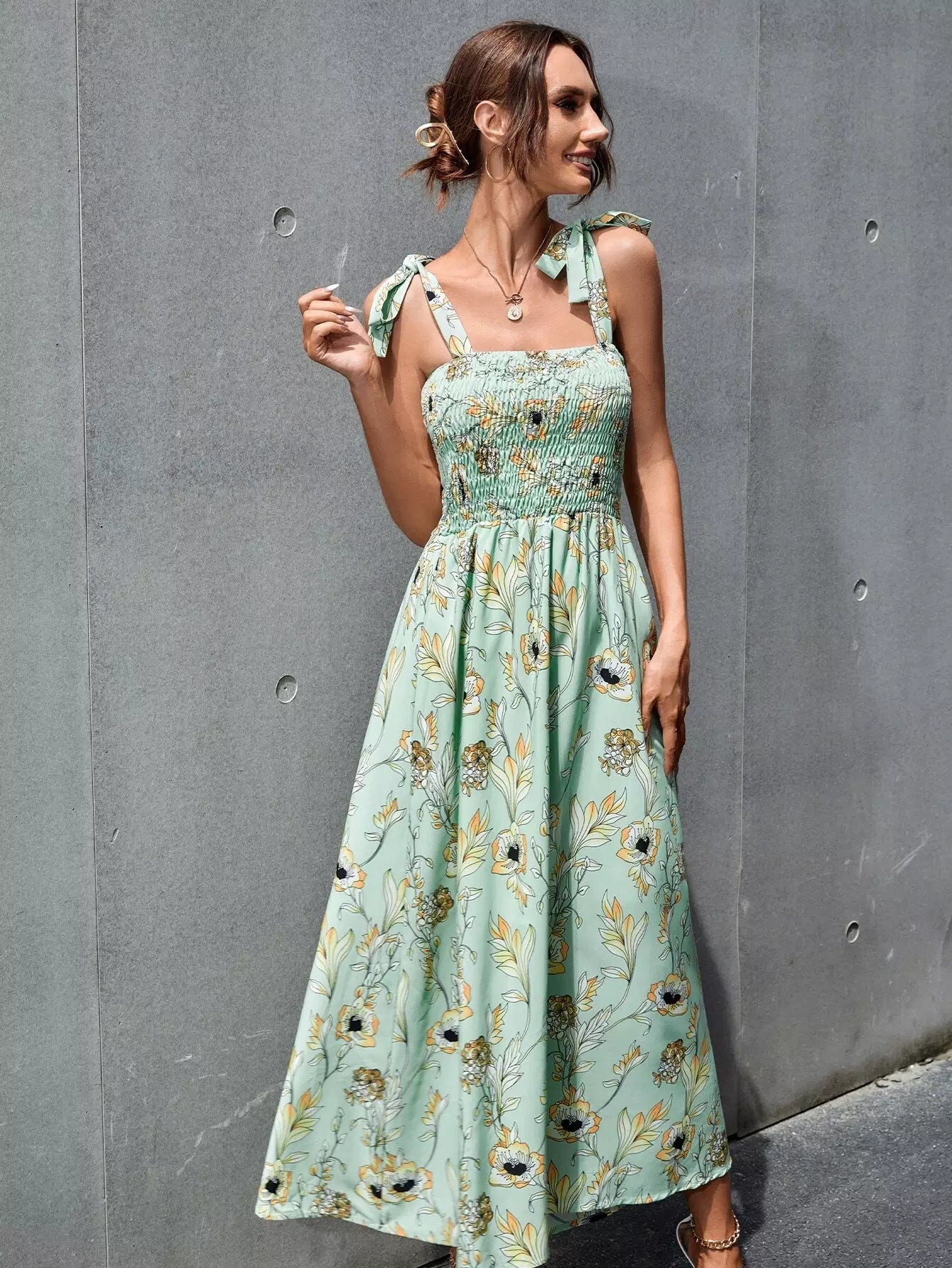 فستان كامي بطبعة زهور وحمالات عقدة وصدرية مكشكشة