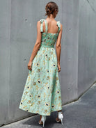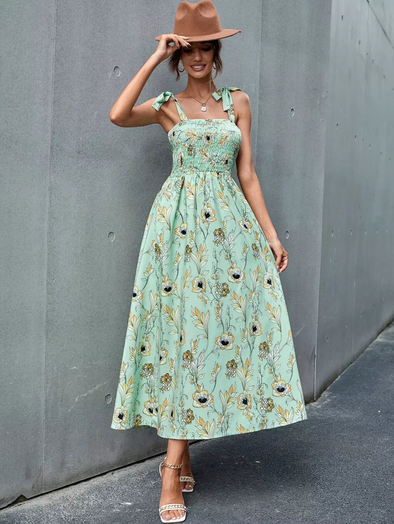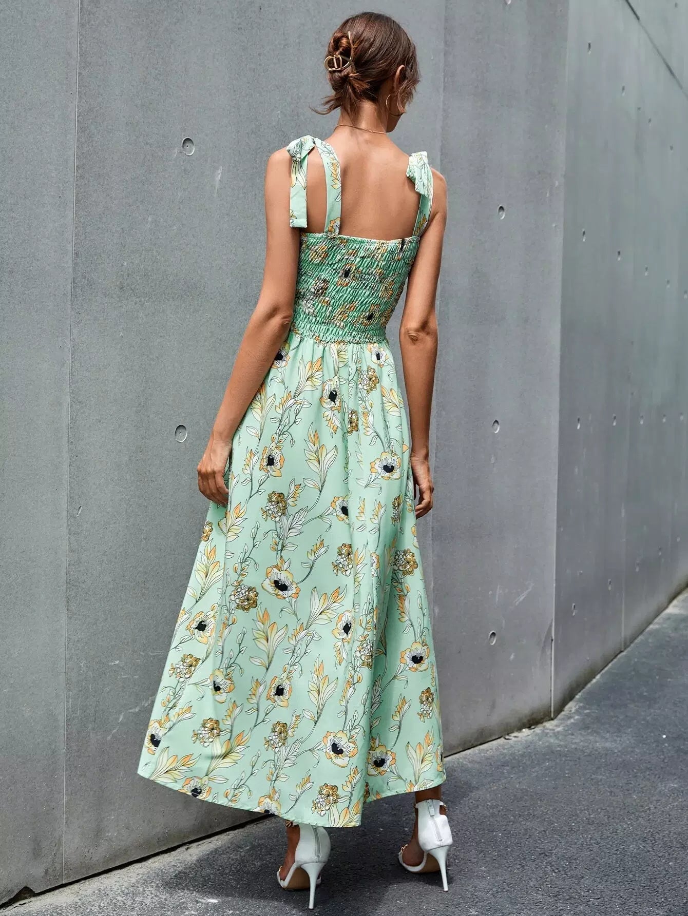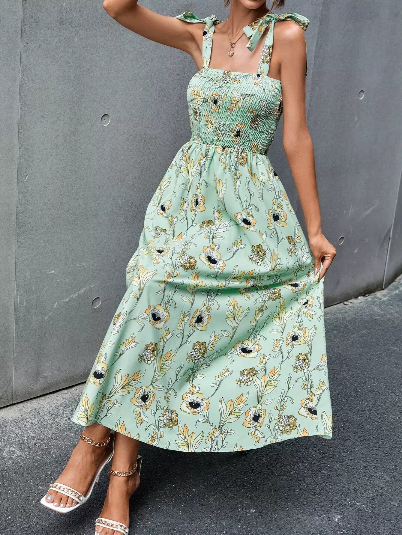 فستان كامي بطبعة زهور وحمالات عقدة وصدرية مكشكشة