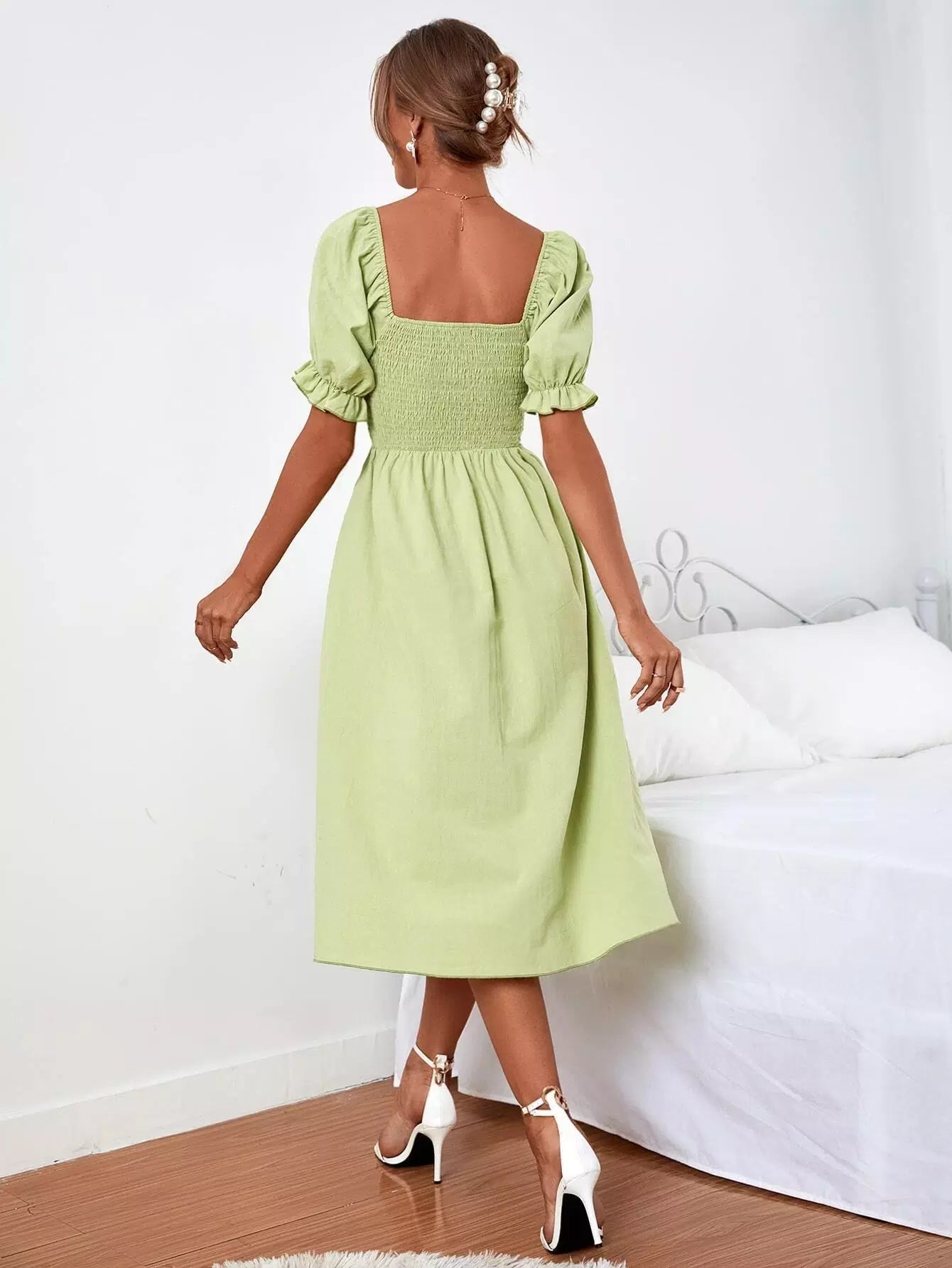 فستان بأكمام منفوشة بأكمام كشكش بتفاصيل منقسمة على الفخذين