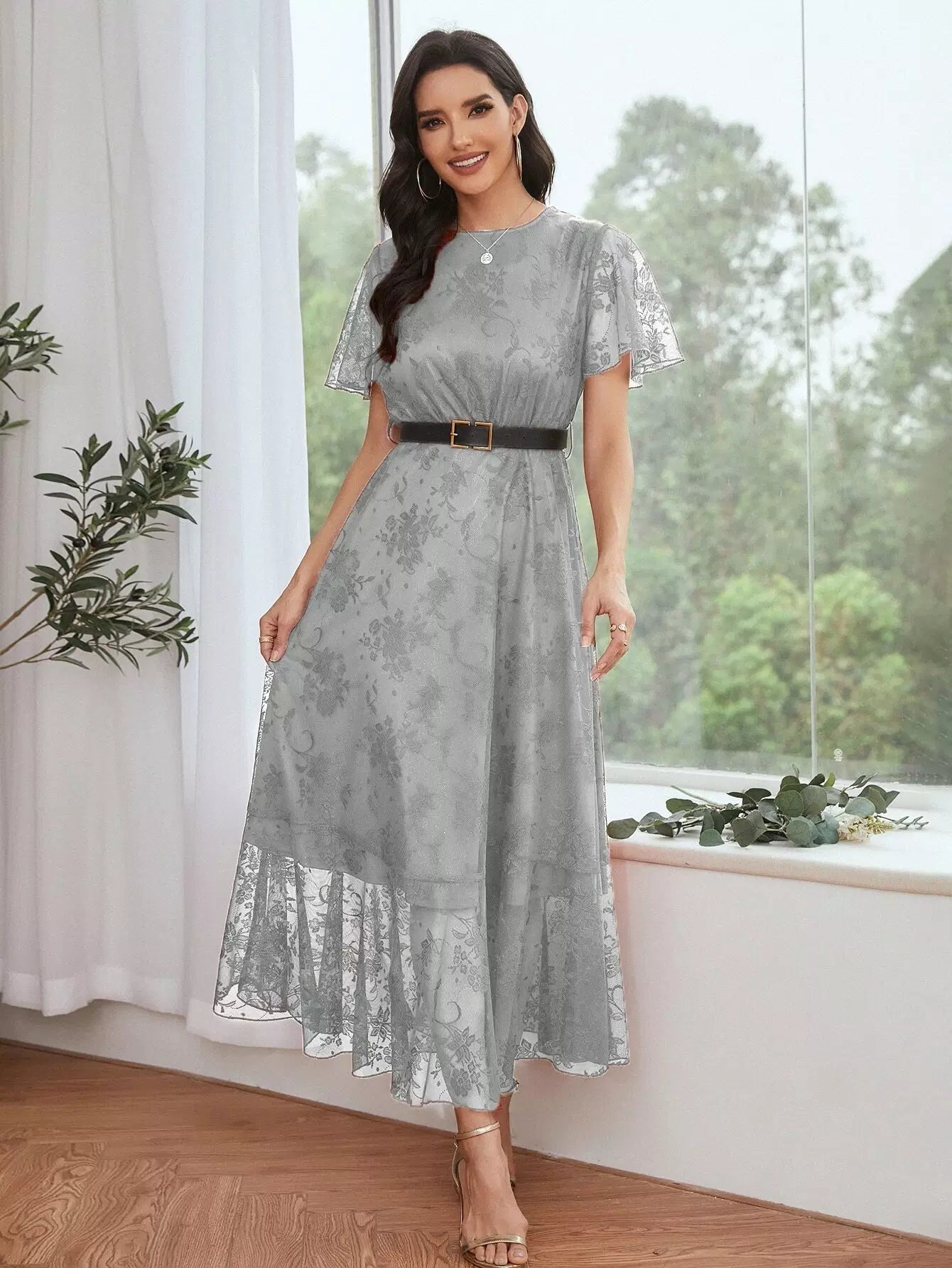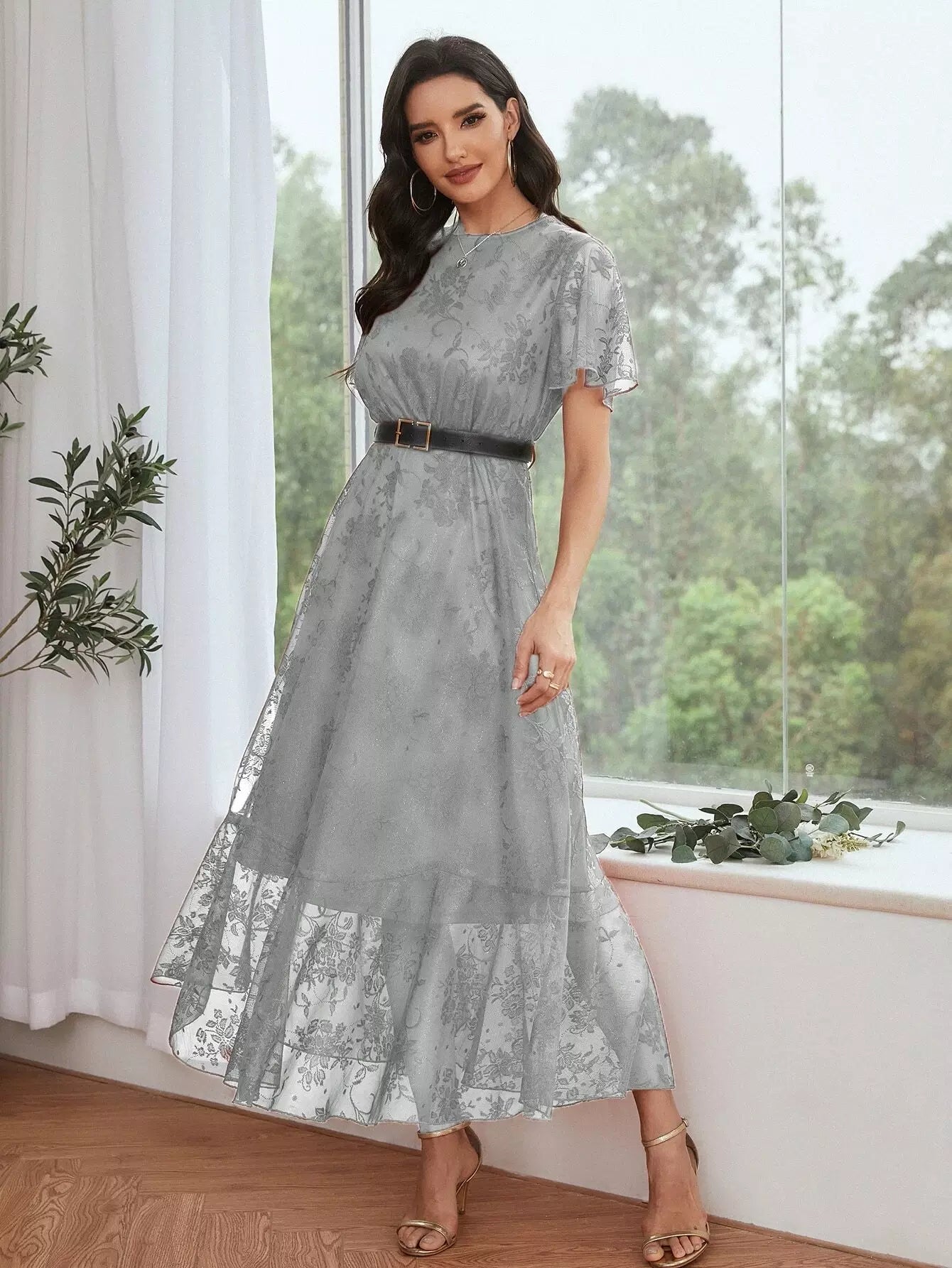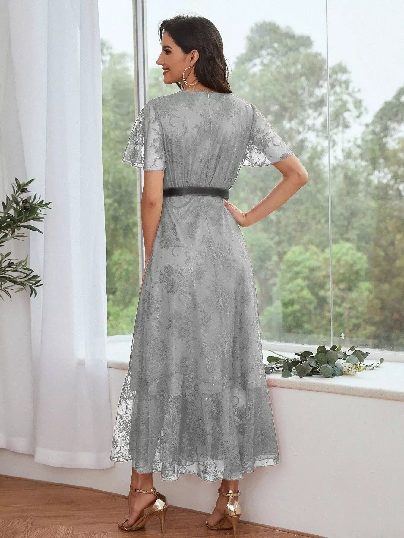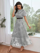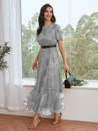 فستان حفلة موسيقية ماكسي بأكمام رفرفة وحاشية مكشكشة بدون حزام