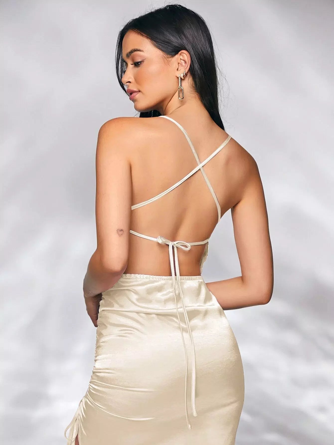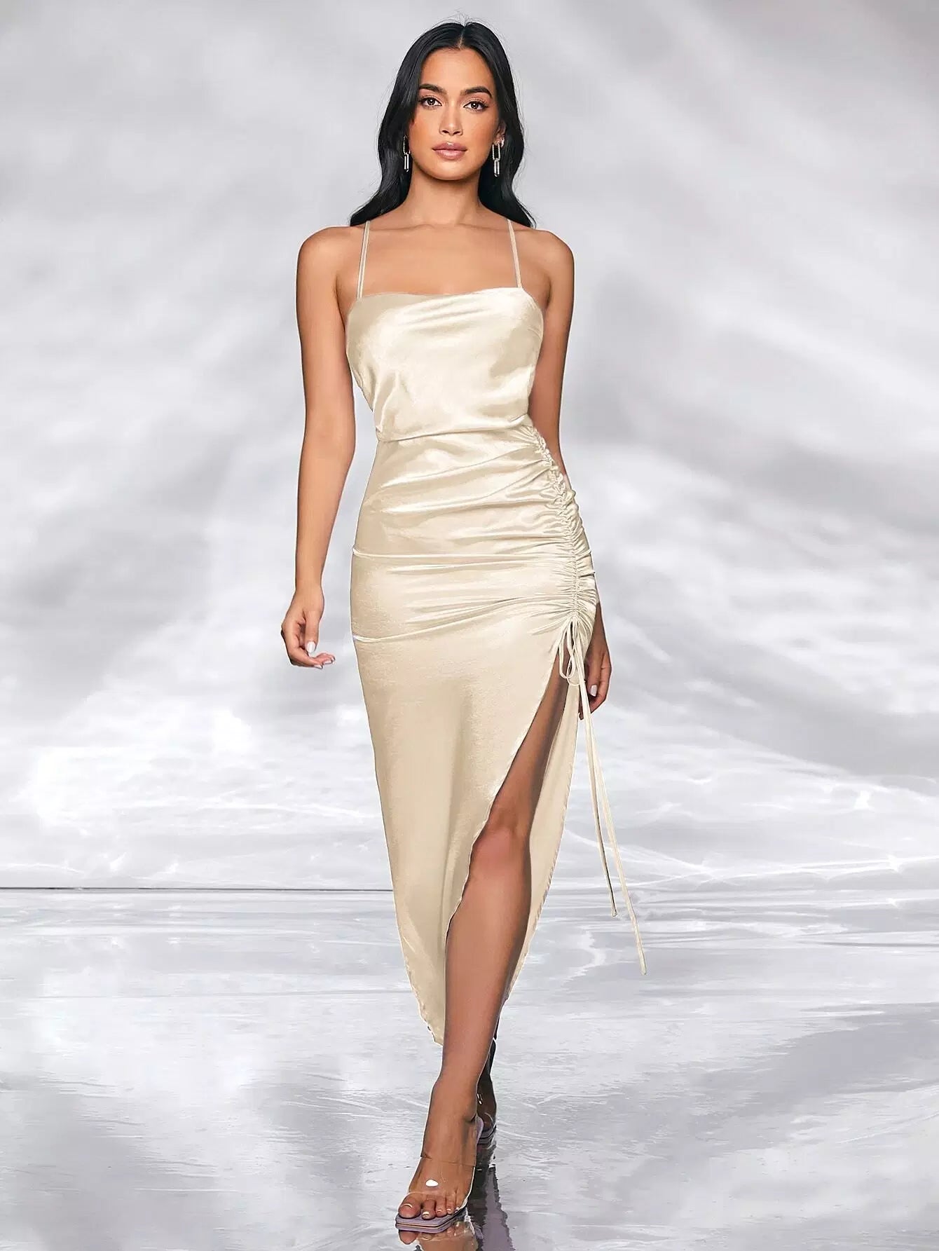 فستان كامي ساتان من الساتان المشقوق من الخلف بدون أربطة