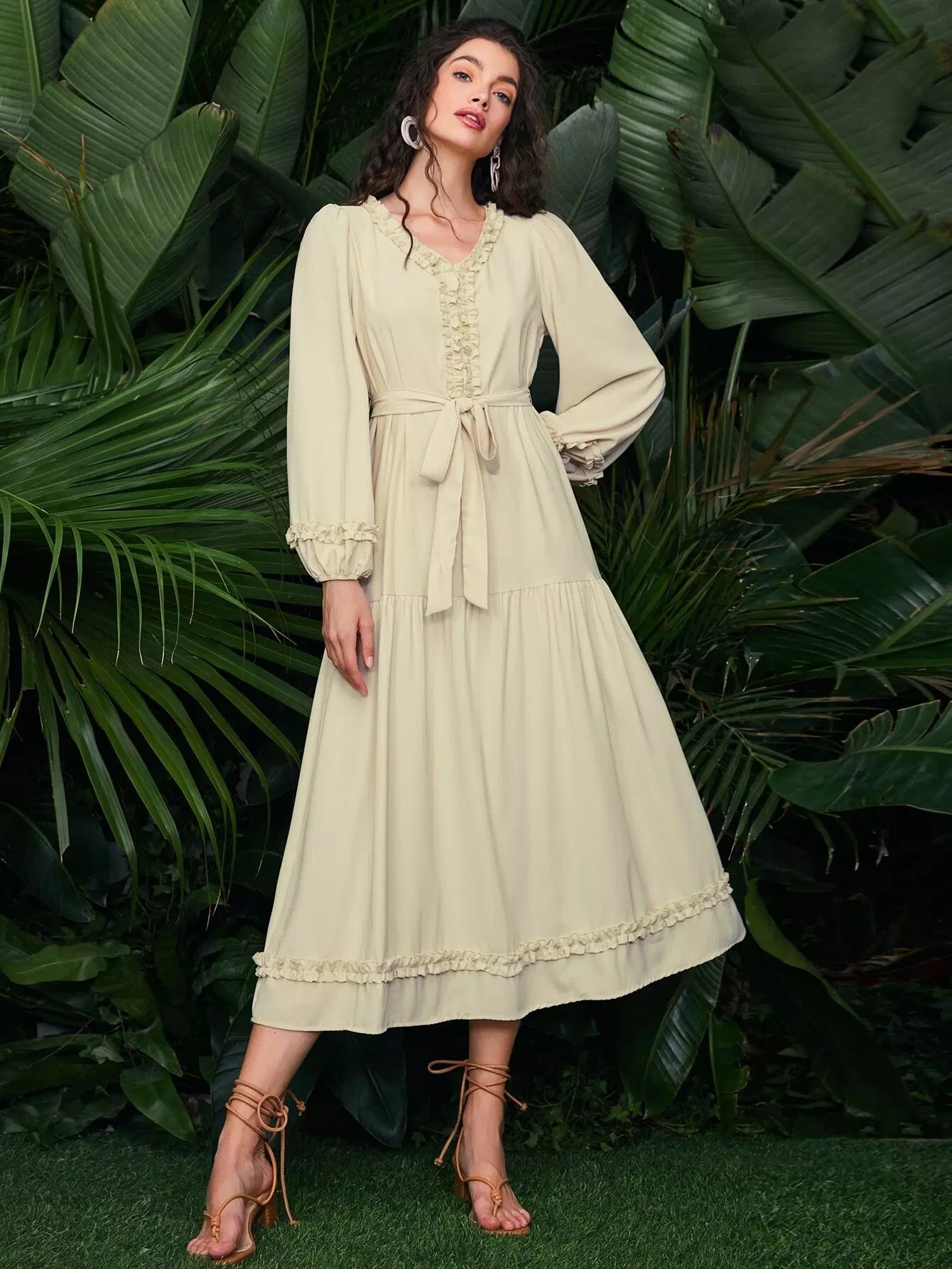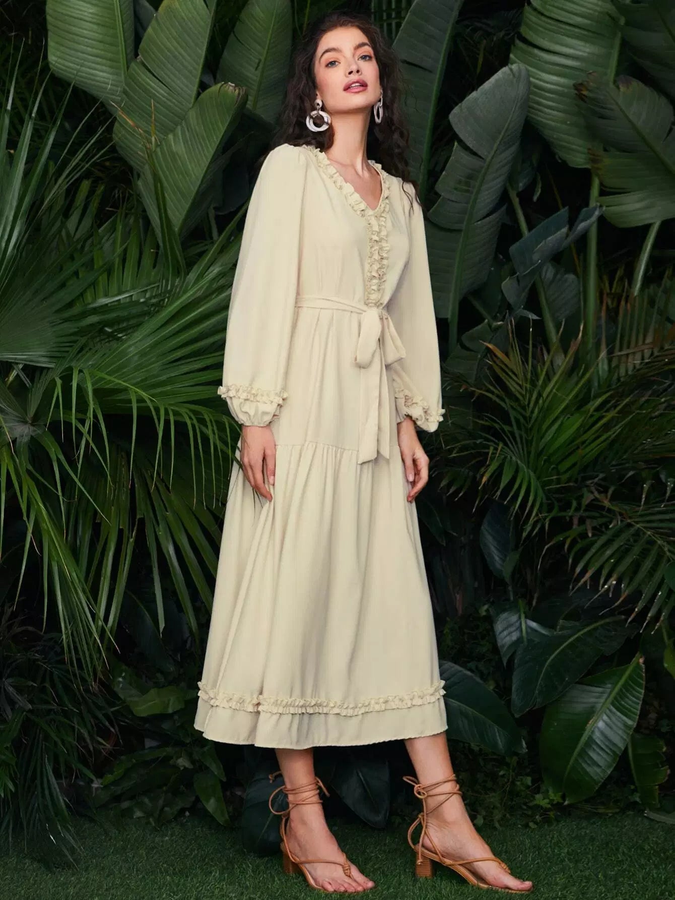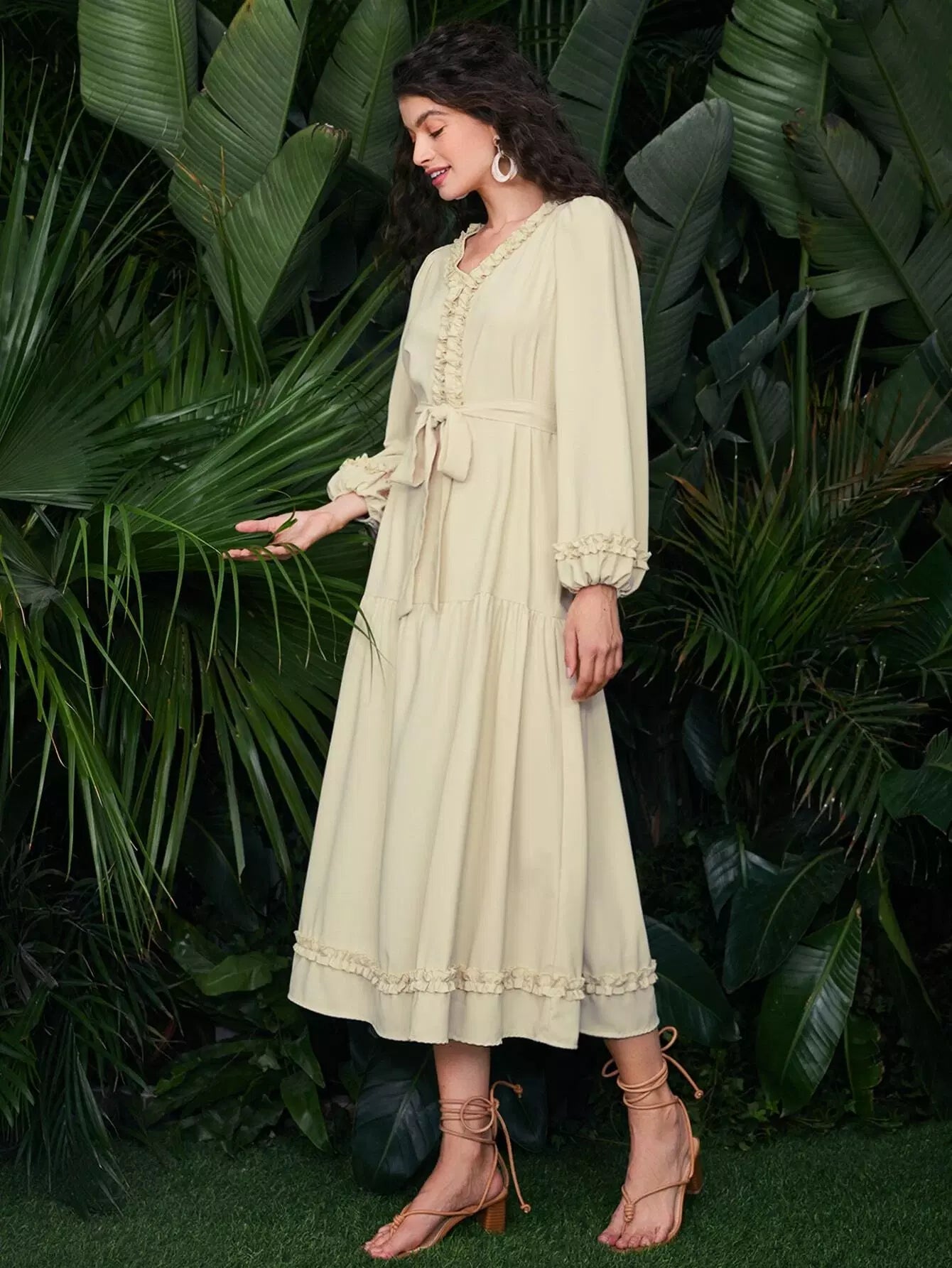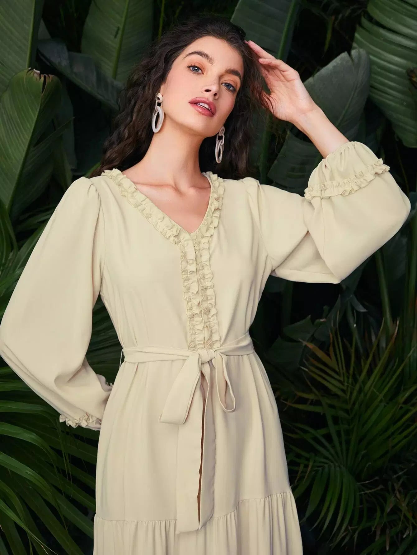 للنساء - فستان بحزام وأكمام واسعة وكشكشة