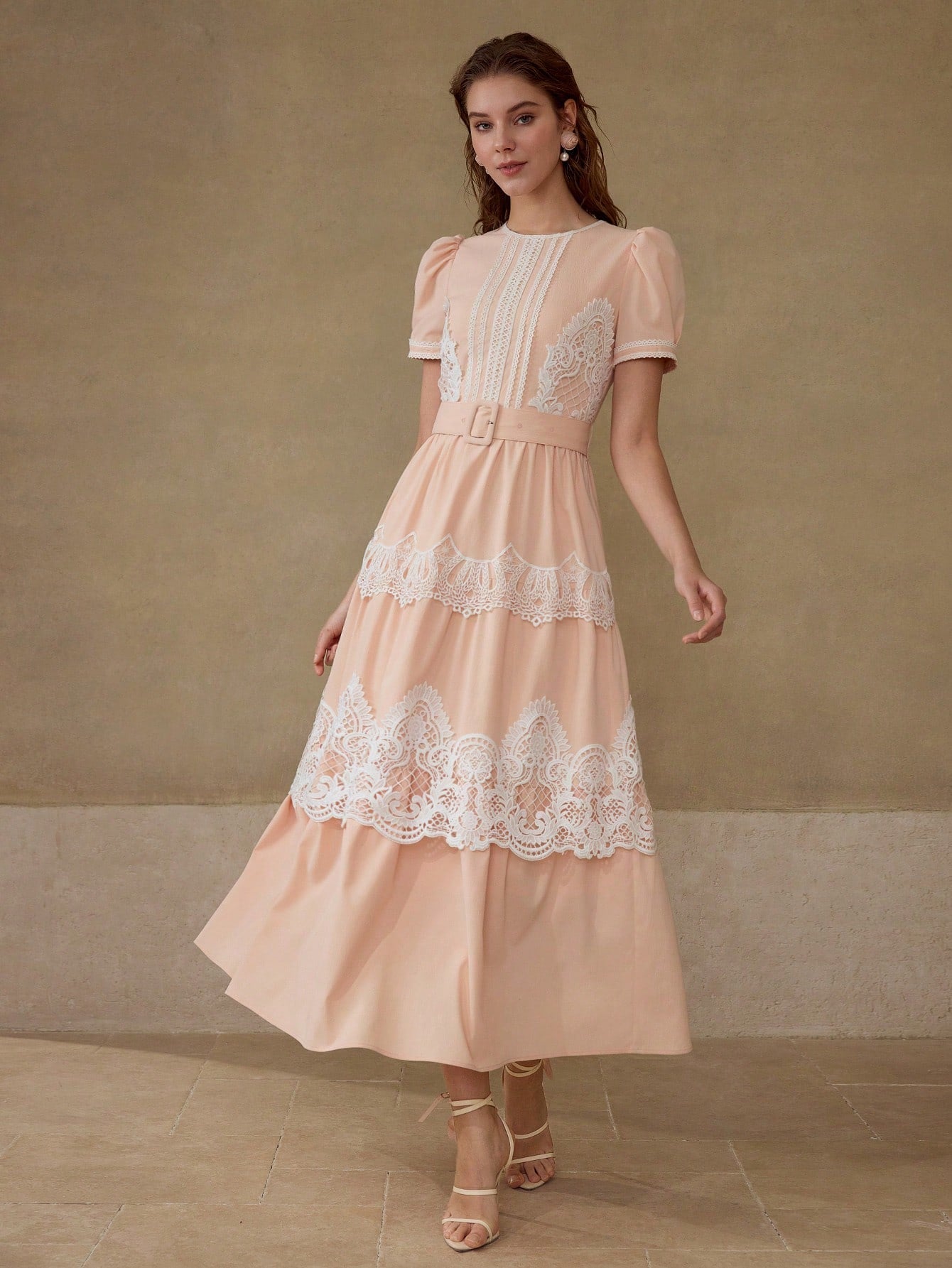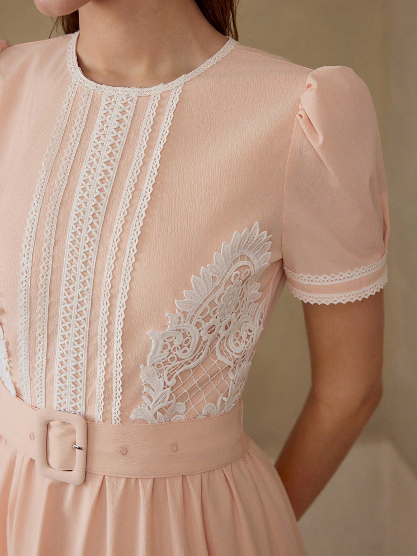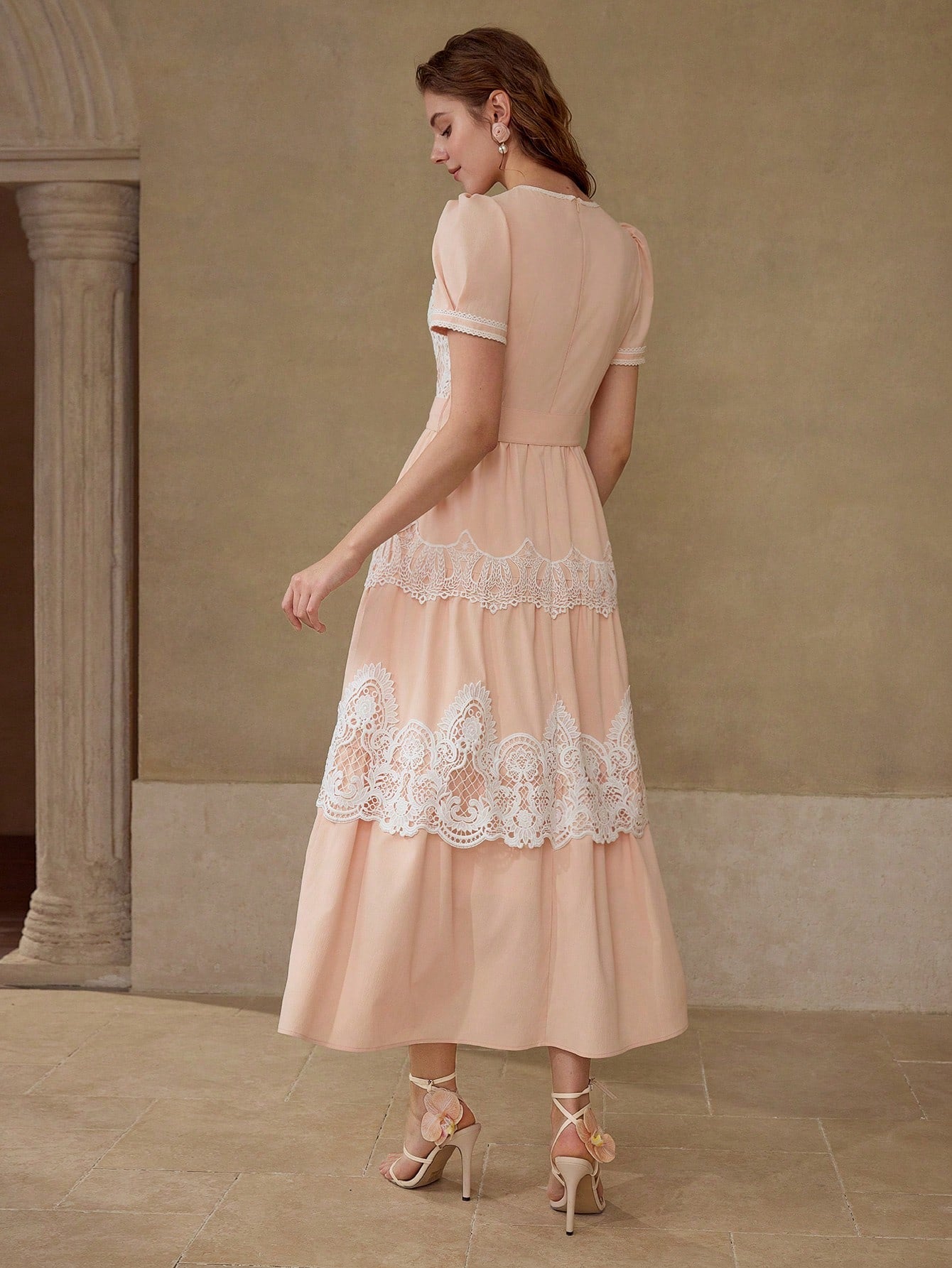 women MOTF CONTRAST LACE PUFF SLEEVE DRESS