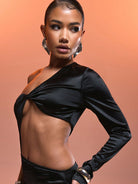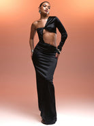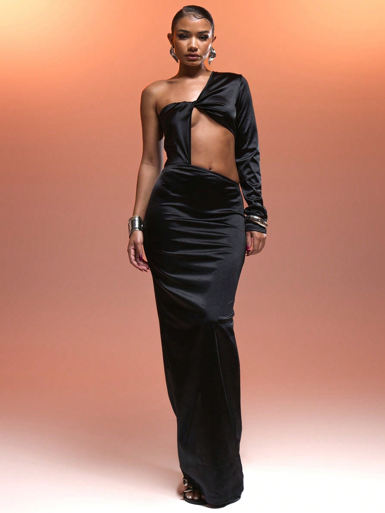 women MUSERA One Sleeve Cut Out Slinky Satin Twist Bust Fitted Maxi Dress Sexy Ibiza Fits Spring Summer Vacation Beach Elegant