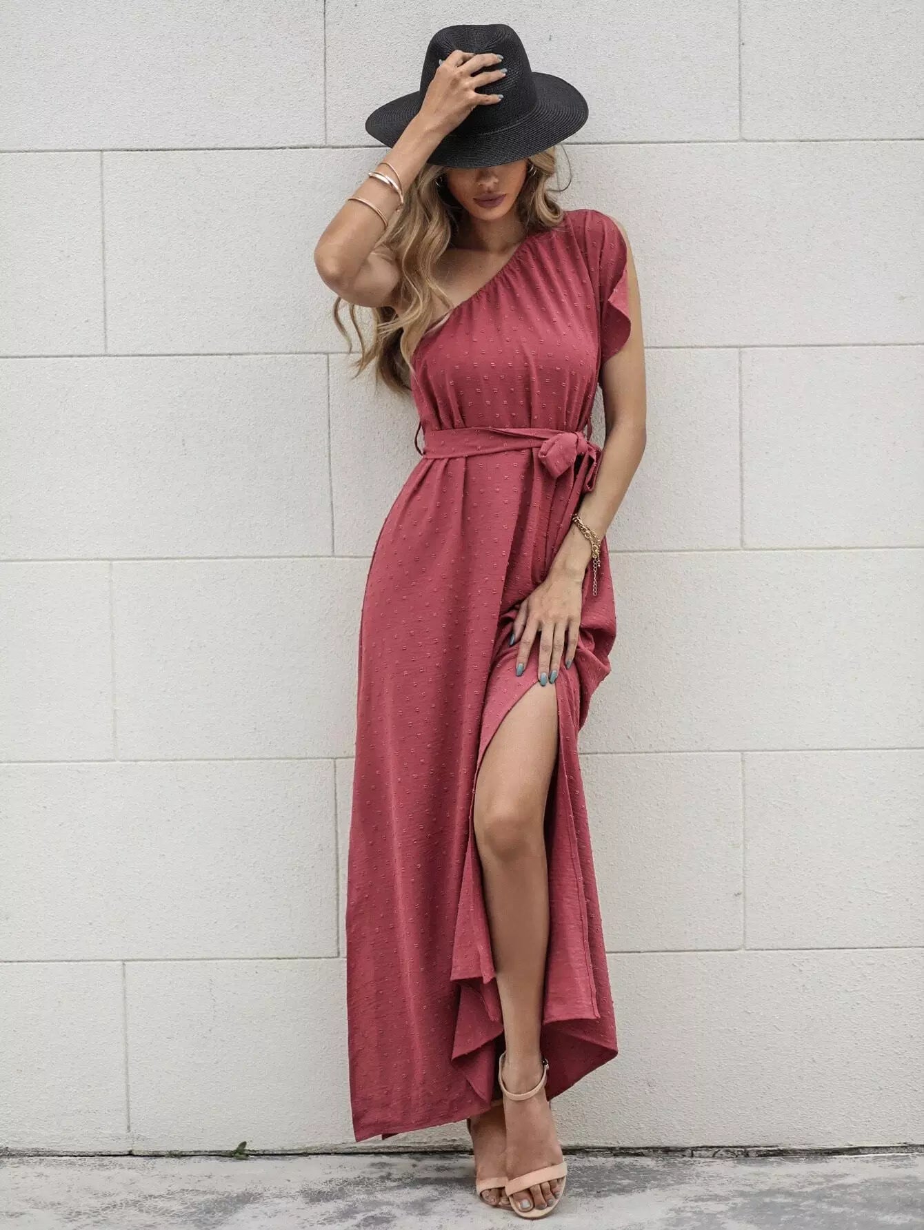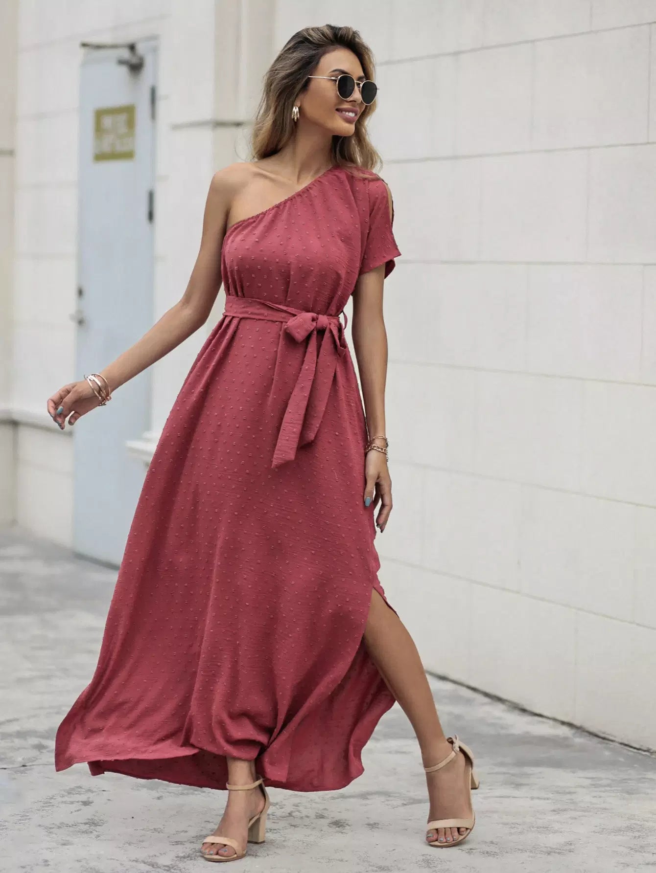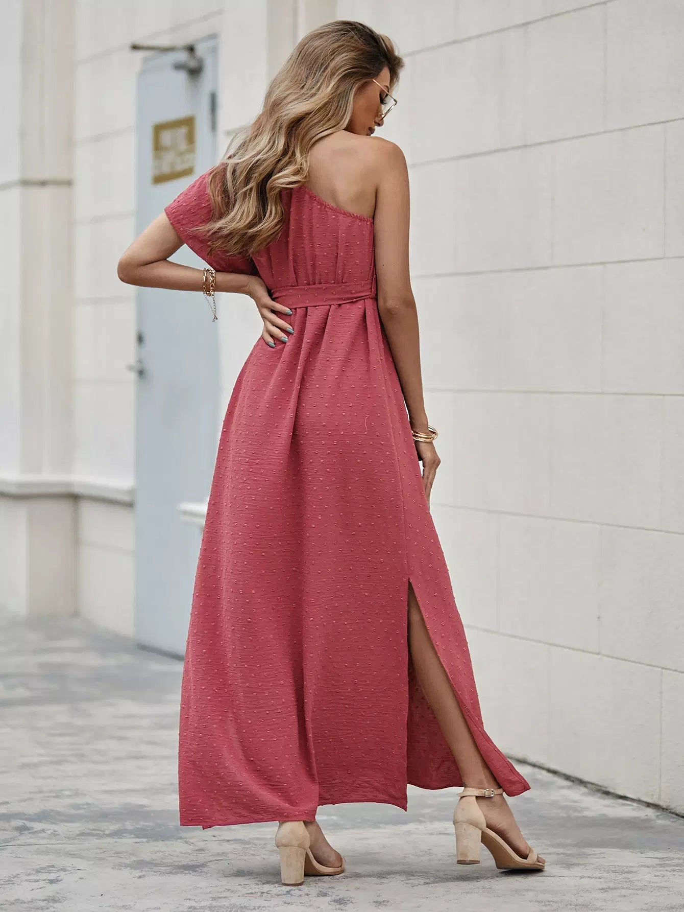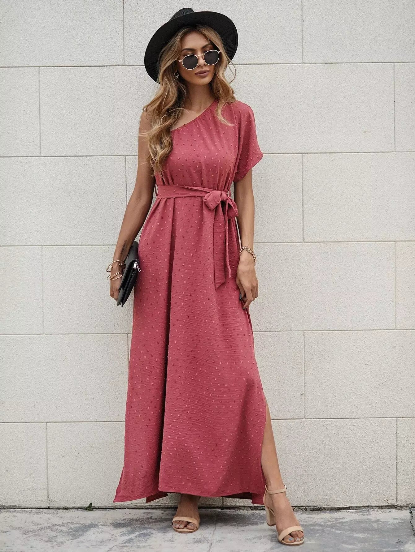فستان بحاشية مقسمة بكتف واحد بدون حزام