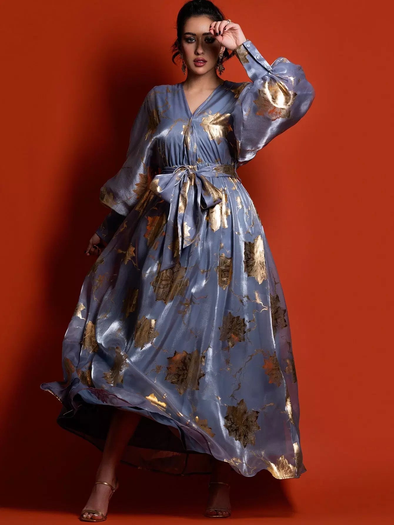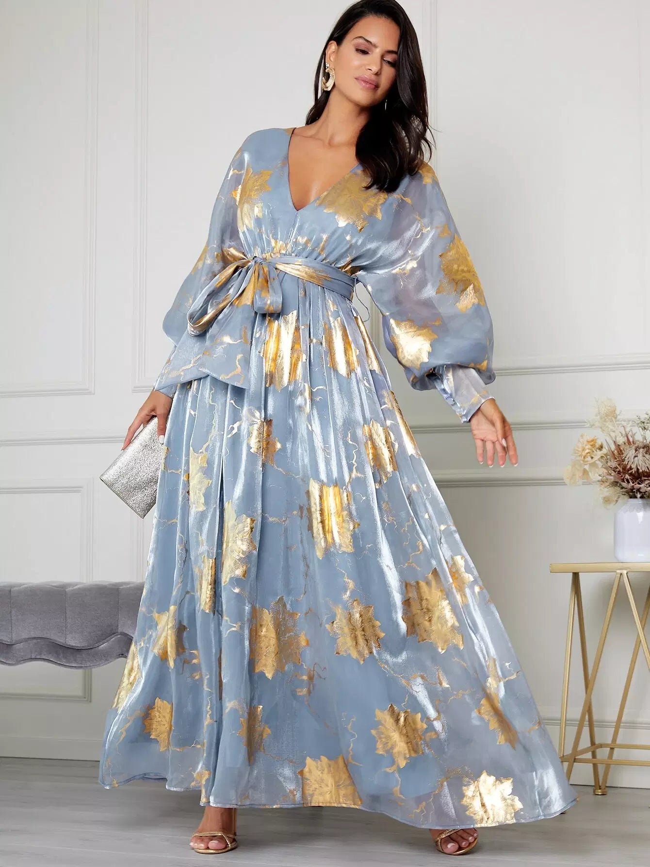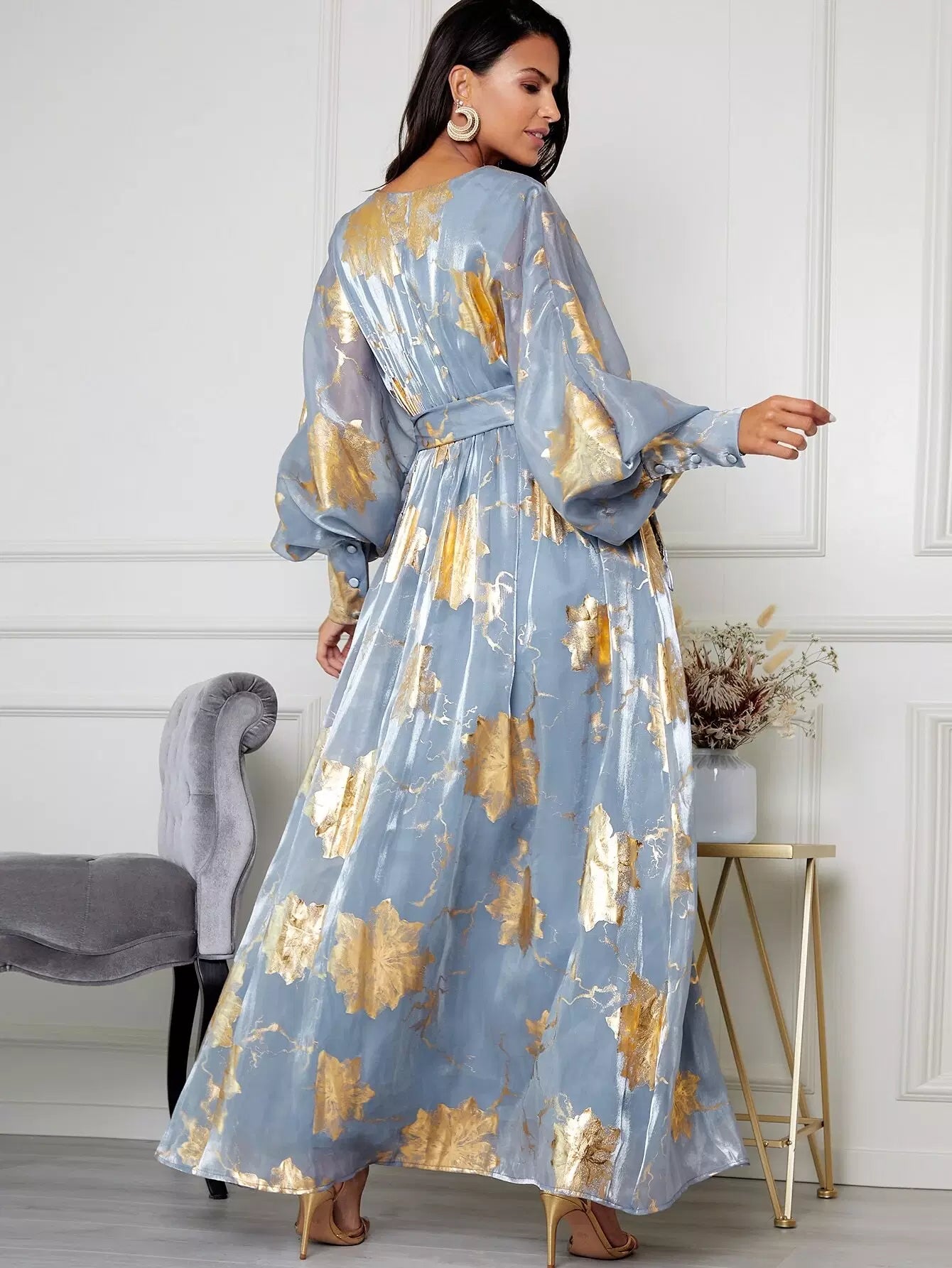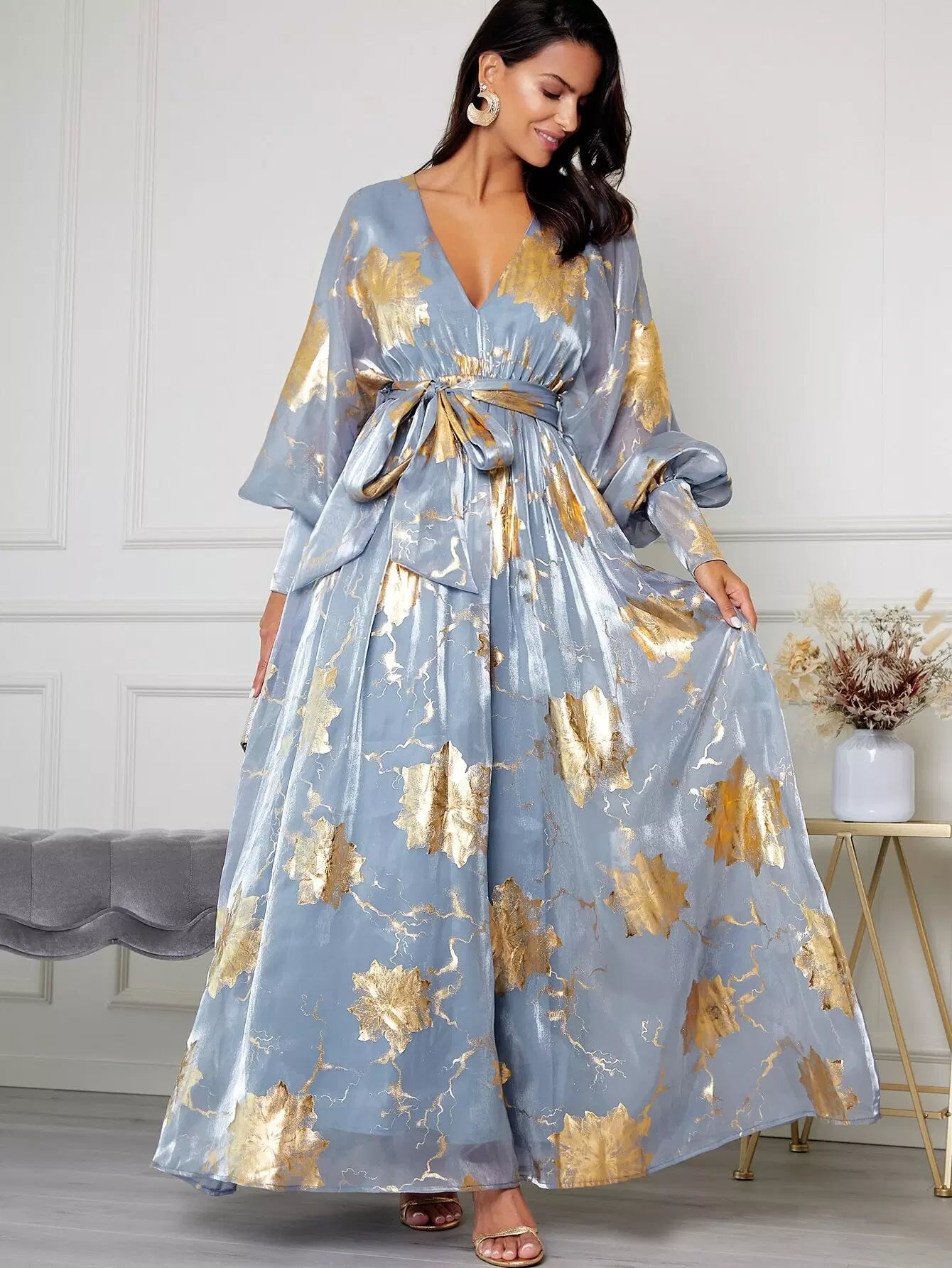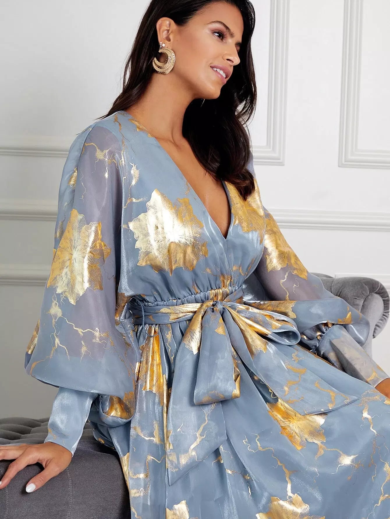 فستان من الأورجانزا الذهبي المزهر بأكمام واسعة ورقبة منخفضة