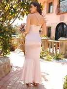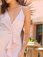 فستان من الساتان بحافة ذيل سمكة غير متناظرة من الكشكش من الأمام